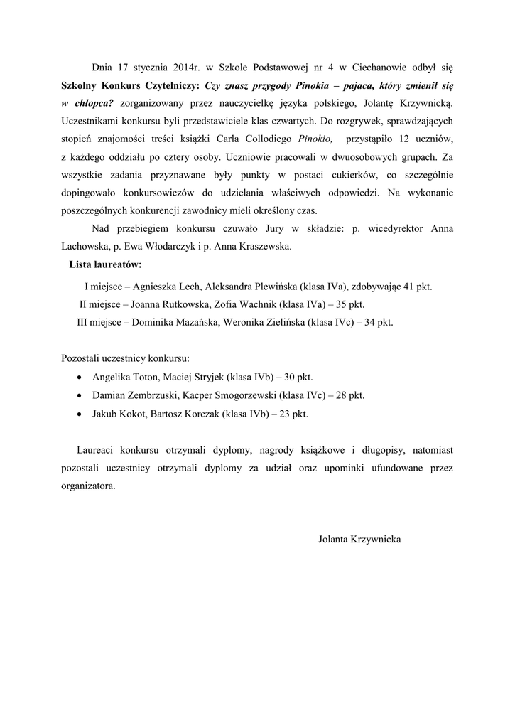 Dnia 17 stycznia 2014r. w Szkole Podstawowej nr 4 w Ciechanowie odbył się Szkolny Konkurs Czytelniczy: Czy znasz przygody Pinokia – pajaca, który zmienił się w chłopca? zorganizowany przez nauczycielkę języka polskiego, Jolantę Krzywnicką. Uczestnikami konkursu byli przedstawiciele klas czwartych. Do rozgrywek, sprawdzających stopień znajomości treści książki Carla Collodiego Pinokio, przystąpiło 12 uczniów, z każdego oddziału po cztery osoby. Uczniowie pracowali w dwuosobowych grupach. Za wszystkie zadania przyznawane były punkty w postaci cukierków, co szczególnie dopingowało konkursowiczów do udzielania właściwych odpowiedzi. Na wykonanie poszczególnych konkurencji zawodnicy mieli określony czas. Nad przebiegiem konkursu czuwało Jury w składzie: p. wicedyrektor Anna Lachowska, p. Ewa Włodarczyk i p. Anna Kraszewska. Lista laureatów: I miejsce – Agnieszka Lech, Aleksandra Plewińska (klasa IVa), zdobywając 41 pkt. II miejsce – Joanna Rutkowska, Zofia Wachnik (klasa IVa) – 35 pkt. III miejsce – Dominika Mazańska, Weronika Zielińska (klasa IVc) – 34 pkt. Pozostali uczestnicy konkursu: Angelika Toton, Maciej Stryjek (klasa IVb) – 30 pkt. Damian Zembrzuski, Kacper Smogorzewski (klasa IVc) – 28 pkt. Jakub Kokot, Bartosz Korczak (klasa IVb) – 23 pkt. Laureaci konkursu otrzymali dyplomy, nagrody książkowe i długopisy, natomiast pozostali uczestnicy otrzymali dyplomy za udział oraz upominki ufundowane przez organizatora. Jolanta Krzywnicka