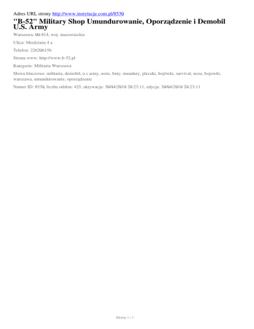 Adres URL strony http://www.instytucje.com.pl/8530 "B-52" Military Shop Umundurowanie, Oporządzenie i Demobil U.S. Army Warszawa, 00-814, woj. mazowieckie Ulica: Miedziana 4 a Telefon: 226206156 Strona www: http://www.b-52.pl Kategorie: Militaria Warszawa Słowa kluczowe: militaria, demobil, u s army, noże, buty, mundury, plecaki, bojówki, survival, noze, bojowki, warszawa, umundurowanie, oporządzenie Numer ID: 8530, liczba odsłon: 425, aktywacja: 30/04/2010 20:23:11, edycja: 30/04/2010 20:23:11 Strona 1 / 1