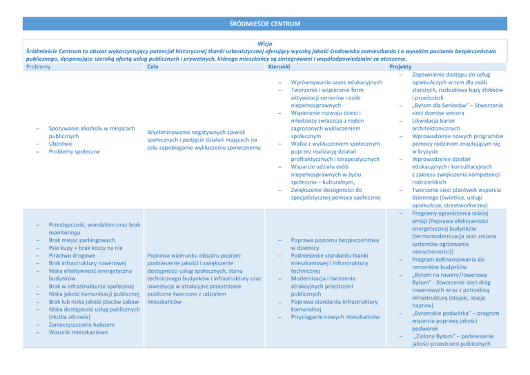 ŚRÓDMIEŚCIE CENTRUM Wizja Śródmieście Centrum to obszar wykorzystujący potencjał historycznej tkanki urbanistycznej oferujący wysoką jakość środowiska zamieszkania i o wysokim poziomie bezpieczeństwa publicznego, dysponujący szeroką ofertą usług publicznych i prywatnych, którego mieszkańcy są zintegrowani i współodpowiedzialni za otoczenie. Problemy Cele Kierunki Projekty ̶ Zapewnienie dostępu do usług ̶ Wyrównywanie szans edukacyjnych opiekuńczych w tym dla osób ̶ Tworzenie i wspieranie form starszych, rozbudowa bazy żłobków aktywizacji seniorów i osób i przedszkoli niepełnosprawnych ̶ „Bytom dla Seniorów” – Stworzenie ̶ Wspieranie rozwoju dzieci i sieci domów seniora młodzieży zwłaszcza z rodzin ̶ Likwidacja barier ̶ Spożywanie alkoholu w miejscach zagrożonych wykluczeniem architektonicznych Wyeliminowanie negatywnych zjawisk publicznych społecznym ̶ Wprowadzenie nowych programów społecznych i podjęcie działań mających na ̶ Ubóstwo ̶ Walka z wykluczeniem społecznym pomocy rodzinom znajdującym się celu zapobieganie wykluczeniu społecznemu ̶ Problemy społeczne poprzez realizację działań w kryzysie profilaktycznych i terapeutycznych ̶ Wprowadzenie działań ̶ Wsparcie udziału osób edukacyjnych i konsultacyjnych niepełnosprawnych w życiu z zakresu zwiększenia kompetencji społeczno – kulturalnym, rodzicielskich ̶ Zwiększenie dostępności do ̶ Tworzenie sieci placówek wsparcia specjalistycznej pomocy społecznej dziennego (świetlice, usługi opiekuńcze, streetworkerzey) ̶ Programy ograniczenia niskiej emisji (Poprawa efektywności ̶ Przestępczość, wandalizm oraz brak energetycznej budynków monitoringu (termomodernizacja oraz zmiana ̶ Brak miejsc parkingowych ̶ Poprawa poziomu bezpieczeństwa systemów ogrzewania ̶ Psie kupy + brak koszy na nie w dzielnicy nieruchomości)) ̶ Piractwo drogowe Poprawa wizerunku obszaru poprzez ̶ Podniesienie standardu tkanki ̶ Program dofinansowania do ̶ Brak infrastruktury rowerowej podniesienie jakości i zwiększenie mieszkaniowej i infrastruktury remontów budynków ̶ Niska efektywność energetyczna dostępności usług społecznych, stanu technicznej ̶ „Bytom na rowery/rowerowy budynków technicznego budynków i infrastruktury oraz ̶ Modernizacja i tworzenie Bytom” - Stworzenie sieci dróg ̶ Brak w infrastrukturze społecznej inwestycje w atrakcyjne przestrzenie atrakcyjnych przestrzeni rowerowych wraz z potrzebną ̶ Niska jakość komunikacji publicznej publiczne tworzone z udziałem publicznych infrastrukturą (stojaki, stacje ̶ Brak lub niska jakość placów zabaw mieszkańców ̶ Poprawa standardu infrastruktury napraw) ̶ Niska dostępność usług publicznych komunalnej ̶ „Bytomskie podwórka” – program (służba zdrowia) ̶ Przyciąganie nowych mieszkańców wsparcia poprawy jakości ̶ Zanieczyszczenie hałasem podwórek ̶ Warunki mieszkaniowe ̶ „Zielony Bytom” – podniesienie jakości przestrzeni publicznych ŚRÓDMIEŚCIE CENTRUM ̶ ̶ Wprowadzenie strefy uspokojonego ruchu Stworzenie kompleksowego systemu monitoringu Rozbudowa sieci ciepłowniczej „Mobilny Bytom” – poprawa jakości komunikacji publicznej, wprowadzenie stref uspokojonego ruchu i działania poprawiające bezpieczeństwo w ruchu drogowym „Razem lokalnie!” - Stworzenie punktów aktywności lokalnej z wykorzystaniem istniejącej infrastruktury Stworzenie sieci punktów usług społecznościowych Utworzenie rad dzielnic Promowanie inicjatyw lokalnych Poszerzenie oferty zajęć pozalekcyjnych Dostosowanie oferty kulturalnej do potrzeb obszaru Zamieszkaj w śródmieściu!” Program promocji zamieszkania w śródmieściu (mieszkania za remont, niższe czynsze dla meldujących się i np. pakiety „promocyjne” do instytucji kultury) ̶ ̶ ̶ Brak centrum aktywności lokalnej Brak oferty spędzania wolnego czasu Aktywność społeczna i obywatelska ̶ ̶ ̶ ̶ Wzmocnienie aktywności obywatelskiej mieszkańców i budowanie tożsamości lokalnej Tworzenie oferty spędzania czasu wolnego ze szczególnym uwzględnieniem potrzeb dzieci, młodzieży, osób starszych i wykluczonych społecznie Wzmocnienie aktywnego uczestnictwa mieszkańców obszaru w życiu miasta Wspieranie inicjatyw obywatelskich mieszkańców ̶ ̶ ̶ ̶ Bezrobocie Podniesienie aktywności zawodowej mieszkańców oraz dostosowanie oferty edukacyjnej do potrzeb rynku pracy ̶ ̶ Wspieranie aktywizacji zawodowej Wzmocnienie atrakcyjności inwestycyjnej obszaru Wspieranie rozwoju mikro, małych i średnich przedsiębiorstw oraz promocja samozatrudnienia ̶ ̶ ̶ ̶ ̶ ̶ ̶ ̶ Organizacja staży i praktyk zawodowych oraz kursów certyfikowanych Wprowadzenie systemu doradztwa zawodowego