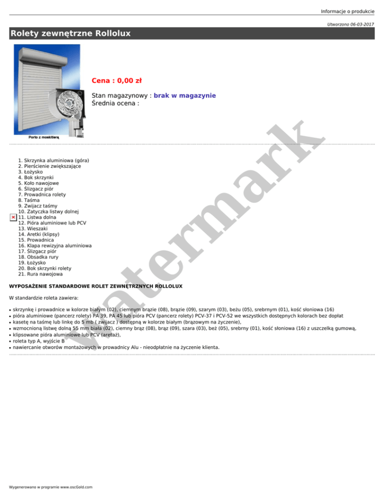 Informacje o produkcie Utworzono 06-03-2017 Rolety zewnętrzne Rollolux Cena : 0,00 zł 1. Skrzynka aluminiowa (góra) 2. Pierścienie zwiększające 3. Łożysko 4. Bok skrzynki 5. Koło nawojowe 6. Ślizgacz piór 7. Prowadnica rolety 8. Taśma 9. Zwijacz taśmy 10. Zatyczka listwy dolnej 11. Listwa dolna 12. Pióra aluminiowe lub PCV 13. Wieszaki 14. Aretki (klipsy) 15. Prowadnica 16. Klapa rewizyjna aluminiowa 17. Ślizgacz piór 18. Obsadka rury 19. Łożysko 20. Bok skrzynki rolety 21. Rura nawojowa er m ar k Stan magazynowy : brak w magazynie Średnia ocena : at WYPOSAŻENIE STANDARDOWE ROLET ZEWNĘTRZNYCH ROLLOLUX W standardzie roleta zawiera: ● ● ● ● ● ● skrzynkę i prowadnice w kolorze białym (02), ciemnym brązie (08), brązie (09), szarym (03), beżu (05), srebrnym (01), kość słoniowa (16) pióra aluminiowe (pancerz rolety) PA 39, PA 45 lub pióra PCV (pancerz rolety) PCV-37 i PCV-52 we wszystkich dostępnych kolorach bez dopłat kasetę na taśmę lub linkę do 5 mb ( zwijacz ) dostępną w kolorze białym (brązowym na życzenie), wzmocnioną listwę dolną 55 mm biała (02), ciemny brąz (08), brąz (09), szara (03), beż (05), srebrny (01), kość słoniowa (16) z uszczelką gumową, klipsowane pióra aluminiowe lub PCV (aretaż), roleta typ A, wyjście B nawiercanie otworów montażowych w prowadnicy Alu - nieodpłatnie na życzenie klienta. w ● Wygenerowano w programie www.oscGold.com