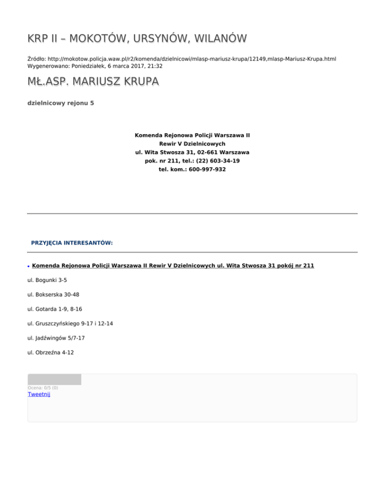 KRP II – MOKOTÓW, URSYNÓW, WILANÓW Źródło: http://mokotow.policja.waw.pl/r2/komenda/dzielnicowi/mlasp-mariusz-krupa/12149,mlasp-Mariusz-Krupa.html Wygenerowano: Poniedziałek, 6 marca 2017, 21:32 MŁ.ASP. MARIUSZ KRUPA dzielnicowy rejonu 5 Komenda Rejonowa Policji Warszawa II Rewir V Dzielnicowych ul. Wita Stwosza 31, 02-661 Warszawa pok. nr 211, tel.: (22) 603-34-19 tel. kom.: 600-997-932 PRZYJĘCIA INTERESANTÓW: ● Komenda Rejonowa Policji Warszawa II Rewir V Dzielnicowych ul. Wita Stwosza 31 pokój nr 211 ul. Bogunki 3-5 ul. Bokserska 30-48 ul. Gotarda 1-9, 8-16 ul. Gruszczyńskiego 9-17 i 12-14 ul. Jadźwingów 5/7-17 ul. Obrzeźna 4-12 Ocena: 0/5 (0) Tweetnij