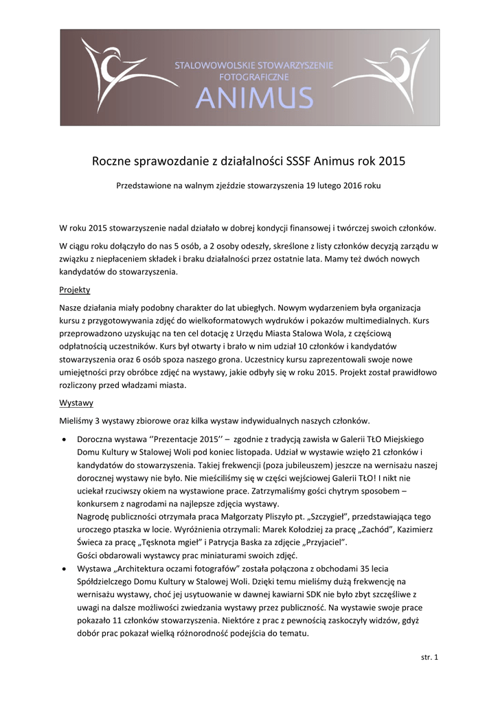 Roczne sprawozdanie z działalności SSSF Animus rok 2015 Przedstawione na walnym zjeździe stowarzyszenia 19 lutego 2016 roku W roku 2015 stowarzyszenie nadal działało w dobrej kondycji finansowej i twórczej swoich członków. W ciągu roku dołączyło do nas 5 osób, a 2 osoby odeszły, skreślone z listy członków decyzją zarządu w związku z niepłaceniem składek i braku działalności przez ostatnie lata. Mamy też dwóch nowych kandydatów do stowarzyszenia. Projekty Nasze działania miały podobny charakter do lat ubiegłych. Nowym wydarzeniem była organizacja kursu z przygotowywania zdjęć do wielkoformatowych wydruków i pokazów multimedialnych. Kurs przeprowadzono uzyskując na ten cel dotację z Urzędu Miasta Stalowa Wola, z częściową odpłatnością uczestników. Kurs był otwarty i brało w nim udział 10 członków i kandydatów stowarzyszenia oraz 6 osób spoza naszego grona. Uczestnicy kursu zaprezentowali swoje nowe umiejętności przy obróbce zdjęć na wystawy, jakie odbyły się w roku 2015. Projekt został prawidłowo rozliczony przed władzami miasta. Wystawy Mieliśmy 3 wystawy zbiorowe oraz kilka wystaw indywidualnych naszych członków. Doroczna wystawa ‘’Prezentacje 2015’’ – zgodnie z tradycją zawisła w Galerii TŁO Miejskiego Domu Kultury w Stalowej Woli pod koniec listopada. Udział w wystawie wzięło 21 członków i kandydatów do stowarzyszenia. Takiej frekwencji (poza jubileuszem) jeszcze na wernisażu naszej dorocznej wystawy nie było. Nie mieściliśmy się w części wejściowej Galerii TŁO! I nikt nie uciekał rzuciwszy okiem na wystawione prace. Zatrzymaliśmy gości chytrym sposobem – konkursem z nagrodami na najlepsze zdjęcia wystawy. Nagrodę publiczności otrzymała praca Małgorzaty Pliszyło pt. „Szczygieł”, przedstawiająca tego uroczego ptaszka w locie. Wyróżnienia otrzymali: Marek Kołodziej za pracę „Zachód”, Kazimierz Świeca za pracę „Tęsknota mgieł” i Patrycja Baska za zdjęcie „Przyjaciel”. Gości obdarowali wystawcy prac miniaturami swoich zdjęć. Wystawa „Architektura oczami fotografów” została połączona z obchodami 35 lecia Spółdzielczego Domu Kultury w Stalowej Woli. Dzięki temu mieliśmy dużą frekwencję na wernisażu wystawy, choć jej usytuowanie w dawnej kawiarni SDK nie było zbyt szczęśliwe z uwagi na dalsze możliwości zwiedzania wystawy przez publiczność. Na wystawie swoje prace pokazało 11 członków stowarzyszenia. Niektóre z prac z pewnością zaskoczyły widzów, gdyż dobór prac pokazał wielką różnorodność podejścia do tematu. str. 1 Po raz pierwszy wystawialiśmy swoje prace w Galerii Fotografii Miasta Rzeszowa. Przedstawiliśmy tam fragment wystawy „Prezentacje 2014”. Zarówno wernisaż, jak i sama wystawa zdobyły duże uznanie publiczności. Nasza nowa technika i prezentowanie zdjęć wielkoformatowych robią wrażenie. Wystawy indywidualne zaprezentowali w tym roku Maja i Krzysztof Celuchowie, Marta Krawczyk i Jan Wierzbicki. o Maja i Krzysztof Celuchowie przedstawili swoją nową wystawę „Przydrożne sacrum Lubelszczyzny” w Ratuszu Urzędu Miasta w Lublinie oraz w Muzeum Wikliniarstwa w Rudniku, a także dwa cykle tematyczne na wystawie w Galerii TŁO Miejskiego Domu Kultury w Stalowej Woli – „Biżuteria lodowa” i „Akwafotorele”. o Marta Krawczyk uświetniła swoją wystawą VIII Majówkę Historyczną „Miodosytnia Króla Jana” w Zawieprzycach oraz została zaproszona z autorską wystawą „Milczący świadkowie” do Kazimierza Dolnego na spotkania z kulturą żydowską – Pardes Festival 2015. o Jan Wierzbicki pokazał kilkadziesiąt swoich prac pod wspólnym tytułem „Fantasmagorie” w Galerii TŁO Miejskiego Domu Kultury w Stalowej Woli. Kilka osób prezentowało też swoje prace na wystawach zbiorowych innych organizacji fotograficznych. Między innymi wiele zdjęć pojawiło się na wystawie w Jarocinie, jako że kilkoro z nas brało udział w konkursie fotograficznym „Latające cuda natury”. Trofea członków Animusa. W minionym roku dwie osoby z nas zdobyły nagrody i wyróżnienia w konkursach fotograficznych. Mieczysław Wroński został wyróżniony za 3 swoje prace pod wspólnym tytułem „Kształtowanie stali” w konkursie “Międzynarodowej fotografii przemysłowej i industrialnej – FOTO PEIN 9” Mateusz Kołodziej uzyskał 3 miejsce w krajowym konkursie „Latające cuda natury” organizowanym przez Centrum Edukacji Ekologicznej w Jarocinie za przepiękne zdjęcie myszołowów. Dodatkowo swój dorobek prezentowali Maja i Krzysztof Celuchowie na organizowanych w kilku miejscach spotkaniach autorskich, gdzie promowali swój album „Gmina Bojanów rzeką i puszczą bogata” wydany pod koniec roku 2014. Działalność szkoleniowa Już trzeci rok prowadzimy klub fotograficzny w CEE Jarocin. Klub prowadzi nadal Marian Rogowski i jak wiemy od dyrekcji CEE współpraca układa się bez zarzutu. Władze stowarzyszenia Wszystkie ciała wybieralne stowarzyszenia przetrwały w niezmienionym składzie od poprzedniego walnego zjazdu. Sprawy organizacyjne Nasze spotkania odbywały się z zaplanowaną częstotliwością w Miejskiej Bibliotece w Stalowej Woli. Zarząd w ostatnim miesiącu podpisał przedłużenie umowy nieodpłatnego użyczenia tego lokalu stowarzyszeniu na kolejne dwa lata. str. 2 Nawiązaliśmy ponownie współpracę ze Spółdzielczym Domem Kultury w Stalowej Woli. Po zmianie kierownictwa tej placówki, znów jesteśmy w niej mile widzianymi gośćmi. Strona internetowa, którą mamy już od ponad dwóch lat ma się nadal dobrze, liczba odwiedzin jest duża na tyle, że nie musimy pozycjonować strony w inny sposób. Nadal jednak problemem jest brak zainteresowania redagowaniem strony przez większość z nas. Nie możemy w tej kwestii polegać tylko na jednej osobie. Patrycja Baska została wybrana do Zarządu, a Jan Wierzbicki do Rady Organizacji Pozarządowych Powiatu S