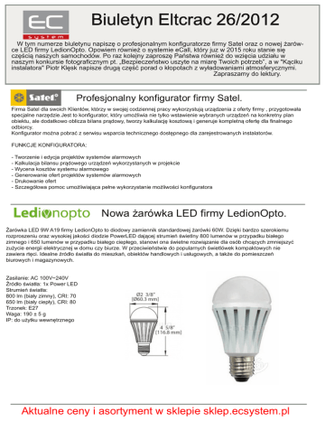 Biuletyn Eltcrac 26/2012 W tym numerze biuletynu napiszę o profesjonalnym konfiguratorze firmy Satel oraz o nowej żarów ce LED firmy LedionOpto. Opowiem również o systemie eCall, który juz w 2015 roku stanie się częścią naszych samochodów. Po raz kolejny zaproszę Państwa również do wzięcia udziału w naszym konkursie fotograficznym pt. „Bezpieczeństwo uszyte na miarę Twoich potrzeb”, a w "Kąciku instalatora" Piotr Klęsk napisze drugą część porad o kłopotach z wyładowaniami atmosferycznymi. Zapraszamy do lektury. Profesjonalny konfigurator firmy Satel. Firma Satel dla swoich Klientów, którzy w swojej codziennej pracy wykorzystują urządzenia z oferty firmy , przygotowała specjalne narzędzie.Jest to konfigurator, który umożliwia nie tylko wstawienie wybranych urządzeń na konkretny plan obiektu, ale dodatkowo oblicza bilans prądowy, tworzy kalkulację kosztową i generuje kompletną ofertę dla finalnego odbiorcy. Konfigurator można pobrać z serwisu wsparcia technicznego dostępnego dla zarejestrowanych instalatorów. FUNKCJE KONFIGURATORA: Tworzenie i edycja projektów systemów alarmowych Kalkulacja bilansu prądowego urządzeń wykorzystanych w projekcie Wycena kosztów systemu alarmowego Generowanie ofert projektów systemów alarmowych Drukowanie ofert Szczegółowa pomoc umożliwiająca pełne wykorzystanie możliwości konfiguratora Nowa żarówka LED firmy LedionOpto. Żarówka LED 9W A19 firmy LedionOpto to diodowy zamiennik standardowej żarówki 60W. Dzięki bardzo szerokiemu rozproszeniu oraz wysokiej jakości diodzie PowerLED dającej strumień świetlny 800 lumenów w przypadku białego zimnego i 650 lumenów w przypadku białego ciepłego, stanowi ona świetne rozwiązanie dla osób chcących zmniejszyć zużycie energii elektrycznej w domu czy biurze. W przeciwieństwie do popularnych świetlówek kompaktowych nie zawiera rtęci. Idealne źródło światła do mieszkań, obiektów handlowych i usługowych, a także do pomieszczeń biurowych i magazynowych. Zasilanie: AC 100V~240V Źródło światła: 1x Power LED Strumień światła: 800 lm (biały zimny), CRI: 70 650 lm (biały ciepły), CRI: 80 Trzonek: E27 Waga: 190 ± 5 g IP: do użytku wewnętrznego Aktualne ceny i asortyment w sklepie sklep.ecsystem.pl System eCall juz od 2015 roku! Ogólnoeuropejski system szybkiego powiadamiania o wypadkach drogowych eCall jest związany z inicjatywą „eSafety”, która jest częścią kompleksowej strategii Komisji Europejskiej, zmierzającej do zachowania bezpieczeństwa na drogach i poprawy efektywności transportu w Europie. Parlament przyjął właśnie rezolucję wzywającą do uczynienia z przepisów dotyczących eCall obligatoryjnego prawa. Komisja Europejska chce, by od roku 2015 każdy nowy samo chód był wyposażony w eCall, który automatycznie wezwie pomoc w razie wypadku. System ma być instalowany rów nież w motocyklach i ciężarówkach. Eurourzędnicy oceniają przy tym, że eCall uratuje życie 2500 osób rocznie. EU ocenia, że koszty eCall wyniosą 100 euro na każdy samochód. W Unii jeździ 250 milionów samochodów, co oznacza, że koszt wprowadzenia takiego systemu wyniesie 25 miliardów euro. Koszty uratowania życia jednej osoby mogą za tem iść w miliony, tym bardziej, że zwykle przy każdym wypadku są jacyś świadkowie, którzy dzwonią po pomoc. Nie wykluczone, że po przymusowym wprowadzeniu eCall osoby postronne będą mniej skłonne wezwać pomoc, uznając, iż już została ona wezwana. Istnieją również obawy dotyczące prywatności. eCall musi znać bieżącą lokalizację pojaz du. Dlatego też członkowie Parlamentu zastrzegają, że system nie może być wykorzystywany do śledzenia pojazdu dopóki nie bierze on udziału w wypadku. Z obowiązkowego systemu eCall będą też chcieli skorzystać ubezpieczyciele. Już w tej chwili oferują oni obniżki cen polis w zamian za zgodę na śledzenie samochodu. Dzięki temu wiedzą, czy przestrzegamy przepisów, nie wykonujemy ryzykownych manewrów, co pozwala na lepszą ocenę ryzyka. Gdy gotowy do śledzenia system znajdzie się obowiązkowo w każdym samochodzie kierowcy z pewnością znacznie częściej będą korzystali z możliwości obniżenia ceny polisy i zgadzali się na śledzenie samochodu. kopalniawiedzy.pl atzonline.com in2soft.de elektroonline.pl KONKURS „Bezpieczeństwo uszyte na miarę Twoich potrzeb” konkurs fotograficzny. Zapraszamy Państwa do konkursu na najlepsze zdjęcie roku 2012. Hasło przewodnie tego konkursu to „Bezpieczeństwo uszyte na miarę Twoich potrzeb”. Czekamy na zdjęcia, w których zaprezentują Państwo swoją wizję bezpieczeństwa. Fotografie pojawią się w kalendarzu Eltcrac System na rok 2013, a każde z nich zostanie opatrzone imieniem i nazwiskiem autora oraz nazwą firmy, którą reprezentuje. Celem konkursu jest stworzenie kalendarza z dwunastoma wyróżnionymi fotografiami oraz jego bezpłatna dystrybucja wśród Klientów Eltcrac System. Termin: prace konkursowe można nadsyłać pod adres [email protected] do 31 października 2012 r. ZAPRASZAMY! Kącik instalatora Tydzień temu pisałem o wyładowaniu atmosferycznym które uszkodziło płytę centrali CA64. Teraz opiszę jak postępować w takich wypadkach i jakie kroki przedsięwziąć aby zabezpieczyć się przed nadmiarem pracy który spotkał klienta.Ważną sprawą jest tworzenie kopii zapasowej. Każdy z nas o tym wie.Ale niestety w wypadku centrali CA64 i późniejszym odtworzeniu jej danych na nowej płycie Integry 64 to nie wystarczy. Aby łatwo przenieść dane trzeba spełnić dwa warunki: 1. musimy mieć dostęp do płyty CA64 poprzez RS232 online ale wtedy możemy też wgrać ustawienia z zapisanych wcześniej danych... lub 2. musimy mieć stworzoną kopię ustawień centrali CA64 ale z menu programu dload64 > komunikacja > kopia centrali > zapis. Tak stworzoną wcześniej kopię możemy wczytać do programy dloadx i wszystkie us