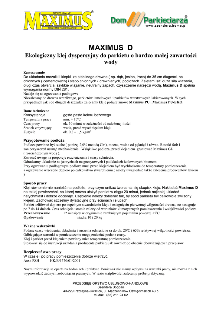 MAXIMUS D Ekologiczny klej dyspersyjny do parkietu o bardzo małej zawartości wody Zastosowanie Do układania mozaiki i klepki ze stabilnego drewna ( np. dąb, jesion, iroco) do 35 cm długości, na chłonnych ( cementowych) i słabo chłonnych ( drewnianych) podłożach. Zaletami są: duża siła wiązania, długi czas otwarcia, szybkie wiązanie, neutralny zapach, czyszczenie narzędzi wodą. Maximus D spełnia wymagania normy DIN 281. Nadaje się na ogrzewanie podłogowe. Niezalecany do drewna wrażliwego, parkietów lamelowych i parkietów warstwowych lakierowanych. W tych przypadkach jak i do długich deszczułek zalecamy kleje poliuretanowe Maximus PU i Maximus PU-EKO. Dane techniczne Konsystencja Temperatura pracy Czas pracy Środek zmywający Zużycie gęsta pasta koloru beżowego min. + 150C ok. 30 minut w zależności od nałożonej ilości woda, przed wyschnięciem kleju ok. 0,8 – 1,5 kg/m2 Przygotowanie podłoża Podłoże powinno być suche ( poniżej 2,0% metodą CM), mocne, wolne od pęknięć i równe. Resztki farb i zanieczyszczeń usunąć mechanicznie. Wsiąkliwe podłoża, przed klejeniem gruntować Maximus GD ( rozcieńczonym wodą ). Zwracać uwagę na proporcje rozcieńczania i czasy schnięcia. Odradzamy układanie na jastrychach magnezytowych i podkładach izolowanych bitumem. Przy ogrzewaniu podłogowym podłoże musi przed klejeniem być wychłodzone do temperatury pomieszczenia, a ogrzewanie włączone dopiero po całkowitym stwardnieniu.( należy uwzględnić także zalecenia producentów lakieru ) Sposób pracy Klej równomiernie nanieść na podłoże, przy czym unikać tworzenia się skupisk kleju. Nakładać Maximus D na takiej powierzchni, na której można ułożyć parkiet w ciągu 20 minut, jednak najlepiej układać natychmiast i dobrze docisnąć. Uzębienie należy dobierać tak, by spód parkietu był całkowicie zwilżony klejem. Zachować szczeliny dylatacyjne przy ścianach i słupach. Parkiet szlifować dopiero po zupełnym stwardnieniu kleju i osiągnięciu pierwotnej wilgotności drewna, co następuje po 7 do 14 dniach. Czas schnięcia istotnie zależy od warunków klimatycznych pomieszczenia i wsiąkliwości podłoża. Przechowywanie 12 miesięcy w oryginalnie zamkniętym pojemniku powyżej +50C Opakowanie wiadra 10 i 20 kg Ważne wskazówki Podane czasy wietrzenia, układania i suszenia odniesione są do ok. 200C i 65% relatywnej wilgotności powietrza. Odbiegające warunki w pomieszczeniu mogą zmieniać podane czasy. Klej i parkiet przed klejeniem powinny mieć temperaturę pomieszczenia. Stosować się do instrukcji układania producenta parkietu jak również do obecnie obowiązujących przepisów. Bezpieczeństwo pracy W czasie i po pracy pomieszczenia dobrze wietrzyć. Atest PZH HK/B/1570/01/2001 Nasze informacje są oparte na badaniach i praktyce. Ponieważ nie mamy wpływu na warunki pracy, nie można z nich wyprowadzić żadnych zobowiązań prawnych. W razie wątpliwości zalecamy próbę praktyczną. PRZEDSIĘBIORSTWO USŁUGOWO-HANDLOWE Szendera Bogdan 43-229 Pszczyna-Ćwiklice, ul. Męczenników Oświęcimskich 43 b tel./fax.: (32) 211 24 62