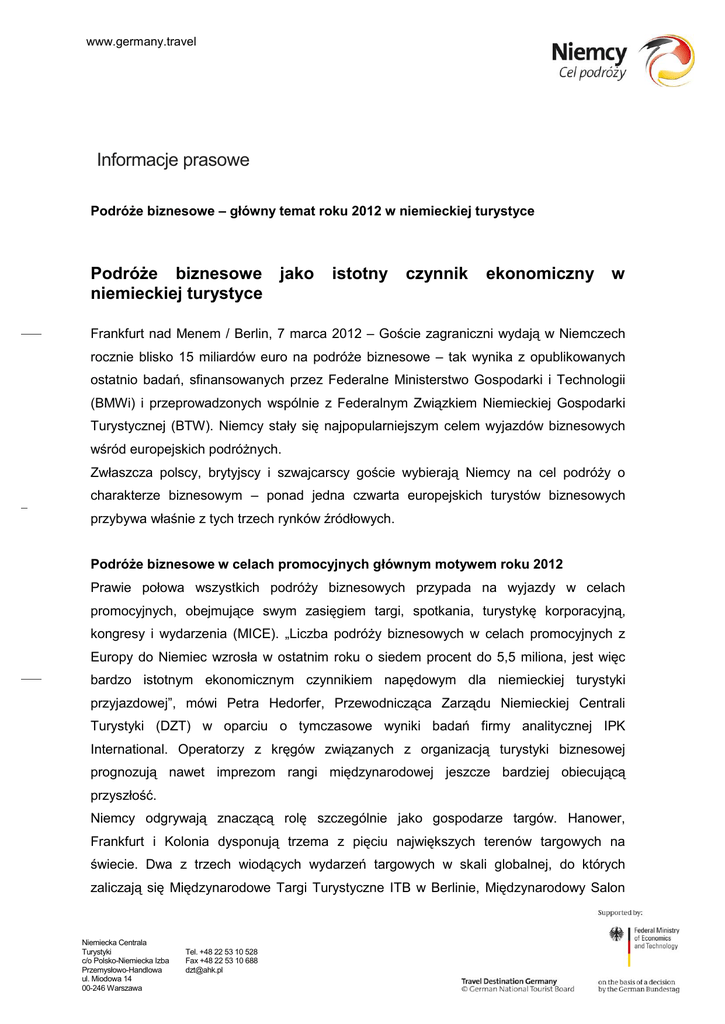 www.germany.travel Informacje prasowe Podróże biznesowe – główny temat roku 2012 w niemieckiej turystyce Podróże biznesowe niemieckiej turystyce jako istotny czynnik ekonomiczny w Frankfurt nad Menem / Berlin, 7 marca 2012 – Goście zagraniczni wydają w Niemczech rocznie blisko 15 miliardów euro na podróże biznesowe – tak wynika z opublikowanych ostatnio badań, sfinansowanych przez Federalne Ministerstwo Gospodarki i Technologii (BMWi) i przeprowadzonych wspólnie z Federalnym Związkiem Niemieckiej Gospodarki Turystycznej (BTW). Niemcy stały się najpopularniejszym celem wyjazdów biznesowych wśród europejskich podróżnych. Zwłaszcza polscy, brytyjscy i szwajcarscy goście wybierają Niemcy na cel podróży o charakterze biznesowym – ponad jedna czwarta europejskich turystów biznesowych przybywa właśnie z tych trzech rynków źródłowych. Podróże biznesowe w celach promocyjnych głównym motywem roku 2012 Prawie połowa wszystkich podróży biznesowych przypada na wyjazdy w celach promocyjnych, obejmujące swym zasięgiem targi, spotkania, turystykę korporacyjną, kongresy i wydarzenia (MICE). „Liczba podróży biznesowych w celach promocyjnych z Europy do Niemiec wzrosła w ostatnim roku o siedem procent do 5,5 miliona, jest więc bardzo istotnym ekonomicznym czynnikiem napędowym dla niemieckiej turystyki przyjazdowej”, mówi Petra Hedorfer, Przewodnicząca Zarządu Niemieckiej Centrali Turystyki (DZT) w oparciu o tymczasowe wyniki badań firmy analitycznej IPK International. Operatorzy z kręgów związanych z organizacją turystyki biznesowej prognozują nawet imprezom rangi międzynarodowej jeszcze bardziej obiecującą przyszłość. Niemcy odgrywają znaczącą rolę szczególnie jako gospodarze targów. Hanower, Frankfurt i Kolonia dysponują trzema z pięciu największych terenów targowych na świecie. Dwa z trzech wiodących wydarzeń targowych w skali globalnej, do których zaliczają się Międzynarodowe Targi Turystyczne ITB w Berlinie, Międzynarodowy Salon Niemiecka Centrala Turystyki c/o Polsko-Niemiecka Izba Przemysłowo-Handlowa ul. Miodowa 14 00-246 Warszawa Tel. +48 22 53 10 528 Fax +48 22 53 10 688 [email protected] www.germany.travel Samochodowy IAA we Frankfurcie oraz targi informatyczne oprogramowania, sprzętu komputerowego i nowych technologii CEBIT w Hanowerze, odbywają się w Niemczech. „Niemcy jako cel podróży biznesowych – Targi i kongresy” głównym tematem roku turystycznego 2012 Dla DZT rok 2012 stoi całkowicie pod znakiem podróży biznesowych w celach promocyjnych. Wspólnie z German Convention Bureau (GCB) Centrala będzie prowadzić kampanię na rzecz tego segmentu turystyki na perspektywicznych rynkach o dużym znaczeniu – jak Chiny, Brazylia czy Rosja. Jako najważniejsze narzędzie komunikacji Centrala zaprojektowała również zupełnie nową stronę internetową, dostępną teraz w wielu językach. Pod adresem www.germany.travel/geschaeftsreisen zainteresowani mogą uzyskać opracowane w kooperacji z Komisją Wystaw i Targów Niemieckiej Gospodarki (AUMA) informacje na temat znajdujących się w Niemczech obiektów targowych o znaczeniu międzynarodowym oraz organizacji na terenie Niemiec spotkań, kongresów i imprez korporacyjnych w ścisłej współpracy z GCB. Oprócz filmów prezentujących wizerunek kraju i broszury „Nachhaltig erfolgreich” („Efektywne zrównoważenie”) DZT utworzyła wspólnie z GCB specjalne programy „Hosted Buyer” („Profesjonalny kupujący”) i „Educational Trips” („Wyjazdy edukacyjne”) w celu promowania tej tematyki. Ponadto w tym roku będzie prowadzić szeroko zakrojone kampanie prasowe. W segmencie MICE są planowane imprezy dla klientów w Nowym Jorku, Szanghaju, Brukseli i Londynie oraz na dziesięciu innych, ważnych rynkach. Od dziesięciu lat Niemcy są gospodarzem czołowych międzynarodowych targów w branży turystyki biznesowej IMEX. Wspólnie z GCB i innymi partnerami niemieckimi Centrala prezentuje decydentom w różnych krajach Niemcy jako lokalizację MICE podczas targów EIBTM w Barcelonie i IMEX w Ameryce w ramach programu targów zagranicznych BMWi i AUMA. Niemcy czołowym miejscem międzynarodowych kongresów W rankingu International Congress & Convention Associatio (ICCA) Niemcy znajdują się na pierwszej pozycji w Europie jako miejsce kongresów – i to po raz siódmy z rzędu. Na świecie pod tym względem Niemcy zajmują drugie miejsce – tylko w Stanach Niemiecka Centrala Turystyki c/o Polsko-Niemiecka Izba Przemysłowo-Handlowa ul. Miodowa 14 00-246 Warszawa Tel. +48 22 53 10 528 Fax +48 22 53 10 688 [email protected] www.germany.travel Zjednoczonych odbywa się więcej kongresów rangi międzynarodowej. Szczególną popularnością Niemcy cieszą się jako cel MICE na obiecujących rynkach azjatyckich – tu kraj plasuje się na pierwszym miejscu wśród najważniejszych europejskich celów turystycznych. Wysokie standardy i drugie miejsce na świecie Znakomita infrastruktura, bezpieczeństwo, doskonałe kwalifikacje personelu obsługi, wspaniale rozwinięta sieć komunikacyjna i zrównoważenie ekologiczne są mocnymi stronami Niemiec jako pożądanego celu podróży biznesowych. Według „The Travel & Tourism Competetiveness Report, World Economic Forum 2011” Niemcy znajdują się na drugim miejscu za Szwajcarią wśród 139 krajów z całego świata. Kolejnymi istotnymi zaletami, ugruntowującymi wysoką pozycję Niemiec są optymalny stosunek ceny do jakości świadczonych usług i szeroka paleta hoteli kongresowych, centrów konferencyjnych i miejsc organizacji wydarzeń na wysokim poziomie. Ponadto niemieccy przedstawiciele branży wyróżniają się sporą siłą innowacyjności i są liderami na polu „zielonych” spotkań i zrównoważonego rozwoju. Ogółem według badań Europejskiego Instytutu Gospodarki Kongresowej (EITW) aktualnie istnieje 6 420 ośrodków kongresowych i miejsc organizacji imprez bizn