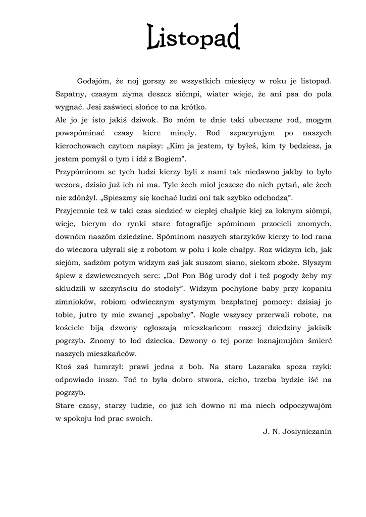 Godajóm, że noj gorszy ze wszystkich miesięcy w roku je listopad. Szpatny, czasym ziyma deszcz siómpi, wiater wieje, że ani psa do pola wygnać. Jesi zaświeci słońce to na krótko. Ale jo je isto jakiś dziwok. Bo móm te dnie taki ubeczane rod, mogym powspóminać czasy kiere minęły. Rod szpacyrujym po naszych kierochowach czytom napisy: „Kim ja jestem, ty byłeś, kim ty będziesz, ja jestem pomyśl o tym i idź z Bogiem”. Przypóminom se tych ludzi kierzy byli z nami tak niedawno jakby to było wczora, dzisio już ich ni ma. Tyle żech mioł jeszcze do nich pytań, ale żech nie zdónżył. „Spieszmy się kochać ludzi oni tak szybko odchodzą”. Przyjemnie też w taki czas siedzieć w ciepłej chałpie kiej za łoknym siómpi, wieje, bierym do rynki stare fotografije spóminom przocieli znomych, downóm naszóm dziedzine. Spóminom naszych starzyków kierzy to łod rana do wieczora użyrali się z robotom w polu i kole chałpy. Roz widzym ich, jak siejóm, sadzóm potym widzym zaś jak suszom siano, siekom zboże. Słyszym śpiew z dzwiewczncych serc: „Doł Pon Bóg urody doł i też pogody żeby my skludzili w szczyńsciu do stodoły”. Widzym pochylone baby przy kopaniu zimnioków, robiom odwiecznym systymym bezpłatnej pomocy: dzisiaj jo tobie, jutro ty mie zwanej „spobaby”. Nogle wszyscy przerwali robote, na kościele biją dzwony ogłoszają mieszkańcom naszej dziedziny jakisik pogrzyb. Znomy to łod dziecka. Dzwony o tej porze łoznajmujóm śmierć naszych mieszkańców. Ktoś zaś łumrzył: prawi jedna z bob. Na staro Lazaraka spoza rzyki: odpowiado inszo. Toć to była dobro stwora, cicho, trzeba bydzie iść na pogrzyb. Stare czasy, starzy ludzie, co już ich downo ni ma niech odpoczywajóm w spokoju łod prac swoich. J. N. Josiyniczanin