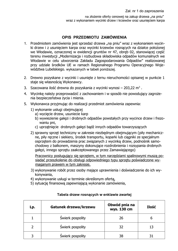 Zał. nr 1 do zaproszenia na złożenie oferty cenowej na zakup drzewa „na pniu” wraz z wykonaniem wycinki drzew i krzewów oraz usunięciem karpa OPIS PRZEDMIOTU ZAMÓWIENIA 1. Przedmiotem zamówienia jest sprzedaż drzewa „na pniu” wraz z wykonaniem wycinki drzew i z usunięciem karpa oraz wycinki krzewów rosnących na działce położonej we Włodawie, oznaczonej w ewidencji gruntów nr 47, obręb 02, stanowiącej część terenu inwestycji „Modernizacja i rozbudowa składowiska odpadów komunalnych we Włodawie w celu utworzenia Zakładu Zagospodarowania Odpadów” realizowanej przy udziale środków UE w ramach Regionalnego Programu Operacyjnego Województwa Lubelskiego. wykazanych w tabeli poniższej. 2. Drewno pozyskane z wycinki i usunięte z ternu nieruchomości opisanej w punkcie 1 staje się własnością Wykonawcy. 3. Szacowana ilość drewna do pozyskania z wycinki wynosi – 203,22 m 3 . 4. Wycinkę należy przeprowadzić z zachowaniem i w sposób nie powodujący zagrożenia bezpieczeństwa życia i mienia. 5. Wykonawca przyjmując do realizacji przedmiot zamówienia zapewnia: 1) wykonanie usługi obejmującej a) wycięcie drzew, usuniecie karp b) wywiezienie gałęzi i drobnych odpadów powstałych przy wycince drzew i frezowaniu pni, c) uprzątnięcie drobnych gałęzi bądź innych odpadów towarzyszących 2) sprawny sprzęt techniczny w zakresie niezbędnym obejmującym (piły mechaniczne, piły ręczne i siekiery, środek transportu, koparki lub ciągniki ze specjalnym osprzętem do prowadzenia prac związanych z wycinką drzew, podnośnik samochodowy z balkonem, maszyny dokonujące rozdrobnienia i rozsypania drobnych gałęzi, innego sprzętu zaakceptowanego przez Zamawiającego) Pracownicy posługujący się sprzętem, w tym narzędziami spalinowymi muszą posiadać przeszkolenie do obsługi odpowiedniego typu sprzętu poświadczone wymaganym prawem w tym zakresie. 3) wykonywanie robót przez osoby mające uprawnienia i doświadczenie do ich wykonywania, 4) wykonywanie usługi w terminie określonym ofertą, 5) sytuację finansową zapewniającą wykonanie zamówienia, Tabela drzew rosnących w enklawie zwartej Lp. Gatunek drzewa/krzewu Obwód pnia na wys. 130 cm Ilość 1 Świerk pospolity 26 6 2 Świerk pospolity 32 13 3 Świerk pospolity 38 31 4 Świerk pospolity 45 51 5 Świerk pospolity 52 62 6 Świerk pospolity 59 107 7 Świerk pospolity 63 93 8 Świerk pospolity 70 68 9 Świerk pospolity 75 42 10 Świerk pospolity 82 24 11 Świerk pospolity 91 20 12 Świerk pospolity 104 3 13 Sosna 26 17 14 Sosna 32 30 15 Sosna 38 36 16 Sosna 45 43 17 Sosna 52 27 18 Sosna 59 49 19 Sosna 63 57 20 Sosna 68 59 21 Sosna 70 50 22 Sosna 75 37 23 Sosna 82 37 24 Sosna 91 8 25 Sosna 104 7 26 Sosna 118 1 27 Brzoza 32 1 28 Brzoza 40 1 29 Brzoza 47 1 30 Brzoza 54 1 31 Brzoza 66 1 32 Brzoza 75 1 33 Topola Osika 32 2 34 Topola Osika 42 2 35 Wierzba Iwa 32 1 36 Wierzba Iwa 48 4 37 Lipa 32 2 38 Czeremcha ameryk. 32 1 39 Czeremcha ameryk. 42 2 RAZEM 996 Tabela drzew rosnących pojedynczo Lp. Gatunek drzewa/krzewu Obwód pnia na wys. 130 cm Ilość 1 Sosna 104 1 2 Sosna 111 1 3 Sosna 97 1 4 Sosna 107 1 5 Sosna 169 1 6 Sosna 126 1 7 Sosna 93 1 8 Sosna 101 1 11 Sosna 89 1 12 Sosna 113 1 13 Sosna 87 1 14 Sosna 98 1 15 Sosna 110 1 16 Sosna 62 1 17 Sosna 135 1 18 Sosna 151 1 19 Sosna 104 1 20 Sosna 136 1 21 Sosna 187 1 22 Sosna 78 1 23 Sosna 97 1 24 Sosna 91 1 25 Sosna 92 1 26 Sosna 102 1 27 Sosna 92 1 28 Sosna 126 1 29 Sosna 78 1 30 Sosna 74 1 31 Sosna 87 1 32 Sosna 70 1 33 Sosna 79 1 34 Sosna 73 1 35 Sosna 70 1 36 Sosna 105 1 37 Sosna 104 1 38 Sosna 85 1 39 Sosna 75 1 40 Sosna 77 1 41 Sosna 86 1 42 Sosna 102 1 43 Sosna 97 1 44 Sosna 106 1 45 Sosna 101 1 46 Sosna 98 1 47 Sosna 72 1 48 Sosna 101 1 49 Sosna 141 1 50 Sosna 118 1 51 Sosna 96 1 52 Sosna 105 1 53 Sosna 89 1 54 Sosna 112 1 55 Sosna 96 1 56 Sosna 105 1 57 Sosna 89 1 58 Sosna 85 1 59 Sosna 77 1 RAZEM 59