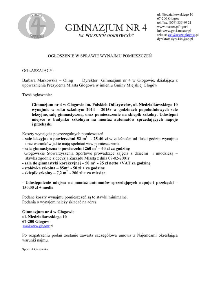 GIMNAZJUM NR 4 IM. POLSKICH ODKRYWCÓW ul. Niedziałkowskiego 10 67-200 Głogów tel./fax. (076) 835 69 21 www.master.pl/~gm4 lub www.gm4.master.pl szkoła: [email protected] dyrektor: [email protected] OGŁOSZENIE W SPRAWIE WYNAJMU POMIESZCZEŃ OGŁASZAJĄCY: Barbara Markowska – Oling Dyrektor Gimnazjum nr 4 w Głogowie, działająca z upoważnienia Prezydenta Miasta Głogowa w imieniu Gminy Miejskiej Głogów Treść ogłoszenia: Gimnazjum nr 4 w Głogowie im. Polskich Odkrywców, ul. Niedziałkowskiego 10 wynajmie w roku szkolnym 2014 – 2015r w godzinach popołudniowych sale lekcyjne, salę gimnastyczną, oraz pomieszczenie na sklepik szkolny. Udostępni miejsce w budynku szkolnym na montaż automatów sprzedających napoje i przekąski Koszty wynajęcia poszczególnych pomieszczeń - sale lekcyjne o powierzchni 52 m2 - 25-40 zł w zależności od ilości godzin wynajmu oraz warunków jakie mają spełniać w/w pomieszczenia - sala gimnastyczna o powierzchni 260 m2 – 40 zł za godzinę Głogowskie Stowarzyszenia Sportowe prowadzące zajęcia z dziećmi i młodzieżą – stawka zgodnie z decyzją Zarządu Miasta z dnia 07-02-2001r - sala do gimnastyki korekcyjnej – 50 m2 - 25 zł netto +VAT za godzinę - stołówka szkolna – 85m2 - 50 zł + za godzinę - sklepik szkolny – 7,2 m2 - 200 zł + za miesiąc - Udostępnienie miejsca na montaż automatów sprzedających napoje i przekąski – 150,00 zł + media Podane koszty wynajmu pomieszczeń są to stawki minimalne. Podania o wynajem należy składać na adres: Gimnazjum nr 4 w Głogowie ul. Niedziałkowskiego 10 67-200 Głogów [email protected] Po rozpatrzeniu podań zostanie zawarta szczegółowa umowa z Najemcami określająca warunki najmu. Sporz. A Ciszewska