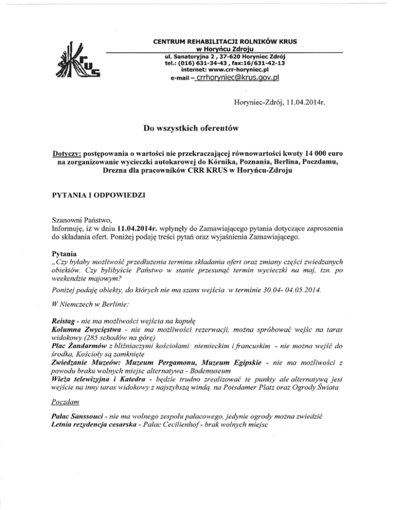 CENTRUM REHABILITACJI ROLNIKÓW KRUS w Horyńcu Zdroju ul. Sanatoryjna 2 , 37-620 Horyniec Zdrój tel.: (016) 631-34-43 , fax:16/631-42-13 internet: www.crr-horyniec.pl e-mail - [email protected] Horyniec-Zdrój, 11.04.2014r. Do wszystkich oferentów Dotyczy: postępowania o wartości nie przekraczającej równowartości kwoty 14 000 euro na zorganizowanie wycieczki autokarowej do Kórnika, Poznania, Berlina, Poczdamu, Drezna dla pracowników CRR KRUS w Horyńcu-Zdroju PYTANIA I ODPOWIEDZI Szanowni Państwo, Informuję, iż w dniu 11.04.2014r. wpłynęły do Zamawiającego pytania dotyczące zaproszenia do składania ofert. Poniżej podaję treści pytań oraz wyjaśnienia Zamawiającego. Pytania „ Czy byłaby możliwość przedłużenia terminu składania ofert oraz zmiany części zwiedzanych obiektów. Czy bylibyście Państwo w stanie przesunąć termin wycieczki na maj, tzn. po weekendzie majowym? Poniżej podają obiekty, do których nie ma szans wejścia w terminie 30.04- 04.05.2014. W Niemczech w Berlinie: Reistag - nie ma możliwości wejścia na kopułę Kolumna Zwycięstwa - nie ma możliwości rezerwacji, można spróbować wejść na taras widokowy (285 schodów na górę) Plac Żandarmów z bliźniaczymi kościołami: niemieckim i francuskim - nie można wejść do środka, Kościoły są zamknięte Zwiedzanie Muzeów: Muzeum Pergamonu, Muzeum Egipskie - nie ma możliwości z powodu braku wolnych miejsc alternatywa - Bodemuseum Wieża telewizyjna i Katedra - będzie trudno zrealizować te punkty ale alternatywą jest wejście na inny taras widokowy z najszybszą windą na Potsdamer Platz oraz Ogrody Świata Poczdam Pałac Sanssouci - nie ma wolnego zespołu pałacowego, jedynie ogrody można zwiedzić Letnia rezydencja cesarska - Pałac Cecilienhof- brak wolnych miejsc Drezno Residenzschloss ze skarbcem królów saskich zwany Griines Gewólbe - nie ma możliwości rezerwacji Pałac Zwinger - możliwe zwiedzanie powierzcłini wokół Odpowiedź: 1. Zamawiający informuje, iż przedłuża termin składania ofert do dnia 18.04.2014r. do godz. 10.00 2. Zamawiający wyraża zgodę na zmianę miejsc i obiektów zwiedzania, tj.: W Niemczech w Berlinie: Reistag - zwiedzanie z zewnątrz Kolumna Zwycięstwa - zwiedzanie z zewnątrz lub wejście na taras widokowy Plac Żandarmów z bliźniaczymi kościołami: niemieckim i francuskim - zwiedzanie z zewnątrz Zwiedzanie jednego z Muzeów: Muzeum Pergamonu, Muzeum Egipskie lub Bode Museum Wieża telewizyjna, Katedra - zwiedzanie z zewnątrz, w zamian: wejście na inny taras widokowy z najszybszą windą na Potsdamer Platz oraz Ogrody Świata W Poczdamie: Zamawiający nie wyraża zgody na zmiany. W Dreźnie Residenzschloss ze skarbcem królów saskich zwany Grunes Gewólbe z zewnątrz Pałac Zwinger - Zamawiający nie wyraża zgody na zmianę zwiedzanie 3. Zamawiający nie wyraża zgody na zmianę terminu wycieczki Dyrektor Centrum Rchabili^c/i Rolników KRUS