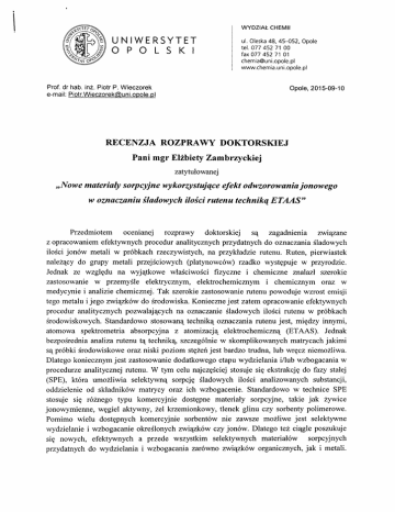 W YD z lA Ł cH EM || UNIVVERSYTET OPOLSKI ul, Oleska48, 45-052,Opo le tel.077 45271 00 fax077 45271 01 chemia@ uni.o po le.pl unruw. pl chemia.uni.opole. Prof.dr hab. inz. Piotr P. Wieczorek e-mail: Piotr.Wigczorek@u ni.opole.pl RECENZJA Opole,2015-09-10 ROZPRAWY DOKTORSKIEJ Pani mgr Elżbiety Zambr.ryckiej zatytllłowanej ,,N o we materiały sorp cyjn e wyko rzystuj ące efekt odwzor owani a j on owego w oznaczoniu śladowychilościrutenu techniką ETAAS, Przedmiotem ocenianej rozprawy doktorskiej są zagadnienia związane z opracowanięm efektywnych procedur analitycznych przydatnych do oznaczania śladowych ilościjonÓw metali w probkach rzeczywistych, na przy|<ładzierutenu. Ruten, pierwiastek na|eŻącydo grupy metali przejściowych (platynowcÓw) rzadko występuje w przyrodzie, Jednak zę względu na wyjątkowe właściwościftzyczne i chemic7lle zna|azł szerokie zastosowanie w przemyśle elektryc7llym, elektrochemicznym i chemicznym oraz w medycynie i analizie chemicznej. Tak szerokie zastosowanie rutenu powoduje wzrost emisji tego metalu i jego zwiąrkow do środowiska.Koniecznę jest zatem opracowanie efektywnych procedur ana|itycznych pozwalających na oznacza|\ieśladolvychilości rutenu w prÓbkach środowiskowych.Standardowo stosowaną techniką oznaczania rutęnu jest, między innymi, atomowa spektrometria absorpcyjna z atomizacją elektrochemiczną (ETAAS). Jednak bezpośredniaana|tzarutenu tą technlką szczegÓlnie w skomplikowanych matrycach jakimi są probki środowiskoweoraz niski poziom stęzerijest bardzo trudna, lub wTęcZniemozliwa. Dlatego koniecznym jest zastosowanie dodatkowego etapu wydzielania i/lub wzbogacania w procedurzę analitycznej rutenu. W tym celu najczęściejstosuje się ekstrakcję do fazy stałej (SPE')' ktÓra umozliwia selektywną sorpcję śladowych ilości analizowanych substancji, oddzielenie od składnikÓw matrycy oraz ich wzbogacenie. Standardowo w technice SPE stosuje się rÓznego typu komercyjnie dostępne materiały sorpcyjne, takie jak zywice jonowymienne, węgiel aktyrvny, ŻelrkrzemioŃowy, tlenek glinu czy sorbenty polimerowe. Pomimo wielu dostępnych komercyjnie sorbentÓw nie Zawsze mozliwe jest selektywne wydzielanie i wzbogacanie określonychzwiązkÓw czy jonow. Dlatego teŻ ciągle poszukuje się nowych, efektywnych a przede wszystkim selektywnych materiałÓw sorpcyjnych przydatnych do wydzielania i wzbogacania zarÓwno rwiązkÓw organicznych, jak i metali. Taką alternatywąmogą być polimery z odwzorowanymi cząsteczkami (molecularly imprinted polymers, MIP) lub jonami metali (ion imprinted polymers, IP), coraz powszechniej stosowane w analizie śladowych ilości zarÓwno związkow otganicznych jak i mętali. Sorbentyte posiadająbowiem w swojej strukturzemiejsca dostosowanedo rozmiaru, kształtu i grup fuŃcyjnych występujących w cząsteczce analitu, co umozliwia jego selektywną sorpcję. Wymaga to jednak otrzymania specyficznych, indywidualnych sorbentÓw dla okreŚlonegojonu metalu, czy związku lub grupy rwiązkow. W ZakładzieChemii Analitycznej InstytutuChemii Uniwersytetu w BiĄmstoku, pod kierunkiem przęz Prof. B. Godlewskiej-Żyłkiewicz, chemika analityka o uznanęJ pozycjt międzynarodowej, od lat prowadzone Są badania związane z opracowaniem nowych, efektywnych materiałÓw sorpcyjnych przydatnych w procedurach oznaczania metali. Co wazne zakres prac obejmuje szerokie spektrum problemÓw począwszy od syntezy specyficznych sorbentÓw, podstawowych badari ich właściwościfizyko-chemicznych. poprzez badania mechanizmÓw separacji, do opracowania i walidacji metod analitycznych i zastosowaniaopracowanych metod w analityce środowiskowej. Recęnzowana rozprawa doktorska Pani mgr Elzbiety Zambrzyckiej mieścisię w tym zakresie t dotyczy syntezy, badania parametrÓw fizykochemicznych nowych sorbentÓw polimerowych z odwzorowanymi jonami rutenu, zbadania ich właściwościanalitycznych i zastosowania otrzymanych materiałÓw sorpcyjnych do oznaczania rutenu w prÓbkach środowiskowychtechniką ETAAS. Pozwala to na selektywne wydzielenie i wzbogacenie jonÓw Ru(III) występujących w probkach środowiskowychna poziomie śladÓw (p/kg). Autorka skoncentrowała się na określeniuwpływu liganda, monomerÓw, rozplJszcza|nika i sorpcyjnepolimerlw z odciskiem jonÓw zastosowanejmetody polimeryzacji na właściwości rutęnu otaz mozliwości ich zastosowania w procedurze analitycznej. W tym celu wykorzystując spektroskopię FT.IR, SEM i porozymetrię azotową określiłastrukturę do powierzchni polimerÓw, ich właściwości sorpcyjne i przydatność chemiczną i właściwości wydzielania jonow rutęnu z prÓbek rzeczryistych do jego oznaczania z wykorzystaniem metodyETAAS. Rozprawa mgr E|Żbiety Zambrzyckiej napisana została w klasycznym układzie rozdziałowi zawiera wszystkie elementy cechującebardzo dobrze przygotowaną i napisaną rozprawę doktorską. Przedstawiona do oceny praca składa się Ze wstępu, obszernego i szczegoł'owegoprzeglądu literatury (aŻ 344 cytowane pozycje literaturowe), omÓwienia badariwłasnychz określęniemcelu pracy, podsumowania i wnioskow. Zał'ączoflesą rÓwniez wykaz skrÓtÓw i akronimÓw, streszczenie, spis cytowanej literatury, spis tabel t wykaz dorobku naukowego Autorki. Pierwsza częścobszernego omÓwienia literatury przedmiotu i zastosowanie rutenu, po czw zawiera informacje na temat występowania, właściwości Autorka omawia metody oznaczaniarutenu, atakŻe metody jego vtydzie|aniai wzbogacania. Następnie szczegÓłowoomawia sposoby otrzymywania kopolimerÓw IIP, metody stosowane do badania właściwościtakich polimerÓw oraz moiliwości zastosowania otrzymanych sorbentÓw do wydzielania jonÓw metali z prÓbek rzeczywistych. Treścizawartew tej części rozptawy podane Są we właściwychproporcjach i są zgodne z za|<resempodjętych badari. ( ZarÓwno pod względem merytorycznym,jak i edyorskim ta częścpracy świadczyo trafnym doborze treścii nie