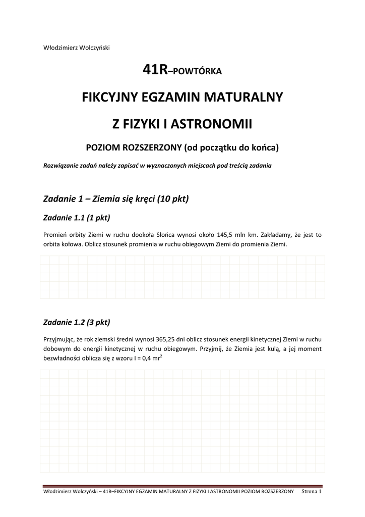 Włodzimierz Wolczyński 41R–POWTÓRKA FIKCYJNY EGZAMIN MATURALNY Z FIZYKI I ASTRONOMII POZIOM ROZSZERZONY (od początku do końca) Rozwiązanie zadań należy zapisać w wyznaczonych miejscach pod treścią zadania Zadanie 1 – Ziemia się kręci (10 pkt) Zadanie 1.1 (1 pkt) Promień orbity Ziemi w ruchu dookoła Słońca wynosi około 145,5 mln km. Zakładamy, że jest to orbita kołowa. Oblicz stosunek promienia w ruchu obiegowym Ziemi do promienia Ziemi. Zadanie 1.2 (3 pkt) Przyjmując, że rok ziemski średni wynosi 365,25 dni oblicz stosunek energii kinetycznej Ziemi w ruchu dobowym do energii kinetycznej w ruchu obiegowym. Przyjmij, że Ziemia jest kulą, a jej moment bezwładności oblicza się z wzoru I = 0,4 mr2 Włodzimierz Wolczyński – 41R–FIKCYJNY EGZAMIN MATURALNY Z FIZYKI I ASTRONOMII POZIOM ROZSZERZONY Strona 1 Zadanie 1.3 (3 pkt) Stwierdzono, że doba ziemska wydłuża się o 3 ms na wiek. Jeśli tak jest, to oszacuj, jak zmienia się (rośnie, czy maleje moment bezwładności) Ziemi. Uzasadnij odpowiedź, podając nazwę prawa i jego treść. Uzasadnienie: Powołuję się na ......................................................................................................................... o treści: .................................................................................................................................... ................................................................................................................................................ ............................................................................................................................................... Zadanie 1.4 (3 pkt) W czasie pisania matury przebędziesz całkiem spora drogę związaną z ruchem obrotowym Ziemi wokół własnej osi. Jaka to będzie droga w czasie 150 min? Szerokość geograficzną przyjmij jako 52o. sin 52o = 0,7880 cos 52o = 0,6152 tg 52o = 1,2799 Włodzimierz Wolczyński – 41R–FIKCYJNY EGZAMIN MATURALNY Z FIZYKI I ASTRONOMII POZIOM ROZSZERZONY Strona 2 Zadanie 2 – Balon (8 pkt) Średnica kulistego balonu na gorące powietrze wynosi 20 m. Temperatura zewnętrzna powietrza wynosi 20 oC, a gęstość powietrza w tej temperaturze wynosi ρ20 = 1,2 kg/m3. Przyjmij, że powłoka i ludzie oraz sprzęt balonu ważą 500 kg (nie jest w tę masę wliczona masa gorącego powietrza). Zadanie 2.1 (3 pkt) Wykaż, że gorące powietrze w balonie, aby uniósł ona ludzi, powinno mieć gęstość 1,08 kg/m3. Zadanie 2.2 (2 pkt) Wykaż, że taka gęstość gorącego powietrza odpowiada temperaturze powietrza około 52,6oC. Przyjmij, że ciśnienia powietrza wewnątrz i na zewnątrz balonu są równe. Włodzimierz Wolczyński – 41R–FIKCYJNY EGZAMIN MATURALNY Z FIZYKI I ASTRONOMII POZIOM ROZSZERZONY Strona 3 Zadanie 2.3 (3 pkt) Gdyby gorące powietrze zastąpiono helem (masa molowa - µ = 4 g/mol), to jaka musiałaby być jego temperatura przy tej samej objętości i gdyby ciśnienie jego wewnątrz balonu musiałoby być 7 razy większe od atmosferycznego, wynoszącego 100 000 Pa? Zadanie 3 – Cyklotron (13 pkt) Cyklotron przyspiesza cząstki α do energii 20 MeV. Zastosowano w nim pole elektryczne o różnicy potencjałów 105 V, oraz magnetyczne o indukcji 1 T. Zadanie 3.1 (3 pkt) Wykaż, że częstotliwość zmian pola magnetycznego należy zastosować, aby z cyklotronu wyszła spodziewana wiązka jest w przybliżeniu równa 7,6·106 Hz Włodzimierz Wolczyński – 41R–FIKCYJNY EGZAMIN MATURALNY Z FIZYKI I ASTRONOMII POZIOM ROZSZERZONY Strona 4 Zadanie 3.2 (2 pkt) Wykaż, że cząstki będą przechodziły przez szczelinę między duantami 100 razy. Zadanie 3.3 (2 pkt) Wykaż, że prędkość cząstek wynosi około 3,09·107 m/s, a pęd około 2,071·10-19 kgm/s. Zadanie 3.4 (2 pkt) Oblicz pęd relatywistyczny cząstek α oraz jego stosunek do pędu liczonego klasycznie Włodzimierz Wolczyński – 41R–FIKCYJNY EGZAMIN MATURALNY Z FIZYKI I ASTRONOMII POZIOM ROZSZERZONY Strona 5 Zadanie 3.5 (2 pkt) Skoro przy tej prędkości efekty relatywistyczne są pomijalne, oblicz promień okręgu wiązki, stosując dalej mechanikę klasyczną. Zadanie 3.6 (2 pkt) Nie licząc czasu przechodzenia przez szczeliny między duantami, oblicz czas, w którym wygeneruje sią żądana wiązka. Zadanie 4 - Serie wodorowe (6 pkt) Energia elektronu w atomie wodoru w stanie podstawowym wynosi A = -13,6 eV. Długości fal jakie są emitowane lub pochłaniane przy przeskokach między orbitami w atomie wodoru można obliczyć stosując albo postulat Bohra, albo stosując wzór Rydberga ଵ ఒ = మ − మ = + 1, + 2, + 3, … ଵ ଵ ଵ R = 1,1·10 Oblicz długość najdłuższej fali i granicy krótkofalowej dla II serii wodorowej. Wynik podaj w nanometrach Włodzimierz Wolczyński – 41R–FIKCYJNY EGZAMIN MATURALNY Z FIZYKI I ASTRONOMII POZIOM ROZSZERZONY Strona 6 Zadanie 4.1 (4 pkt) Z II postulatu Bohra: Zadanie 4.2 (2 pkt) Z wzoru Rydberga: Włodzimierz Wolczyński – 41R–FIKCYJNY EGZAMIN MATURALNY Z FIZYKI I ASTRONOMII POZIOM ROZSZERZONY Strona 7 Zadanie 5 - Lot na Księżyc (6 pkt) Dane Księżyca: masa - 7,38·1022 kg, średnica – 3474 km Zadanie 5.1 (2 pkt) Oblicz przyspieszenie grawitacyjne na powierzchni Księżyca Zadanie 5.2 (2 pkt) Przed lądowaniem na Księżycu kosmonauci wyprawy Apollo 11 znajdowali się na orbicie okołoksiężycowej na wysokości 14,5 km nad jego powierzchnią. Jaką prędkość miał wtedy ich statek kosmiczny? Zadanie 5.3 (2 pkt) Lądownik z dwoma kosmonautami odłączył się od statku i opadał ruchem opóźnionym. Załóżmy, że opóźnienie było stałe i wynosiło 10 m/s2, a przyspieszenie na Księżycu jest równe 1/6 ziemskiego. Jaki nacisk wywierał na fotel kosmonauta o masie z oprzyrządowaniem równej 100 kg. Włodzimierz Wolczyński – 41R–FIKCYJNY EGZAMIN MATURALNY Z FIZYKI I ASTRONOMII POZIOM ROZSZERZONY Strona 8 Zadanie 6 - Soczewka (7 pkt) Na dnie basenu znajduje się płasko-wklęsła s