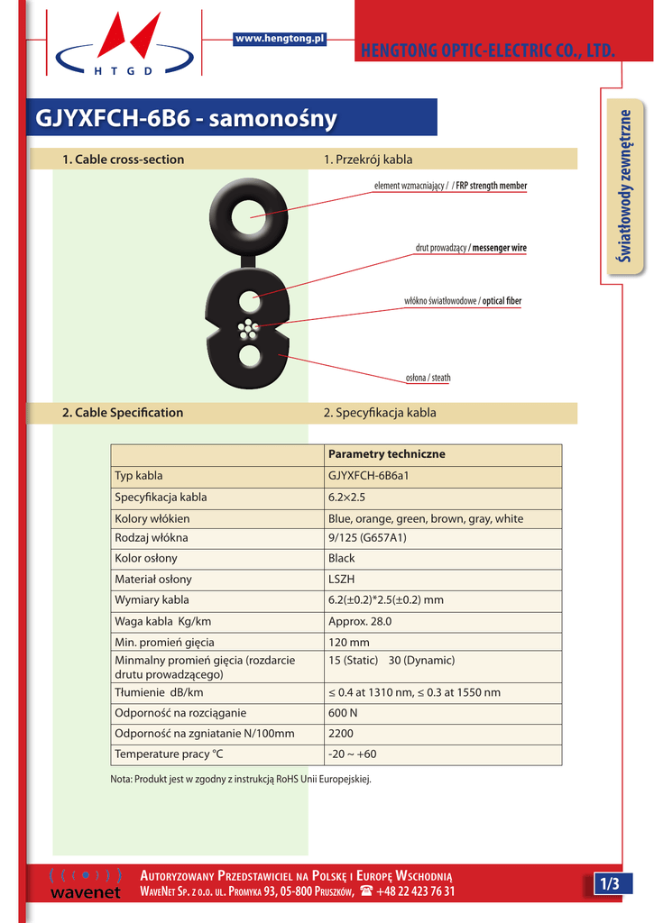 www.hengtong.pl GJYXFCH-6B6 - samonośny 1. Cable cross-section 1. Przekrój kabla element wzmacniający / / FRP strength member drut prowadzący / messenger wire Światłowody zewnętrzne HENGTONG OPTIC-ELECTRIC CO., LTD. włókno światłowodowe / optical fiber osłona / steath 2. Cable Specification 2. Specyfikacja kabla Parametry techniczne Typ kabla GJYXFCH-6B6a1 Specyfikacja kabla 6.2×2.5 Kolory włókien Blue, orange, green, brown, gray, white Rodzaj włókna 9/125 (G657A1) Kolor osłony Black Materiał osłony LSZH Wymiary kabla 6.2(±0.2)*2.5(±0.2) mm Waga kabla Kg/km Approx. 28.0 Min. promień gięcia Minmalny promień gięcia (rozdarcie drutu prowadzącego) Tłumienie dB/km 120 mm 15 (Static) 30 (Dynamic) Odporność na rozciąganie 600 N Odporność na zgniatanie N/100mm 2200 Temperature pracy °C -20 ~ +60 ≤ 0.4 at 1310 nm, ≤ 0.3 at 1550 nm Nota: Produkt jest w zgodny z instrukcją RoHS Unii Europejskiej. Autoryzowany Przedstawiciel na Polskę i Europę Wschodnią WaveNet Sp. z o.o. ul. Promyka 93, 05-800 Pruszków, +48 22 423 76 31 1/3 www.hengtong.pl GJYXFCH-6B6 - samonośny Cable specification Cable type GJYXFCH-6B6a1 Cable specification 6.2×2.5 Fiber color Blue, orange, green, brown, gray, white Sheath color 9/125 (G657A1) Sheath material Black Materiał osłony LSZH Cable dimension 6.2(±0.2)*2.5(±0.2) mm Cable weight km Approx. 28.0 Min. bending radius Min. bending radius (rip off the messenger wire) Attenuation dB/km 120 mm 15 (Static) 30 (Dynamic) Short term tensile 600 N Crush resistance N/100mm 2200 Operation temperature °C -20 ~ +60 Światłowody zewnętrzne HENGTONG OPTIC-ELECTRIC CO., LTD. ≤ 0.4 at 1310 nm, ≤ 0.3 at 1550 nm Note: the product is accord with the instruction of EU RoHS. Autoryzowany Przedstawiciel na Polskę i Europę Wschodnią WaveNet Sp. z o.o. ul. Promyka 93, 05-800 Pruszków, +48 22 423 76 31 2/3 HENGTONG OPTIC-ELECTRIC CO., LTD. GYFXTF – (Fibrain Areo 1800N) Pozycja Metoda testu Wyniki testu Siła naciągu IEC 794-1-2-E1 obciążenie: Maksymalna siła naciągu Długość kabla ok. 50 m Czas obciążenia: 1 min obciążenie: Maksymalna siła zgniatania Czas obciążenia: 1 min Ilośc punktów udezrań: 3 Ilośc uderzeń w punkt: 1 Energia uderzenia: 3J Rozszczepienie włókna ≤ 0,6% Brak uszkodzeń włókna oraz izolacji. Straty < 0,1 dB@1550 mm Brak uszkodzeń włókna oraz izolacji. Straty < 0,1 dB@1550 mm Brak uszkodzeń włókna oraz izolacji. Siła zrywająca IEC 60794-1-2-E3 Test uderzeniowy IEC 60794-1-2-E4 4. Characteristic of Optical Fiber Światłowody zewnętrzne www.hengtong.pl 4. Charakterystyka włókna szklanego G652D fiber information: Włókno typu G652D: Mode field diameter (1310nm): 9.2 µm±0.4 µm Mode field diameter (1550nm): 10.4 µm±0.8 µm Cladding diamAttenuation 1310nm: ≤0.38dB/km Attenuation 1550nm: ≤0.24dB/km Bending loss at (100 turns, 30mm radius: £0.05dB Dispersion in the range 1288 to 1339 nm: ≤3.5 ps/nm km½ Dispersion 1550nm: ≤18ps/ (nm•km) Zero dispersion wavelength (λ0): 0.092ps/nm2•km) Średnica pola modu (1310 nm): 9.2 µm±0.4 µm Średnica pola modu (1550 nm): 10.4 µm±0.8 µm Tłumienie dla 1310nm: ≤0.38 dB/km Tłumienie dla 1550nm: ≤0.24 dB/km Straty przy gięciu dla 1550 nm (100 gięć, 30 mm promień: £0.05dB Dyspersja pomiędzy 1288 to 1339 nm: ≤3.5 ps/nm km½ Dyspersja przy 1550nm::: ≤18 ps/nm km½ Zerowy poziom dyspersji (λ0): 0.092ps/ (nm2•km) Autoryzowany Przedstawiciel na Polskę i Europę Wschodnią WaveNet Sp. z o.o. ul. Promyka 93, 05-800 Pruszków, +48 22 423 76 31 3/3