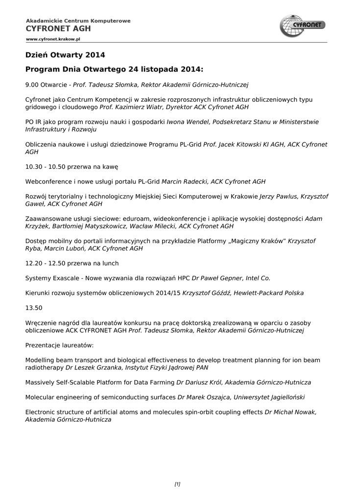 Dzień Otwarty 2014 Program Dnia Otwartego 24 listopada 2014: 9.00 Otwarcie - Prof. Tadeusz Słomka, Rektor Akademii Górniczo-Hutniczej Cyfronet jako Centrum Kompetencji w zakresie rozproszonych infrastruktur obliczeniowych typu gridowego i cloudowego Prof. Kazimierz Wiatr, Dyrektor ACK Cyfronet AGH PO IR jako program rozwoju nauki i gospodarki Iwona Wendel, Podsekretarz Stanu w Ministerstwie Infrastruktury i Rozwoju Obliczenia naukowe i usługi dziedzinowe Programu PL-Grid Prof. Jacek Kitowski KI AGH, ACK Cyfronet AGH 10.30 - 10.50 przerwa na kawę Webconference i nowe usługi portalu PL-Grid Marcin Radecki, ACK Cyfronet AGH Rozwój terytorialny i technologiczny Miejskiej Sieci Komputerowej w Krakowie Jerzy Pawlus, Krzysztof Gaweł, ACK Cyfronet AGH Zaawansowane usługi sieciowe: eduroam, wideokonferencje i aplikacje wysokiej dostępności Adam Krzyżek, Bartłomiej Matyszkowicz, Wacław Milecki, ACK Cyfronet AGH Dostęp mobilny do portali informacyjnych na przykładzie Platformy „Magiczny Kraków” Krzysztof Ryba, Marcin Luboń, ACK Cyfronet AGH 12.20 - 12.50 przerwa na lunch Systemy Exascale - Nowe wyzwania dla rozwiązań HPC Dr Paweł Gepner, Intel Co. Kierunki rozwoju systemów obliczeniowych 2014/15 Krzysztof Góźdź, Hewlett-Packard Polska 13.50 Wręczenie nagród dla laureatów konkursu na pracę doktorską zrealizowaną w oparciu o zasoby obliczeniowe ACK CYFRONET AGH Prof. Tadeusz Słomka, Rektor Akademii Górniczo-Hutniczej Prezentacje laureatów: Modelling beam transport and biological effectiveness to develop treatment planning for ion beam radiotherapy Dr Leszek Grzanka, Instytut Fizyki Jądrowej PAN Massively Self-Scalable Platform for Data Farming Dr Dariusz Król, Akademia Górniczo-Hutnicza Molecular engineering of semiconducting surfaces Dr Marek Oszajca, Uniwersytet Jagielloński Electronic structure of artificial atoms and molecules spin-orbit coupling effects Dr Michał Nowak, Akademia Górniczo-Hutnicza [1] Powered by TCPDF (www.tcpdf.org)