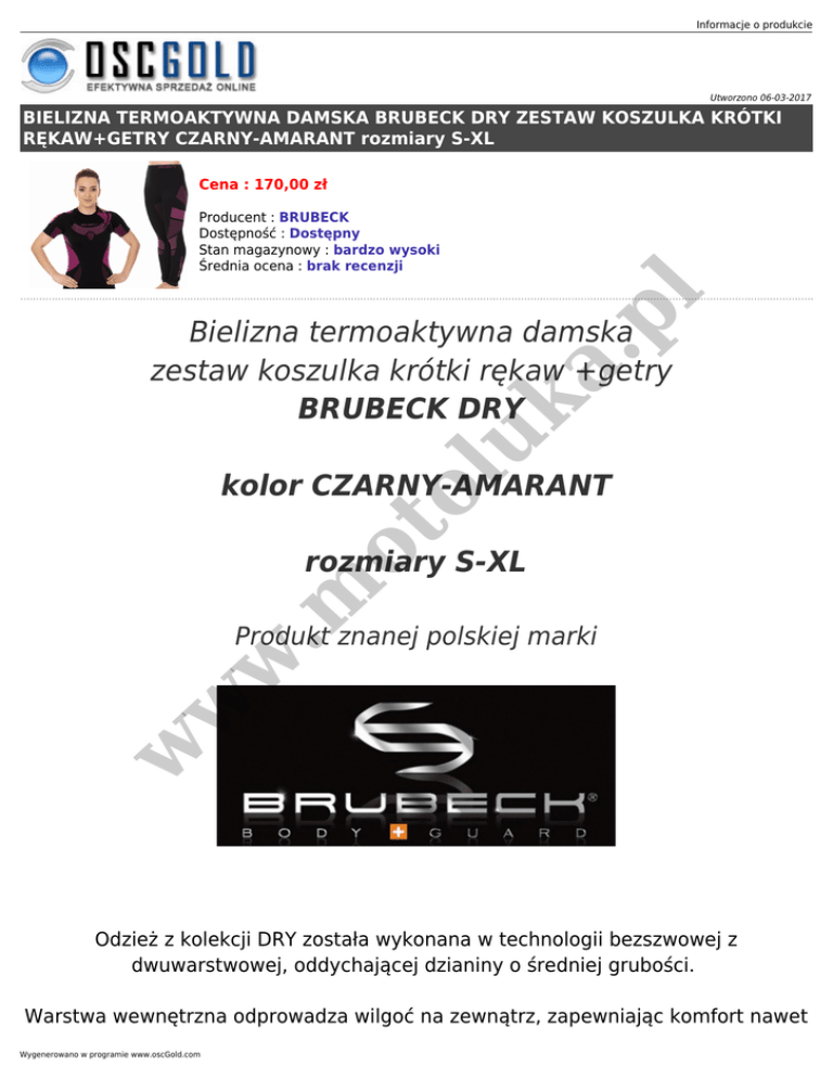 Informacje o produkcie Utworzono 06-03-2017 BIELIZNA TERMOAKTYWNA DAMSKA BRUBECK DRY ZESTAW KOSZULKA KRÓTKI RĘKAW+GETRY CZARNY-AMARANT rozmiary S-XL Cena : 170,00 zł a. pl Producent : BRUBECK Dostępność : Dostępny Stan magazynowy : bardzo wysoki Średnia ocena : brak recenzji uk Bielizna termoaktywna damska zestaw koszulka krótki rękaw +getry BRUBECK DRY ot ol kolor CZARNY-AMARANT .m rozmiary S-XL w w w Produkt znanej polskiej marki Odzież z kolekcji DRY została wykonana w technologii bezszwowej z dwuwarstwowej, oddychającej dzianiny o średniej grubości. Warstwa wewnętrzna odprowadza wilgoć na zewnątrz, zapewniając komfort nawet Wygenerowano w programie www.oscGold.com podczas intensywnego wysiłku. Warstwa zewnętrzna pełni funkcję termoizolacyjną, chroni przed przenikaniem chłodnego powietrza do wewnątrz oraz przed naturalną utratą ciepła. W strefach o wzmożonej potliwości zastosowano strukturę siatki oraz kanały wentylacyjne wspomagające transport wilgoci. Odzież posiada właściwości antyalergiczne i bakteriostatyczne. a. pl Kolekcja DRY przeznaczona jest do całorocznego użytkowania, polecana w szczególności do biegania, jazdy na rowerze oraz innych aktywności outdoorowych w okresie przejściowym. Skład: 62% poliamid, 38% poliester w w w .m ot ol uk Gramatura: 154 g/m2 Konserwacja: Informacje o produkcie uk a. pl Odzież termoaktywną można prać w pralce w temperaturze do 40°C Nie należy stosować proszków do prania Nie należy stosować płynu do płukania tkanin oraz środków zmiękczających, ponieważ ich działanie neutralizuje termoaktywność odzieży Zaleca się stosować środki do prania tkanin delikatnych lub płatki mydlane Odzież termoaktywną zaleca się prać częściej, przy użyciu małej ilości detergentu Odzież termoaktywną można prać ręcznie, optymalnie w temperaturze 30°C z zastosowaniem płatków mydlanych lub zwykłego szarego mydła Pranie ręczne bardzo dokładnie usuwa trwałe zabrudzenia, do których usuwania nie możemy używać żadnych wybielaczy ani innych środków odbarwiających Nie należy suszyć odzieży termoaktywnej mechanicznie Nie należy prasować odzieży termoaktywnej w w w .m ot ol Wybierz swój rozmiar na podstawie tabelki Wygenerowano w programie www.oscGold.com