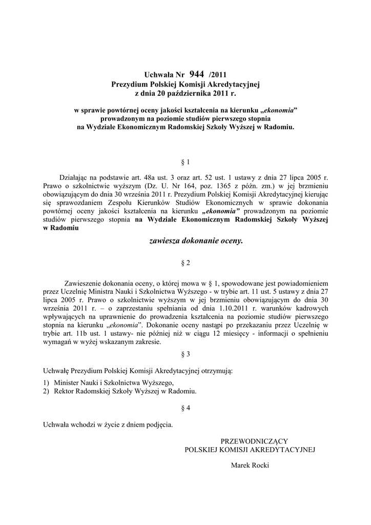 Uchwała Nr 944 /2011 Prezydium Polskiej Komisji Akredytacyjnej z dnia 20 października 2011 r. w sprawie powtórnej oceny jakości kształcenia na kierunku „ekonomia” prowadzonym na poziomie studiów pierwszego stopnia na Wydziale Ekonomicznym Radomskiej Szkoły Wyższej w Radomiu. §1 Działając na podstawie art. 48a ust. 3 oraz art. 52 ust. 1 ustawy z dnia 27 lipca 2005 r. Prawo o szkolnictwie wyższym (Dz. U. Nr 164, poz. 1365 z późn. zm.) w jej brzmieniu obowiązującym do dnia 30 września 2011 r. Prezydium Polskiej Komisji Akredytacyjnej kierując się sprawozdaniem Zespołu Kierunków Studiów Ekonomicznych w sprawie dokonania powtórnej oceny jakości kształcenia na kierunku „ekonomia” prowadzonym na poziomie studiów pierwszego stopnia na Wydziale Ekonomicznym Radomskiej Szkoły Wyższej w Radomiu zawiesza dokonanie oceny. §2 Zawieszenie dokonania oceny, o której mowa w § 1, spowodowane jest powiadomieniem przez Uczelnię Ministra Nauki i Szkolnictwa Wyższego - w trybie art. 11 ust. 5 ustawy z dnia 27 lipca 2005 r. Prawo o szkolnictwie wyższym w jej brzmieniu obowiązującym do dnia 30 września 2011 r. – o zaprzestaniu spełniania od dnia 1.10.2011 r. warunków kadrowych wpływających na uprawnienie do prowadzenia kształcenia na poziomie studiów pierwszego stopnia na kierunku „ekonomia”. Dokonanie oceny nastąpi po przekazaniu przez Uczelnię w trybie art. 11b ust. 1 ustawy- nie później niż w ciągu 12 miesięcy - informacji o spełnieniu wymagań w wyżej wskazanym zakresie. §3 Uchwałę Prezydium Polskiej Komisji Akredytacyjnej otrzymują: 1) Minister Nauki i Szkolnictwa Wyższego, 2) Rektor Radomskiej Szkoły Wyższej w Radomiu. §4 Uchwała wchodzi w życie z dniem podjęcia. PRZEWODNICZĄCY POLSKIEJ KOMISJI AKREDYTACYJNEJ Marek Rocki