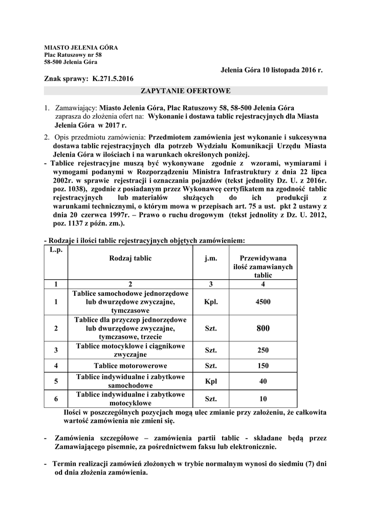 MIASTO JELENIA GÓRA Plac Ratuszowy nr 58 58-500 Jelenia Góra Jelenia Góra 10 listopada 2016 r. Znak sprawy: K.271.5.2016 ZAPYTANIE OFERTOWE 1. Zamawiający: Miasto Jelenia Góra, Plac Ratuszowy 58, 58-500 Jelenia Góra zaprasza do złożenia ofert na: Wykonanie i dostawa tablic rejestracyjnych dla Miasta Jelenia Góra w 2017 r. 2. Opis przedmiotu zamówienia: Przedmiotem zamówienia jest wykonanie i sukcesywna dostawa tablic rejestracyjnych dla potrzeb Wydziału Komunikacji Urzędu Miasta Jelenia Góra w ilościach i na warunkach określonych poniżej. - Tablice rejestracyjne muszą być wykonywane zgodnie z wzorami, wymiarami i wymogami podanymi w Rozporządzeniu Ministra Infrastruktury z dnia 22 lipca 2002r. w sprawie rejestracji i oznaczania pojazdów (tekst jednolity Dz. U. z 2016r. poz. 1038), zgodnie z posiadanym przez Wykonawcę certyfikatem na zgodność tablic rejestracyjnych lub materiałów służących do ich produkcji z warunkami technicznymi, o którym mowa w przepisach art. 75 a ust. pkt 2 ustawy z dnia 20 czerwca 1997r. – Prawo o ruchu drogowym (tekst jednolity z Dz. U. 2012, poz. 1137 z późn. zm.). - Rodzaje i ilości tablic rejestracyjnych objętych zamówieniem: L.p. Rodzaj tablic j.m. Przewidywana ilość zamawianych tablic 1 2 3 4 Tablice samochodowe jednorzędowe 1 lub dwurzędowe zwyczajne, Kpl. 4500 tymczasowe Tablice dla przyczep jednorzędowe 2 lub dwurzędowe zwyczajne, Szt. 800 tymczasowe, trzecie Tablice motocyklowe i ciągnikowe 3 Szt. 250 zwyczajne 4 Tablice motorowerowe Szt. 150 Tablice indywidualne i zabytkowe 5 Kpl 40 samochodowe Tablice indywidualne i zabytkowe 6 Szt. 10 motocyklowe Ilości w poszczególnych pozycjach mogą ulec zmianie przy założeniu, że całkowita wartość zamówienia nie zmieni się. - Zamówienia szczegółowe – zamówienia partii tablic - składane będą przez Zamawiającego pisemnie, za pośrednictwem faksu lub elektronicznie. - Termin realizacji zamówień złożonych w trybie normalnym wynosi do siedmiu (7) dni od dnia złożenia zamówienia. W przypadku zamówień interwencyjnych, złożonych faksem lub elektronicznie termin realizacji zamówienia wynosi do 48 godzin od chwili złożenia zamówienia. - Wykonawca ponosi pełną odpowiedzialność za uszkodzenia dostarczanych tablic, powstałe w czasie transportu. - Wykonawca zobowiązuje się do natychmiastowego (w terminach określonych w aktach prawnych) dostosowywania wykonywanych tablic rejestracyjnych do nowych wzorów i wymagań w przypadku ukazania się nowych przepisów prawnych i regulacji dotyczących przedmiotu niniejszego zamówienia. - Wykonawca zobowiązany jest do wykonania przedmiotu zamówienia w zgodności z przepisami oraz standardami określonymi w Załączniku nr 8 do Rozporządzenia Ministra Infrastruktury z dnia 22 lipca 2002 r. w sprawie rejestracji i oznaczania pojazdów (tj. z Dz.U.2016 r. poz. 1038). 3.Termin realizacji zamówienia: sukcesywnie w 2017 r. 4. Miejsce i termin złożenia oferty: Wydział Komunikacji Urzędu Miasta Jelenia Góra, ul. Sudecka 29, 58-500 Jelenia Góra do dnia 29.11.2016 r. pok. Nr 11 do godziny 10.00. 5. Termin otwarcia ofert: Wydział Komunikacji Urzędu Miasta Jelenia Góra, ul. Sudecka 29, 58-500 Jelenia Góra dnia 29.11.2016 r. pok. Nr 9 o godzinie 10.00. 6. Warunki udziału w postępowaniu: Posiadanie przez wykonawcę wpisu do rejestru przedsiębiorców produkujących tablice rejestracyjne i spełnia następujące warunki: określone w art. 75a ust. 1 i 2 Ustawy z dnia 20 czerwca 1997 r. Prawo o ruchu drogowym /tekst jednolity Dz.U. z 2012r. poz. 1137 z późn. zmianami/. 1) posiada możliwości techniczne gwarantujące wykonywanie tablic rejestracyjnych lub materiałów służących do ich produkcji zgodnie z warunkami technicznymi; warunek ten nie dotyczy przedsiębiorców sprowadzających z zagranicy materiały służące do wyrobu tablic rejestracyjnych; 2) posiada certyfikat na zgodność tablic rejestracyjnych lub materiałów służących do ich produkcji z warunkami technicznymi; 3) nie jest podmiotem, w stosunku do którego wszczęto postępowanie upadłościowe lub likwidacyjne; 4) nie zalega z uiszczeniem podatków, opłat lub składek na ubezpieczenie społeczne; 5) nie został prawomocnie skazany za przestępstwo popełnione w celu osiągnięcia korzyści majątkowej lub przestępstwo przeciwko dokumentom - dotyczy osoby fizycznej lub członków organów osoby prawnej. 7. Kryterium oceny ofert: najniższa cena. 8. Wzór oferty - załącznik Nr 1 do zapytania ofertowego. 9. Warunki płatności - określone w projekcie umowy-załącznik Nr 2 do zapytania ofertowego. 10. Sposób przygotowania oferty: Ofertę należy sporządzić w formie pisemnej w języku polskim; Złożyć w nieprzezroczystej, zabezpieczonej przed otwarciem kopercie z opisem: Oferta w postępowaniu „Wykonanie i dostawa tablic rejestracyjnych dla Miasta Jelenia Góra w 2017 r.” Nazwa i adres Wykonawcy. 11. Osoba upoważniona do kontaktu z wykonawcami ze strony Zamawiającego: Stanisław Kirwiel tel. (75) 7546219, fsx. (75) 7546290, e-mail; [email protected] z up. Prezydenta Miasta Barbara Chrebor Sekretarz Miasta Jeleniej Góry *osoba upoważniona: Prezydent Miasta, Zastępca Prezydenta, Skarbnik, Sekretarz
