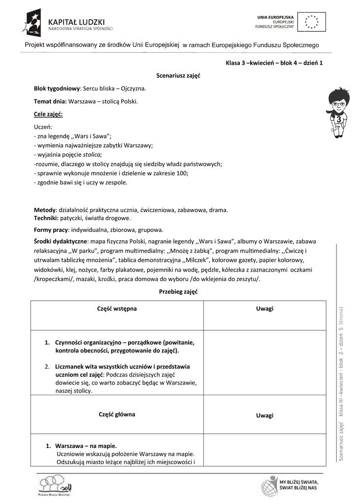 Klasa 3 –kwiecień – blok 4 – dzień 1 Scenariusz zajęć Blok tygodniowy: Sercu bliska – Ojczyzna. Temat dnia: Warszawa – stolicą Polski. Cele zajęć: Uczeń: - zna legendę ,,Wars i Sawa”; - wymienia najważniejsze zabytki Warszawy; - wyjaśnia pojęcie stolica; -rozumie, dlaczego w stolicy znajdują się siedziby władz państwowych; - sprawnie wykonuje mnożenie i dzielenie w zakresie 100; - zgodnie bawi się i uczy w zespole. Metody: działalność praktyczna ucznia, ćwiczeniowa, zabawowa, drama. Techniki: patyczki, światła drogowe. Formy pracy: indywidualna, zbiorowa, grupowa. Środki dydaktyczne: mapa fizyczna Polski, nagranie legendy ,,Wars i Sawa”, albumy o Warszawie, zabawa relaksacyjna ,,W parku”, program multimedialny: ,,Mnożę z żabką”, program multimedialny: ,,Ćwiczę i utrwalam tabliczkę mnożenia”, tablica demonstracyjna ,,Milczek”, kolorowe gazety, papier kolorowy, widokówki, klej, nożyce, farby plakatowe, pojemniki na wodę, pędzle, kółeczka z zaznaczonymi oczkami /kropeczkami/, mazaki, kredki, praca domowa do wyboru /do wklejenia do zeszytu/. Część wstępna Uwagi 1. Czynności organizacyjno – porządkowe (powitanie, kontrola obecności, przygotowanie do zajęć). 2. Liczmanek wita wszystkich uczniów i przedstawia uczniom cel zajęć: Podczas dzisiejszych zajęć dowiecie się, co warto zobaczyć będąc w Warszawie, naszej stolicy. Część główna 1. Warszawa – na mapie. Uczniowie wskazują położenie Warszawy na mapie. Odszukują miasto leżące najbliżej ich miejscowości i Uwagi Scenariusz zajęć klasa III –kwiecień - blok 2 – dzień 5 Strona1 Przebieg zajęć Prezentacja efektów pracy poszczególnych grup. 5. Zwiedzamy Warszawę. -Układanie trasy wycieczki po Warszawie z zaznaczeniem miejsc wartych odwiedzenia – praca w grupach. - Redagowanie krótkich tekstów niezbędnych podczas oprowadzania turystów po Warszawie. - Zabawa w warszawskiego przewodnika. /Uczniowie oprowadzają po mieście turystów proponując opracowaną wcześniej trasę. Podczas ,,wycieczki” w kilku słowach opowiadają o miejscach wartych polecenia, mogą wykorzystać ilustracje, Mapa fizyczna Polski. Nagranie legendy ,,Wars i Sawa”. Albumy o Warszawie, przewodniki i inne materiały z informacjami o Warszawie, adresy stron internetowych. . Scenariusz zajęć klasa III –kwiecień - blok 2 – dzień 5 Strona2 pokazują odległość od miejsca zamieszkania do Warszawy. Określają położenie Warszawy w stosunku do ich miejscowości (na północ od.., na zachód ..) 2. Słuchanie nagrania legendy ,,Wars i Sawa”. Ukierunkowane pytaniami wypowiedzi dzieci na temat wysłuchanej legendy. /np. - Kim był Wars? - Jaka przygoda go spotkała? - Od jakich imion – według legendy – pochodzi nazwa naszej stolicy? Wylosowani za pomocą patyczków uczniowie odpowiadają na pytania nauczyciela. 3. Wyjaśnienie pojęcia Warszawa – stolica Polski. -Wspólne uściślenie pojęcia stolica. /Stolica – to najważniejsze miasto w państwie. Tutaj znajdują się najważniejsze urzędy państwowe oraz mają swoją siedzibę władze kraju/. Zapis w zeszycie. Przypomnienie nazw wcześniejszych stolic Polski oraz sąsiadów Polski i ich stolic – wskazanie na mapie. 4. Poznajemy Warszawę - szukanie w różnych źródłach wiedzy/ albumach, przewodnikach po Warszawie, stronach internetowych - informacji o Warszawie – praca w grupach. I grupa – Zabytki stolicy . /Stare Miasto, Zamek Królewski, Płac Kultury i Nauki../ II grupa – Pomniki Warszawy. /Grób Nieznanego Żołnierza, Pomnik Syreny, Pomnik Fryderyka Chopina, Kolumna Zygmunta../ III grupa – Nowoczesne budowle. /Centrum Nauki Kopernik, Stadion Narodowy, Most Świętokrzyski ../ IV grupa – Siedziby władz państwowych. /Pałac Prezydencki, Belweder../ Zadanie 3 ,,Ćwiczę z Liczmankiem” – mnożenie i dzielenie z wykorzystaniem tablicy demonstracyjnej ,,Milczek”. Nauczyciel pokazuje na tablicy działania, a uczniowie – na karteczkach – wyniki. Zadanie 4 Do każdego mnożenia dopisz dwa przykłady dzielenia. 5x6=30 30:6= 30:5= 4x7= 9x9= 5x9= 7x8- itp. Zabawa relaksacyjna ,,W parku”. Program multimedialny: ,,Mnożę z żabką”. Program multimedialny: ,,Ćwiczę i utrwalam tabliczkę mnożenia” Tablica demonstracyjna: ,,Milczek”. Scenariusz zajęć klasa III –kwiecień - blok 2 – dzień 5 Strona3 zdjęcia. Np. Przed państwem Zamek Królewski. Mieści się tu muzeum. W bogato urządzonych wnętrzach możemy poznać dzieje naszego narodu…./ 6. Zabawa relaksacyjna: W parku. Uczniowie słuchając muzyki relaksacyjnej, wykonują polecenia nauczyciela. 7. Zadanko Liczmanka Ania podała liczbę 40, jako iloczyn swoich czynników. Kasia zaś podała liczbę 45. Dziewczynki miały ułożyć swoje działania na ławce, używając cyfr od 0 do 9. Jakich cyfr do ułożenia działania użyła Ania? A jakich Kasia? Czy w działaniach dziewczynek powtórzyły się cyfry? 8. Mnożenie i dzielenie w zakresie 100 – ćwiczenia i zadania. Przypomnienie nazw liczb w mnożeniu i dzieleniu. Uczniowie nazywają liczby w mnożeniu i dzieleniu. Wskazują czynniki, iloczyn oraz dzielną, dzielnik i iloraz na przykładach zapisanych na tablicy. /czynnik, czynnik, iloczyn, dzielna, dzielnik, iloraz/. Zadanie 1 Ćwiczenia utrwalające tabliczkę mnożenia – programy multimedialne: ,,Mnożę z żabką” oraz ,,Ćwiczę i utrwalam tabliczkę mnożenia’’. Zadanie 2 Uzupełnij tabelkę: czynnik 7 5 3 czynnik 8 9 4 5 9 9 iloczyn 7 72 36 0 1 Zadanie 2 Uzupełnij tabelkę: dzielna 30 81 21 56 dzielnik 9 6 5 7 1 iloraz 6 6 7 8 16 Uczniowie podczas pracy, posługują się techniką świateł drogowych, informują nauczyciela o ewentualnych problemach związanych ze zrozumieniem treści poleceń. 9. ,,Moja Warszawa” – własna interpretacja tematu. Uczniowie wycinają z kolorowych gazet lub czasopism fragmenty np. obiektów i domalowują brakujące elementy farbą plakatową. Po wykonan