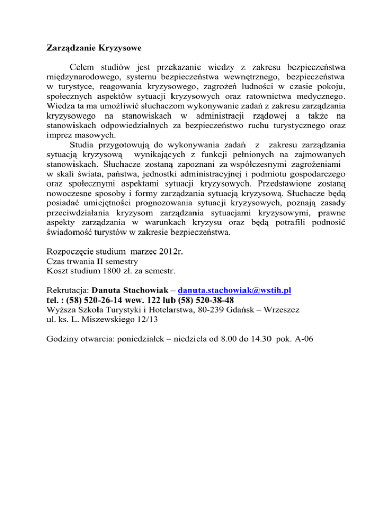 Zarządzanie Kryzysowe Celem studiów jest przekazanie wiedzy z zakresu bezpieczeństwa międzynarodowego, systemu bezpieczeństwa wewnętrznego, bezpieczeństwa w turystyce, reagowania kryzysowego, zagrożeń ludności w czasie pokoju, społecznych aspektów sytuacji kryzysowych oraz ratownictwa medycznego. Wiedza ta ma umożliwić słuchaczom wykonywanie zadań z zakresu zarządzania kryzysowego na stanowiskach w administracji rządowej a także na stanowiskach odpowiedzialnych za bezpieczeństwo ruchu turystycznego oraz imprez masowych. Studia przygotowują do wykonywania zadań z zakresu zarządzania sytuacją kryzysową wynikających z funkcji pełnionych na zajmowanych stanowiskach. Słuchacze zostaną zapoznani za współczesnymi zagrożeniami w skali świata, państwa, jednostki administracyjnej i podmiotu gospodarczego oraz społecznymi aspektami sytuacji kryzysowych. Przedstawione zostaną nowoczesne sposoby i formy zarządzania sytuacją kryzysową. Słuchacze będą posiadać umiejętności prognozowania sytuacji kryzysowych, poznają zasady przeciwdziałania kryzysom zarządzania sytuacjami kryzysowymi, prawne aspekty zarządzania w warunkach kryzysu oraz będą potrafili podnosić świadomość turystów w zakresie bezpieczeństwa. Rozpoczęcie studium marzec 2012r. Czas trwania II semestry Koszt studium 1800 zł. za semestr. Rekrutacja: Danuta Stachowiak – [email protected] tel. : (58) 520-26-14 wew. 122 lub (58) 520-38-48 Wyższa Szkoła Turystyki i Hotelarstwa, 80-239 Gdańsk – Wrzeszcz ul. ks. L. Miszewskiego 12/13 Godziny otwarcia: poniedziałek – niedziela od 8.00 do 14.30 pok. A-06