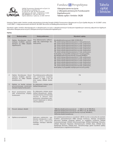 Fundusz & Perspektywa UNIQA Towarzystwo Ubezpieczeń na Życie S.A. 90-520 Łódź, ul. Gdańska 132 tel. 042 63 44 700, fax 042 63 65 003 Sąd Rejonowy dla Łodzi - Śródmieścia w Łodzi KRS 0000005751, NIP 554-100-15-22 Kapitał zakładowy i wpłacony: 23 285 720 PLN Ubezpieczenie na życie z Ubezpieczeniowymi Funduszami Kapitałowymi Tabela opłat i limitów 3K2B Tabela opłat i limitów Niniejsza Tabela opłat i limitów została zatwierdzona Uchwałą Zarządu UNIQA Towarzystwo Ubezpieczeń na Życie Spółka Akcyjna, Nr 55/2007 z dnia 14.05.2007 r. i mają zastosowanie od dnia 01.06.2007 dla umów ze składką jednorazową ozn. 3K2B. Wysokości opłat i limitów obowiązujących w ubezpieczeniu na życie z ubezpieczeniowym funduszem kapitałowym stanowią załącznik do Ogólnych Warunków Ubezpieczenia na życie z ubezpieczeniowymi funduszami kapitałowymi. K2B-T01 Opłaty L.p. Rodzaj opłaty Kiedy pobierana 1 Opłata likwidacyjna (koszt wykupu środków zgromadzonych na ORJU składek regularnych) Przy dokonywaniu całkowitego lub częściowego wykupu polisy 2 Opłata likwidacyjna (koszt wykupu środków zgromadzonych na ORJU składek dodatkowych) Przy dokonywaniu całkowitej lub częściowej wypłat y środków w ciągu 2 lat od dnia wpłaty składki dodatkowej 1% 3 Opłata za każdą zmianę procentowego podziału składek między funduszami Po dokonaniu zmiany przez Zakład Ubezpieczeń 0 zł 4 Koszt przeniesienia jednostek uczestnictwa między funduszami Po dokonaniu zmiany przez Zakład Ubezpieczeń - pobierana począwszy od trzynastej zmiany w danym roku polisowym (dwanaście pierwszych dyspozycji w danym roku bezpłatne) 10 zł 5 Procent alokacji składki 6 Opłata za zarządzanie Wysokość opłaty dla składki jednorazowej 5 000-19 999,99 zł 7% - jeżeli wykup dokonywany jest w 1 roku polisowym, 6% - jeżeli wykup dokonywany jest w 2 roku polisowym, 5% - jeżeli wykup dokonywany jest w 3 roku polisowym, 4% - jeżeli wykup dokonywany jest w 4 roku polisowym, 3% - jeżeli wykup dokonywany jest w 5 roku polisowym, 2% - jeżeli wykup dokonywany jest w 6 roku polisowym, 1% - jeżeli wykup dokonywany jest w 7 roku polisowym, brak opłaty w przypadku wykupu po 7 rocznicy polisy, dla składki jednorazowej równej i wyższej 20 000 zł 6% - jeżeli wykup dokonywany jest w 1 roku polisowym, 5% - jeżeli wykup dokonywany jest w 2 roku polisowym, 4% - jeżeli wykup dokonywany jest w 3 roku polisowym, 3% - jeżeli wykup dokonywany jest w 4 roku polisowym, 2% - jeżeli wykup dokonywany jest w 5 roku polisowym, 1% - jeżeli wykup dokonywany jest w 6 roku polisowym, brak opłaty w przypadku wykupu po 6 rocznicy polisy 98% dla składki jednorazowej od 5 000 zł do 19 999,99 zł, 100% dla składki jednorazowej od 20 000 zł do 99 999,99 zł, 101% dla składki jednorazowej równej i wyższej 100 000 zł , 100% dla składki dodatkowej Naliczana codziennie i pobierana miesięcznie w pierws z y m d n i u ro b o c z y m każdego miesiąca kalendarzowego Jest ustalana procentowo w wysokości 1,80 % rocznie w stosunku do wartości środków zgromadzonych ORJU danego funduszu, którego zarządzanie aktywami podlega niniejszej opłacie; za wyjątkiem Funduszu UNIQA Gwarantowanego, UNIQA Zrównoważonego, UNIQA Stabilnego Wzrostu, UNIQA Dłużnych Papierów Wartościowych, UNIQA Akcji, UNIQA Euro Stabilnego Wzrostu, UNIQA Euro Dynamicznego, gdzie wysokość opłaty określona jest w regulaminie funduszu. 1 Wartości maksymalne i minimalne L.p. Wysokość Rodzaj wartości 1 Minimalny procent części inwestycyjnej składki, jaki może być przekazywany na jeden fundusz 2 Minimalna wysokość składki jednorazowej oraz minimalna wartość ORJU składki jednorazowej po częściowym wykupie 3 Minimalna wysokość składki dodatkowej 10% 5 000,00 zł 500 zł Ubezpieczeniowe Fundusze Kapitałowe Środki pochodzące ze składek ubezpieczeniowych mogą być inwestowane w następujące fundusze kapitałowe: Ozn. Nazwa Ubezpieczeniowego Funduszu Kapitałowego Nazwa Funduszu Inwestycyjnego, do którego lokowane jest 100% aktywów odpowiedniego Ubezpieczeniowego Funduszu Kapitałowego A Fundusz UNIQA Gwarantowany „R” - B Fundusz UNIQA Akcji „R” - C Fundusz UNIQA Zrównoważony „R” - D Fundusz UNIQA Euro-Dynamiczny „R” - E Fundusz UNIQA Euro-Stabilnego Wzrostu „R” - F Fundusz UNIQA Dłużnych Papierów Wartościowych „R” - G Fundusz UNIQA Stabilnego Wzrostu „R” - H UNIQA Unikorona Pieniężny Unikorona Pieniężny FIO I UNIQA Unikorona Zrównoważony Unikorona Zrównoważony J UNIQA Unikorona Akcje Unikorona Akcje FIO K UNIQA Unikorona Obligacje Unikorona Obligacje FIO L UNIQA UniStoProcent Plus UniStoProcent Plus FIO M UNIQA UniAkcje Nowa Europa UniAkcje Nowa Europa FIO N UNIQA UniAktywna Alokacja Uni Aktywna Alokacja FIO O UNIQA UniGlobal UniGlobal FIO P UNIQA Legg Mason Pieniężny Legg Mason Pieniężny FIO Q UNIQA Legg Mason Zrównoważony Środkowoeuropejski Legg Mason Zrównoważony Środkowoeuropejski FIO R UNIQA Legg Mason Akcji Legg Mason Akcji FIO S UNIQA Legg Mason Obligacji Legg Mason Obligacji FIO T UNIQA Skarbiec Waga Skarbiec Waga U UNIQA Skarbiec Akcja Skarbiec Akcja V UNIQA Skarbiec Kasa Skarbiec Kasa W UNIQA Skarbiec Obligacja Skarbiec Obligacja X UNIQA Skarbiec Ochrony Kapitału Skarbiec Ochrony Kapitału Y UNIQA SEB 2 SEB 2 Z UNIQA SEB 1 SEB 1 AA UNIQA SEB 3 SEB 3 AB UNIQA SEB 5 SEB 5 AC UNIQA SEB 4 SEB 4 AD UNIQA Portfel Ochrony Kapitału inwestujący w Fundusz BZ WBK ARKA Ochrony Kapitału FIO Arka BZ WBK Ochrony Kapitału FIO AE UNIQA Portfel Zrównowazony inwestujący w Fundusz BZ WBK ARKA Zrównoważony FIO Arka BZ WBK Zrównoważony FIO AF UNIQA Portfel Akcji inwestujący w Fundusz BZ WBK ARKA Akcji FIO Arka BZ WBK Akcji FIO AG UNIQA Portfel Obligacji inwestujący w Fundusz BZ WBK ARKA Obligacji FIO Arka BZ WBK Obligacji FIO AH UNIQA Portfel Stabilnego Wzrostu inwestujący w Fundusz BZ WBK ARKA Stabilnego Wzrostu FIO Arka BZ WBK Stabilnego Wzrostu FIO AI 