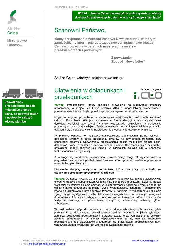 NEWSLETTER 2/2014 WIZJA: „Służba Celna innowacyjnie wykorzystująca wiedzę do świadczenia lepszych usług w erze cyfrowego stylu życia” Szanowni Państwo, Ministerstwo Finansów Mamy przyjemność przekazać Państwu Newsletter nr 2, w którym zamieściliśmy informacje dotyczące nowych usług, jakie Służba Celna wprowadziła w ostatnich miesiącach z myślą o przedsiębiorcach i podróżnych. Z poważaniem Zespół „Newsletter” Służba Celna wdrożyła kolejne nowe usługi: upoważniony przedsiębiorca będzie mógł zdjąć plombę celną, doładować towar, a następnie założyć własną plombę. Ułatwienia w doładunkach i przeładunkach Wywóz: Przedsiębiorcy, którzy posiadają pozwolenie na stosowanie procedury uproszczonej w miejscu od końca stycznia 2014 r. mogą łatwiej doładowywać i przeładowywać towary objęte uprzednio procedurą wywozu w polskim urzędzie. Mogą oni uzyskać pozwolenie na samodzielne zdejmowanie i nakładanie zamknięć celnych. Pozwolenie takie jest wydawane w formie decyzji administracyjnej przez dyrektora właściwej izby celnej i stanowi rozszerzenie pozwolenia na stosowanie procedury uproszczonej w miejscu. Takie uprawnienia można otrzymać także w przypadku ubiegania się o nowe pozwolenie na stosowanie procedury uproszczonej w miejscu. W praktyce oznacza to możliwość samodzielnego zdejmowania plomb celnych i doładunku towarów, a także przeładunku towarów na inny środek transportu przy konsolidacji przesyłek. Upoważniony przedsiębiorca będzie mógł zdjąć plombę celną, doładować towar, a następnie założyć własną plombę. Dotychczas takie doładunki i przeładunki mogły odbywać się jedynie w oddziałach celnych lub w obecności funkcjonariusza Służby Celnej. Z analogicznej możliwości upoważnieni przedsiębiorcy mogą skorzystać także w przypadku doładunków i przeładunków towarów, które uprzednio zostały odprawione w wywozie bez plomb celnych. Ułatwienie dotyczy wyłącznie podmiotów, które stosowanie procedury uproszczonej w miejscu. posiadają pozwolenie na Tranzyt: Od końca stycznia 2014 r. przedsiębiorcy mogą również łatwiej przeładowywać towary w tranzycie wspólnotowym/wspólnym (w transporcie drogowym), jeżeli na pojazd wcześniej nie założono plomb celnych. W takim przypadku naczelnik urzędu celnego (na wniosek zainteresowanego podmiotu) wyda wyprzedzającą, generalną i bezterminową zgodę na dokonywanie przeładunków towarów w tranzycie. Z wnioskiem o udzielenie zgody mogą występować osoby faktycznie zaangażowane w operacje tranzytowe (korzystające lub niekorzystające z uproszczeń w tranzycie), które przeładunków faktycznie dokonują np. przewoźnicy, spedytorzy, przeładowcy, odbiorcy, główni zobowiązani. Wniosek należy złożyć do naczelnika urzędu celnego właściwego dla miejsca, gdzie przeładunki są dokonywane. Wnioskodawca powinien wskazać, w jakich sytuacjach zamierza dokonywać przeładunków i dlaczego uważa je za konieczne oraz powinien zawrzeć oświadczenie, że ponosi odpowiedzialność za to, aby po dokonanym przeładunku, środki przewozowe z ładunkiem nie przekraczały dopuszczalnych norm wagowych. Zgoda wydawana jest w formie decyzji administracyjnej. CENTRUM INFORMACJI SŁUŻBY CELNEJ | tel.: 801 470 477 | +48 33 85 76 251 | e-mail: [email protected] www.sluzbacelna.gov.pl NEWSLETTER 2/2014 WIZJA: „Służba Celna innowacyjnie wykorzystująca wiedzę do świadczenia lepszych usług w erze cyfrowego stylu życia” Uproszczenie nie dotyczy procedury TIR lub innych niż drogowy rodzajów transportu. Ministerstwo Finansów Korzystając z tych ułatwień, nie będzie trzeba jechać do oddziału celnego, ani wnioskować o obecność funkcjonariusza Służby Celnej, a towar będzie można doładować lub przeładować szybciej i z wykorzystaniem własnych zasobów, sprzętu i wyposażenia. Informacja uzupełniająca dla eksporterów nt. zdejmowania i zakładania zamknięć celnych w procesie konsolidacji przesyłek: www.finanse.mf.gov.pl/documents/766655/1106201/28012014_konsolidacja Dodatkowe wyjaśnienia dotyczące zgody generalnej na przeładunki na inny środek transportu w tranzycie: www.finanse.mf.gov.pl/documents/766655/1185294/info_zgoda-generalna_przeladunki informacja nt. procedury uproszczonej (m.in. procedury w miejscu – p.6 str. 39): www.finanse.mf.gov.pl/documents/766655/2242017/26022013_wytyczne_PU Strefy buforowe na spiętrzenia towarowego ruchu granicznego strefy buforowe to uporządkowanie kolejki, poprawa bezpieczeństwa ruchu i odpoczynek dla kierowców W sytuacjach znaczącego wzrostu ruchu towarowego przez granicę, gdy na przejścia graniczne dziennie przyjeżdża większa niż zazwyczaj liczba samochodów ciężarowych, Służba Celna podejmuje działania niezbędne do utrzymania płynnego ruchu granicznego. Oprócz działań ukierunkowanych ściśle na przyspieszenie odpraw w oddziałach celnych granicznych (takich jak: zwiększona obsada kadrowa, system wczesnego ostrzegania o sytuacjach nadzwyczajnych pomiędzy służbami obu państw granicznych, elektroniczne zgłoszenia celne ograniczające udział funkcjonariuszy do niezbędnego minimum) Służba Celna, razem z innymi zainteresowanymi służbami mundurowymi oraz służbami podległymi wojewodom, wprowadziła nowy system pozwalający na uporządkowanie kolejki przed przejściami granicznymi. Mając na uwadze wyeliminowanie zjawiska objeżdżania kierowców korzystających z obowiązkowego odpoczynku bezpośrednio przed granicą, a także bezpieczeństwo na drogach dojazdowych, okresowo uruchomiane są specjalne strefy buforowe. Są one przeznaczone dla samochodów ciężarowych wyjeżdżających z Polski. Polegają one na regulacji ruchu w kilkukilometrowej odległości od przejść granicznych. Samochody są zatrzymywane za pomocą sygnalizacji świetlnej lub przez mobilne patrole, a przejazd do strefy bezpośredniego przekraczania granicy