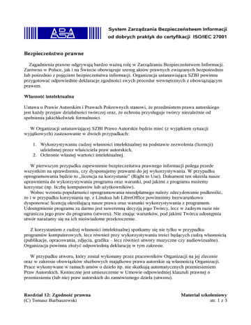 System Zarządzania Bezpieczeństwem Informacji od dobrych praktyk do certyfikacji ISO/IEC 27001 Bezpieczeństwo prawne Zagadnienia prawne odgrywają bardzo ważną rolę w Zarządzaniu Bezpieczeństwem Informacji. Zarówno w Polsce, jak i na Świecie obowiązuje szereg aktów prawnych związanych bezpośrednio lub pośrednio z pojęciem bezpieczeństwa informacji. Organizacja ustanawiająca SZBI powinna przygotować odpowiednie deklaracje zgodności swych procedur wewnętrznych z obowiązującym prawem. Własność intelektualna Ustawa o Prawie Autorskim i Prawach Pokrewnych stanowi, że przedmiotem prawa autorskiego jest każdy przejaw działalności twórczej oraz, że ochrona przysługuje twórcy niezależnie od spełnienia jakichkolwiek formalności. W Organizacji ustanawiającej SZBI Prawo Autorskie będzie mieć (z wyjątkiem sytuacji wyjątkowych) zastosowanie w dwóch przypadkach: 1. Wykorzystywaniu cudzej własności intelektualnej na podstawie zezwolenia (licencji) udzielonej przez właściciela praw autorskich, 2. Ochronie własnej wartości intelektualnej. W pierwszym przypadku zapewnienie bezpieczeństwa prawnego informacji polega przede wszystkim na sprawdzeniu, czy dysponujemy prawami do jej wykorzystywania. W przypadku oprogramowania będzie to „licencja na korzystanie” (Right to Use). Dokument ten określa nasze uprawnienia do wykorzystywania programu oraz warunki, pod jakimi z programu możemy korzystać (np. liczbę komputerów lub użytkowników). Wobec wzrostu popularności oprogramowania nieodpłatnego należy zdecydowanie podkreślić, że i w przypadku korzystania np. z Linuksa lub LibreOffice powinniśmy bezwarunkowo dysponować licencją określającą nasze prawa oraz warunki wykorzystywania z programem. Udostępnienie programu za darmo jest suwerenną decyzją jego Twórcy, lecz w żadnym razie nie ogranicza jego praw do programu (utworu). Nie znając warunków, pod jakimi Twórca udostępnia utwór narażamy się na ich nieświadome przekroczenie. Z korzystaniem z cudzej własności intelektualnej spotkamy się nie tylko w przypadku programów komputerowych, lecz również przy wykorzystywaniu treści będących cudzą własnością (publikacje, opracowania, zdjęcia, grafika – lecz również utwory muzyczne czy audiowizualne). Organizacja powinna złożyć odpowiednią deklarację w tym zakresie. W przypadku utworu, który został wykonany przez pracowników Organizacji na jej zlecenie oraz w zakresie obowiązków służbowych majątkowe prawa autorskie są własnością Organizacji. Prace wykonywane w ramach umów o dzieło itp. nie skutkują automatycznych przeniesieniem Praw Autorskich. Konieczne jest umieszczenie w Umowie odpowiedniej klauzuli prawnej o przeniesieniu (lub nie) praw autorskich do zamówionego dzieła (utworu). Rozdział 12: Zgodność prawna (C) Tomasz Barbaszewski Materiał szkoleniowy str. 1 z 3 System Zarządzania Bezpieczeństwem Informacji od dobrych praktyk do certyfikacji ISO/IEC 27001 Dane osobowe Jeśli Organizacja przetwarza dane osobowe powinna spełnić wymagania odpowiedniej Ustawy, a w szczególności określić wymagany poziom ochrony danych osobowych, opracować Politykę bezpieczeństwa ochrony danych osobowych oraz zgłosić zbiór danych osobowych Generalnemu Inspektorowi Ochrony Danych Osobowych i przestrzegać jego zaleceń. Dokumentacja medyczna oraz inne przepisy branżowe W niektórych instytucjach (np. w bankach, szpitalach) mogą obowiązywać dodatkowe przepisy bankowe związane z zapewnieniem bezpieczeństwa informacji (np. dokumentacji medycznej). SZBI podlega sprawdzaniu na zgodność z tymi przepisami. Informacje niejawne Sprawy związane z zarządzaniem informacjami niejawnymi reguluje Ustawa o Ochronie Informacji Niejawnych (z 5 sierpnia 2010 r.). Nadzór na ochroną informacji niejawnych oraz zabezpieczeniem pomieszczeń oraz systemów do ich przechowywania i przetwarzania sprawują ABW oraz SKW. Kierownictwo Organizacji zobowiązane jest wyznaczenia pełnomocnika do ochrony informacji niejawnych do współpracy z z tymi Instytucjami. Wymagania w zakresie bezpieczeństwa informacji stawiane podmiotom publicznym Projekt rozporządzenia RM przewiduje obowiązkowe ( w ciągu 2 lat) wprowadzenie przez wszystkie podmioty realizujące zadania publiczne systemów zarządzania bezpieczeństwem informacji opartych o zalecenia norm ISO/IEC: Projekt 22‐04‐2011 ROZPORZ DZENIE RADY MINISTRÓW z dnia ……………………………… 2011 r. w sprawie Krajowych Ram Interoperacyjno ci, minimalnych wymaga dla rejestrów publicznych i wymiany informacji w postaci elektronicznej oraz minimalnych wymaga dla systemów teleinformatycznych Na podstawie art. 18 ustawy z dnia 17 lutego 2005 r. o informatyzacji dzia alno ci podmiotów realizuj cych zadania publiczne (Dz. U. Nr 64, poz. 565, z pó n. zm. 1)) zarz dza si , co nast puje: ... § 14. 1. Podmiot realizuj cy zadania publiczne opracowuje i ustanawia, wdra a i eksploatuje, monitoruje i przegl da oraz utrzymuje i doskonali system zarz dzania bezpiecze stwem informacji zapewniaj cy poufno , dost pno i integralno informacji z uwzgl dnieniem takich atrybutów jak autentyczno , rozliczalno , niezaprzeczalno i niezawodno . Rozdział 12: Zgodność prawna (C) Tomasz Barbaszewski Materiał szkoleniowy str. 2 z 3 System Zarządzania Bezpieczeństwem Informacji od dobrych praktyk do certyfikacji ISO/IEC 27001 ... 3. System zarz dzania bezpiecze stwem informacji spe nia wymogi, o których mowa w ust. 1 i 2, je eli zosta opracowany na podstawie Polskiej Normy PN ISO/IEC 27001:2007 „Technika informatyczna – Techniki bezpiecze stwa – Systemy zarz dzania bezpiecze stwem informacji – Wymagania” wraz z normami uzupe niaj cymi lub normy go zast puj cej, a ustanawianie zabezpiecze , zarz dzanie ryzykiem oraz audytowanie odbywa si na podstawie Polskich Norm zwi zanych z t norm , w tym: 1) PN‐ISO/IEC 17799:2007 “Technika informatyczna – Techniki bezpiecze stwa 