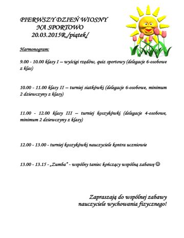 PIERWSZY DZIEŃ WIOSNY NA SPORTOWO 20.03.2015R./piątek/ Harmonogram: 9.00 - 10.00 klasy I – wyścigi rzędów, quiz sportowy (delegacje 6-osobowe z klas) 10.00 - 11.00 klasy II – turniej siatkówki (delegacje 6-osobowe, minimum 2 dziewczyny z klasy) 11.00 - 12.00 klasy III – turniej koszykówki (delegacje 4-osobowe, minimum 2 dziewczyny z klasy) 12.00 - 13.00 - turniej koszykówki nauczyciele kontra uczniowie 13.00 - 13.15 - „Zumba” - wspólny taniec kończący wspólną zabawę Zapraszają do wspólnej zabawy nauczyciele wychowania fizycznego!