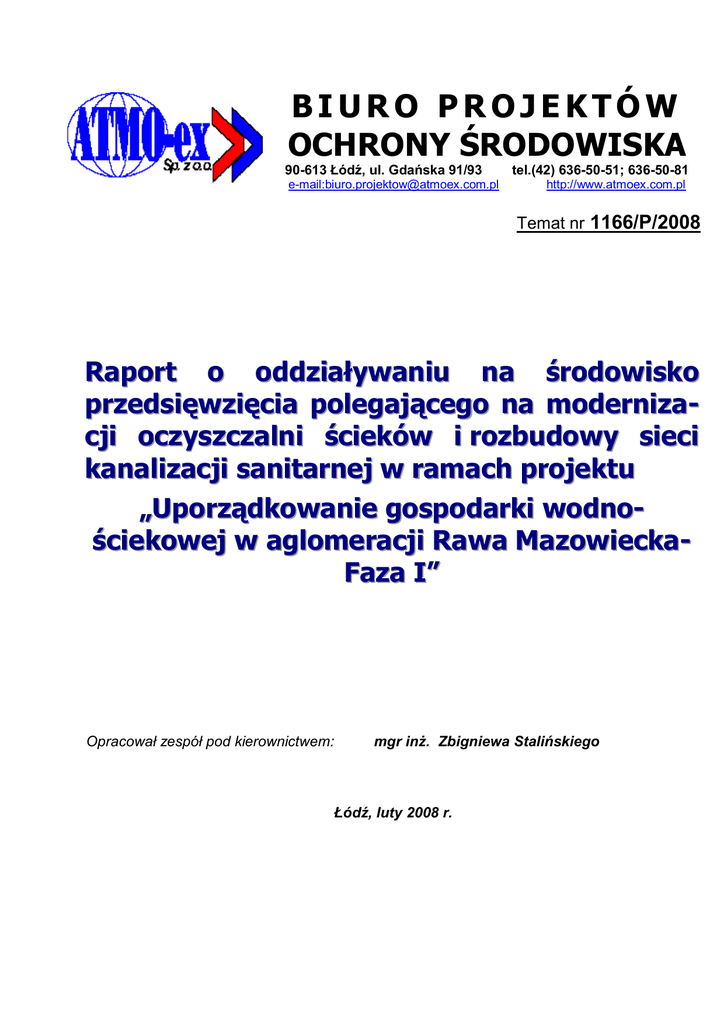 BIURO PROJEKTÓW OCHRONY ŚRODOWISKA 90-613 Łódź, ul. Gdańska 91/93 e-mail:[email protected] tel.(42) 636-50-51; 636-50-81 http://www.atmoex.com.pl Temat nr 1166/P/2008 Raport o oddziaływaniu na środowisko przedsięwzięcia polegającego na modernizacji oczyszczalni ścieków i rozbudowy sieci kanalizacji sanitarnej w ramach projektu „Uporządkowanie gospodarki wodnościekowej w aglomeracji Rawa MazowieckaFaza I” Opracował zespół pod kierownictwem: mgr inż. Zbigniewa Stalińskiego Łódź, luty 2008 r. Zleceniodawca: ILF Consulting Engineers Polska Sp. z o.o. 02-676 Warszawa, ul. Postępu 15 RAPORT O ODDZIAŁYWANIU NA ŚRODOWISKO P PR RZ ZE ED DS SIIĘ ĘW WZ ZIIĘ ĘC CIIA A m mo od deerrn niizzaaccjjii o occzzyysszzcczzaalln nii śścciieekkó ów w ii rro ozzb bu ud do ow wyy ssiieeccii kkaan naalliizzaaccjjii ssaan niittaarrn neejj w w rraam maacch hp prro ojjeekkttu u „UPPO OR RZ ZĄ ĄD DK KO OW WA AN NIIEE G GO OS SP PO OD DA AR RK KII W WO OD DN NO O-Ś ŚC CIIEEK KO OW WEEJJ W WA AG GLLO OM MEER RA AC CJJII RA AW WA A MA AZ ZO OW WIIEEC CK KA A- FFA AZ ZA A II” SPIS TREŚCI: 1 WSTĘP 1 2 PODSTAWA PRAWNA 2 2.1 2.2 CHARAKTERYSTYKA OCZYSZCZALNI W ŻYDOMICACH 3 3.1 3.2 4 LOKALIZACJA OCZYSZCZALNI TECHNOLOGIA OCZYSZCZANIA ŚCIEKÓW CHARAKTERYSTYKA KANALIZACJI I PRZEPOMPOWNI 4.1 4.2 5 KANALIZACJA SANITARNA PRZEPOMPOWNIA ŚCIEKÓW OPIS ANALIZOWANYCH WARIANTÓW 2 4 6 6 8 17 17 19 21 5.1 5.2 W ARIANT POLEGAJĄCY NA NIEPODEJMOWANIU PRZEDSIĘWZIĘCIA W ARIANT PROJEKTOWANY MODERNIZACJI OCZYSZCZALNI- NAJKORZYSTNIEJSZY DLA 21 ŚRODOWISKA 5.3 5.4 W ARIANT PROJEKTOWANY – MODERNIZACJA KANALIZACJI SANITARNEJ W ARIANT PROJEKTOWANY – PRZEBUDOWA (MODERNIZACJA) POMPOWNI GŁÓWNEJ (PG) 22 39 42 OPIS ELEMENTÓW PRZYRODNICZYCH OBJĘTYCH ZAKRESEM PRZEWIDYWANEGO ODDZIAŁYWANIA PLANOWANEGO PRZEDSIĘWZIĘCIA 43 6 6.1 6.2 6.3 6.4 6.5 7 W YMAGANIA PRAWNE DOTYCZĄCE OCHRONY ŚRODOWISKA I UDZIAŁU SPOŁECZNEGO W PROCESIE INWESTYCYJNYM W POLSCE W ŚWIETLE WYMAGAŃ DYREKTYWY OOŚ (DYREKTYWA 85/337/EWG, ZMIENIONA PRZEZ DYREKTYWĘ 97/11/WE) KLASYFIKACJA INWESTYCJI WG PRZEPISÓW POLSKICH I DYREKTYWY OOŚ MORFOLOGIA I HYDROGRAFIA TERENU W ARUNKI HYDROLOGICZNE W ARUNKI GRUNTOWE STAN CZYSTOŚCI POWIETRZA W ARUNKI KLIMATYCZNE ZAGROŻENIA DLA ZABYTKÓW 43 45 47 47 48 50 OKREŚLENIE PRZEWIDYWANEGO ODDZIAŁYWANIA NA ŚRODOWISKO 8 8.1 8.2 8.3 8.4 FAZA REALIZACJI PRZEDSIĘWZIĘCIA FAZA EKSPLOATACJI STANY AWARYJNE ODDZIAŁYWANIE TRANSGRANICZNE OPIS PRZEWIDYWANYCH ZNACZĄCYCH ODDZIAŁYWAŃ NA ŚRODOWISKO MODERNIZOWANEJ OCZYSZCZALNI W ŻYDOMICACH 9 9.1 9.2 9.3 9.4 9.5 9.6 10 11 11.1 11.2 11.3 12 12.1 12.2 13 PROGNOZA ODDZIAŁYWANIA AKUSTYCZNEGO ODDZIAŁYWANIE NA POWIETRZE ATMOSFERYCZNE ODBIORNIK – RZEKA RAWKA GOSPODARKA ODPADAMI ODDZIAŁYWANIE NA ŚWIAT ROŚLINNY I ZWIERZĘCY W PŁYW OCZYSZCZALNI NA ZDROWIE I WARUNKI ŻYCIA 50 50 54 55 56 56 57 74 84 86 87 88 OPIS PRZEWIDYWANYCH ZNACZĄCYCH ODDZIAŁYWAŃ NA ŚRODOWISKO MODERNIZOWANEJ KANALIZACJI SANITARNEJ 88 WPŁYW PRZEDSIĘWZIĘCIA NA OBSZARY NATURA 2000 93 OBSZARY NATURA 2000 W BEZPOŚREDNIM SĄSIEDZTWIE PLANOWANEGO PRZEDSIĘWZIĘCIA 93 ODDZIAŁYWANIE PRZEDSIĘWZIĘCIA NA OBSZAR DOLINY RAWKI 101 OPIS PRZEWIDYWANYCH DZIAŁAŃ MAJĄCYCH NA CELU ZAPOBIEGANIE, OGRANICZANIE LUB KOMPENSACJĘ PRZYRODNICZĄ NEGATYWNYCH ODDZIAŁYWAŃ NA ŚRODOWISKO 106 PROPONOWANY MONITORING ODDZIAŁYWANIA PLANOWANEGO PRZEDSIĘWZIĘCIA NA ETAPIE JEGO BUDOWY I EKSPLOATACJI ETAP BUDOWY ETAP EKSPLOATACJI PORÓWNANIE PROPONOWANEJ TECHNOLOGII Z TECHNOLOGIĄ SPEŁNIAJĄCĄ WYMAGANIA USTAWY PRAWO OCHRONY ŚRODOWISKA 107 107 107 108 14 WSKAZANIE, CZY DLA PLANOWANEGO PRZEDSIĘWZIĘCIA KONIECZNE JEST USTANOWIENIE OBSZARU OGRANICZONEGO UŻYTKOWANIA 111 15 ANALIZA MOŻLIWYCH KONFLIKTÓW SPOŁECZNYCH ZWIĄZANYCH Z PLANOWANYM PRZEDSIĘWZIĘCIEM 112 16 WSKAZANIE TRUDNOŚCI WYNIKAJĄCYCH Z NIEDOSTATKÓW TECHNIKI LUB LUK WE WSPÓŁCZESNEJ WIEDZY, JAKIE NAPOTKANO, OPRACOWUJĄC RAPORT 113 17 ŹRÓDŁA INFORMACJI STANOWIĄCE PODSTAWĘ DO SPORZĄDZENIA RAPORTU 114 18 STRESZCZENIE W JĘZYKU NIESPECJALISTYCZNYM 117 Biuro Projektów Ochrony Środowiska ATMO-ex Sp. z o.o. 1 1166/P/2008 str.1 Wstęp Podstawą opracowania jest umowa nr 1166/P/2008, zawarta pomiędzy ILF Consulting Engineers Polska Sp. z o.o. z siedzibą w Warszawie, a Biurem Projektów Ochrony Środowiska ATMO-ex Sp. z o.o. w Łodzi m.in. na wykonanie dokumentacji, służącej do uzyskania decyzji o środowiskowych uwarunkowaniach dla przedsięwzięcia polegającego na modernizacji istniejącej oczyszczalni ścieków oraz rozbudowy kanalizacji sanitarnej w Rawie Mazowieckiej. Inwestycja prowadzona będzie na terenie działek oznaczonych w ewidencji gruntów położonych na terenie miasta Rawa Mazowiecka (rozbudowa kanalizacji) o nr nr: 1-508, 1-136, 1-511, 1-300, 1-336/2, 1-554, 1-555, 1-560, 1-330/11, 1-330/17, 1-334/2, 1-334/1, 1-328/2, 1-327/2, 1-326/2, 1-325/2, 1-324/2, 2-291/4, 2-5, 2-290/1, 2-290/2, 2-230/1, 2-39/1, 2-39/2, 3-267, 3-268/1, 3-269, 3-22/2, 3-221/1, 3-221/4, 3-221/2, 3-221/3, 4-158, 4-258, 4-259, 4-261, 4-263, 4-264, 4-440, 4-388/6, 4-381/2, 4-381/7, 4-471/3, 4-471/4, 4-471/5, 4-42, 4-434, 4-323, 4-322/2, 4-448/5, 4-448/6, 4-448/7, 4-198/1, 4-198/2, 4-308/6, 4-307/3, 4-313/1, 4-470/8, 4-308/7, 4-96, 4-301/1, 4-302/1, 4-217, 4-262, 4-260, 4-159, 4-75, 4-300, 4-692, 4-670/5, 4-288, 4-349, 4-119, 4-120, 4-308/5, 5-3/1, 5-2, 5-7, 5-75, 5-40, 5-41, 5-33, 5-36, 5-18/4, 5-25, 5-3/13, 5-1, 7-439, 7-39, 7-91, 7-127, 7-310, 7-137/2, 7-137/3, 7-1/2, 7-1/3, 7-1/5, 7-1/8, 7-254/1, 7-374, 7-413, 7-387, 7-1/8, 7-1/9, 7-426, 7-56, 7-260, 7-75, 7-400, 7-285, 7-46, 7-47, 7-67, 7-92, 7-137/2, 7-22/3, 8-206, 8-207, 8-330, 8-310/2, 8-324/2, 8-323, 8-325/2, 8-327, 8-328/1, 8-328/7, 8-318/2, 8-318/3, 8-331, 8-289/4, 8-361,8-321, oraz (oczyszczalnia ścieków) na terenie działek oznaczonych w ewidencji gruntów położonych na terenie gminy Rawa Mazowiecka w obrębie Konopnica 476,648, 653/2, 660, 755,765, 766, 767 -nr nr : 359, 364/1, 394,