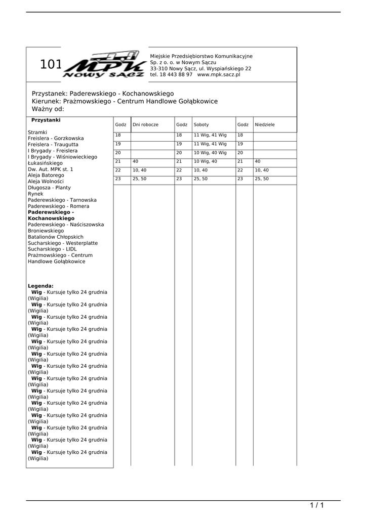 Miejskie Przedsiębiorstwo Komunikacyjne Sp. z o. o. w Nowym Sączu 33-310 Nowy Sącz, ul. Wyspiańskiego 22 tel. 18 443 88 97 www.mpk.sacz.pl 101 Przystanek: Paderewskiego - Kochanowskiego Kierunek: Prażmowskiego - Centrum Handlowe Gołąbkowice Ważny od: Przystanki Godz Stramki Freislera - Gorzkowska Freislera - Traugutta I Brygady - Freislera I Brygady - Wiśniowieckiego Łukasińskiego Dw. Aut. MPK st. 1 Aleja Batorego Aleja Wolności Długosza - Planty Rynek Paderewskiego - Tarnowska Paderewskiego - Romera Paderewskiego Kochanowskiego Paderewskiego - Naściszowska Broniewskiego Batalionów Chłopskich Sucharskiego - Westerplatte Sucharskiego - LIDL Prażmowskiego - Centrum Handlowe Gołąbkowice Legenda: Wig - Kursuje (Wigilia) Wig - Kursuje (Wigilia) Wig - Kursuje (Wigilia) Wig - Kursuje (Wigilia) Wig - Kursuje (Wigilia) Wig - Kursuje (Wigilia) Wig - Kursuje (Wigilia) Wig - Kursuje (Wigilia) Wig - Kursuje (Wigilia) Wig - Kursuje (Wigilia) Wig - Kursuje (Wigilia) Wig - Kursuje (Wigilia) Wig - Kursuje (Wigilia) Wig - Kursuje (Wigilia) Dni robocze Godz Soboty Godz 18 18 11 Wig, 41 Wig 18 19 19 11 Wig, 41 Wig 19 20 20 10 Wig, 40 Wig 20 Niedziele 21 40 21 10 Wig, 40 21 40 22 10, 40 22 10, 40 22 10, 40 23 25, 50 23 25, 50 23 25, 50 tylko 24 grudnia tylko 24 grudnia tylko 24 grudnia tylko 24 grudnia tylko 24 grudnia tylko 24 grudnia tylko 24 grudnia tylko 24 grudnia tylko 24 grudnia tylko 24 grudnia tylko 24 grudnia tylko 24 grudnia tylko 24 grudnia tylko 24 grudnia 1/1 Powered by TCPDF (www.tcpdf.org)
