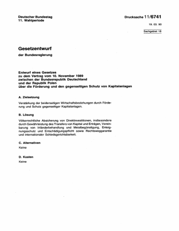 Deutscher Bundestag 11. Wahlperiode Drucksache 11/6741 19. 03. 90 Sachgebiet 18 Gesetzentwurf der Bundesregierung Entwurf eines Gesetzes zu dem Vertrag vom 10. November 1989 zwischen der Bundesrepublik Deutschland und der Republik Polen über die Förderung und den gegenseitigen Schutz von Kapitalanlagen A. Zielsetzung Verstärkung der beiderseitigen Wirtscha ftsbeziehungen durch Förderung und Schutz gegenseitiger Kapitalanlagen. B. Lösung Völkerrechtliche Absicherung von Direktinvestitionen, insbesondere durch Gewährleistung des Transfers von Kapital und Erträgen, Vereinbarung von Inländerbehandlung und Meistbegünstigung, Enteignungsschutz und Entschädigungspflicht sowie Rechtsweggarantie und internationaler Schiedsgerichtsbarkeit. C. Alternativen Keine D. Kosten Keine Deutscher Bundestag — 11. Wahlperiode Bundesrepublik Deutschland Der Bundeskanzler 121 (421) — 651 09 — Ka 65/90 Bonn, den 19. März 1990 An den Präsidenten des Deutschen Bundestages Hiermit übersende ich den von der Bundesregierung beschlossenen Entwu rf Bundesrepublik Deutschland und der Republik Polen über die Förderung und den gegenseitigen Schutz von Kapitalanlagen mit Begründung und Vorblatt. Ich bitte, die Beschlußfassung des Deutschen Bundestages herbeizuführen. Federführend ist der Bundesminister für Wi rtschaft. Der Gesetzentwurf ist dem Bundesrat am 23. Februar 1990 als besonders eilbedürftig zugeleitet worden. Die Stellungnahme des Bundesrates zu dem Gesetzentwurf sowie die Auffassung der Bundesregierung zu der Stellungnahme des Bundesrates werden nachgereicht. Kohl einsGtzudmVeragvo10.Nmber98zwischnd Drucksache 11/6741 Deutscher Bundestag — 11. Wahlperiode Drucksache 11/6741 Entwurf Gesetz zu dem Vertrag vom 10. November 1989 zwischen der Bundesrepublik Deutschland und der Republik Polen über die Förderung und den gegenseitigen Schutz von Kapitalanlagen Der Bundestag hat mit Zustimmung des Bundesrates das folgende Gesetz beschlossen: Artikel 1 Dem in Warschau am 10. November 1989 unterzeichneten Vertrag zwischen der Bundesrepublik Deutschland und der Volksrepublik Polen über die Förderung und den gegenseitigen Schutz von Kapitalanlagen und dem dazugehörigen Protokoll vom selben Tage sowie dem Notenwechsel vom 31. Januar/ 29. März 1990 wird zugestimmt. Der Vertrag, das Protokoll und der Notenwechsel werden nachstehend veröffentlicht. Artikel 2 Dieses Gesetz gilt auch im Land Berlin, sofern das Land Berlin die Anwendung dieses Gesetzes feststellt. Artikel 3 (1) Dieses Gesetz tritt am Tage nach seiner Verkündung in Kraft . (2) Der Tag, an dem der Vertrag nach seinem Artikel 14 Abs. 2 und das Protokoll in Kra ft treten, ist im Bundesgesetzblatt bekanntzugeben. Begründung zum Vertragsgesetz Zu Artikel 1 Zu Artikel 3 Auf den Vertrag findet Artikel 59 Abs. 2 Satz 1 des Grundgesetzes Anwendung, da er sich auf Gegenstände der Bundesgesetzgebung bezieht. Die Bestimmung des Absatzes 1 entspricht dem Erfordernis des Artikels 82 Abs. 2 des Grundgesetzes. Die Zustimmung des Bundesrates ist nach Artikel 105 Abs. 3 des Grundgesetzes erforderlich, weil das im Vertrag vereinbarte Diskriminierungsverbot sich auch auf Steuern bezieht, deren Aufkommen den Ländern oder den Gemeinden ganz oder zum Teil zufließt. Zu Artikel 2 Der Vertrag soll auch auf das Land Berlin Anwendung finden; das Gesetz enthält daher die übliche Berlin Klausel. - Nach Absatz 2 ist der Zeitpunkt, in dem der Vertrag nach seinem Artikel 14 Abs. 2 und das Protokoll in Kra ft treten, im Bundesgesetzblatt bekanntzugeben. Schlußbemerkung Bund, Länder und Gemeinden werden durch die Ausführung des Gesetzes nicht mit Kosten belastet. Auswirkungen auf die Einzelpreise und das Preisniveau, insbesondere auf das Verbraucherpreisniveau, sind nicht zu erwarten, da es sich um einen Rechtsrahmen handelt, der über den in der Bundesrepublik Deutschland ohnehin bestehenden Rechtsschutz nicht hinausgeht. Drucksache 11/6741 Deutscher Bundestag — 11. Wahlperiode Vertrag zwischen der Bundesrepublik Deutschland und der Volksrepublik Polen über die Förderung und den gegenseitigen Schutz von Kapitalanlagen Umowa mię dzy Republiką Federaln ą Niemiec a Polską Rzecząpospolitą Ludową w sprawie popierania i wzajemnej ochrony inwestycji Die Vertragsparteien — Umawiające się Strony, in dem Wunsch, die beiderseitige wi rtschaft liche Zusammenarbeit zu vertiefen, pragnąc pogłębić obustronn ą współpracą gospodarczą, in dem Bestreben, günstige Bedingungen für gegenseitige Kapitalanlagen zu schaffen, dążąc do stworzenia korzystnych warunków dla wzajemnych inwestycji, in der Erkenntnis, daß eine Förderung dieser Kapitalanlagen und ihr Schutz auf der Grundlage dieses Vertrags zur Weiterentwicklung der wi rt schaft lichen Initiative in diesem Bereich dienen werden — uznając, że popieranie tych inwestycji i ich ochrona na podstawie niniejszej Umowy służyć będą dalszemu rozwojowi inicjatyw gospodarczych w tej dziedzinie — haben folgendes vereinbart: Artikel 1 (1) In diesem Vertrag uzgodniły, co następuje: Artykul 1 1. W rozumieniu niniejszej Umowy a) umfaßt der Begriff „Kapitalanlage" alle Arten von Vermögenswerten, die der Investor der einen Vertragspartei im Gebiet der anderen Vertragspartei gemäß deren Gesetzgebung anlegt, insbesondere a) pojęcie „inwestycja" obejmuje wszelkie mienie, które inwestor jednej Umawiającej sie Strony inwestuje na terytorium drugiej Umawiającej si ę Strony zgodnie z jej ustawodawstwem, a w szczególności: — Eigentum an beweglichen und unbeweglichen Sachen sowie sonstige dingliche Rechte wie Hypotheken und Pfandrechte; — własność ruchomości i nieruchomości oraz wszelkie inne prawa rzeczowe, takie jak hipoteka i prawo zastawu; — Anteilsrechte an Gesellschaften und andere Arten von Beteiligungen; — akcje, udziały oraz inne rodzaje uczestnictwa w spó łkach; — Ansprüche auf Geld, das verwendet wurde, um einen wirtschaftlichen Wert zu schaffen, oder Ansprü