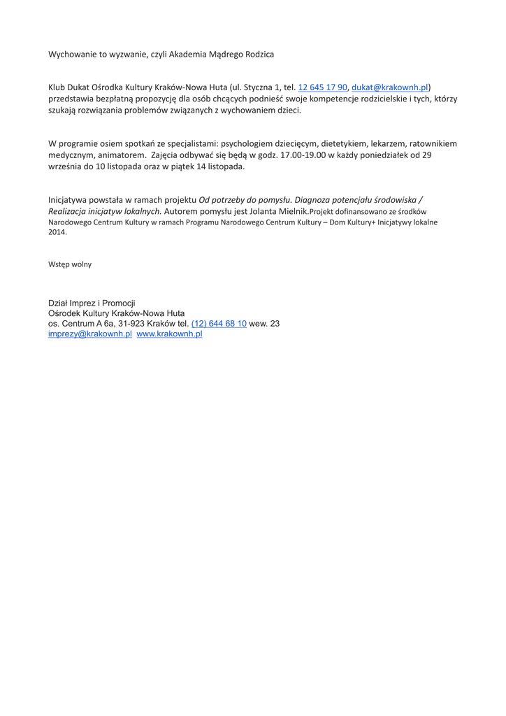 Wychowanie to wyzwanie, czyli Akademia Mądrego Rodzica Klub Dukat Ośrodka Kultury Kraków-Nowa Huta (ul. Styczna 1, tel. 12 645 17 90, [email protected]) przedstawia bezpłatną propozycję dla osób chcących podnieść swoje kompetencje rodzicielskie i tych, którzy szukają rozwiązania problemów związanych z wychowaniem dzieci. W programie osiem spotkań ze specjalistami: psychologiem dziecięcym, dietetykiem, lekarzem, ratownikiem medycznym, animatorem. Zajęcia odbywać się będą w godz. 17.00-19.00 w każdy poniedziałek od 29 września do 10 listopada oraz w piątek 14 listopada. Inicjatywa powstała w ramach projektu Od potrzeby do pomysłu. Diagnoza potencjału środowiska / Realizacja inicjatyw lokalnych. Autorem pomysłu jest Jolanta Mielnik.Projekt dofinansowano ze środków Narodowego Centrum Kultury w ramach Programu Narodowego Centrum Kultury – Dom Kultury+ Inicjatywy lokalne 2014. Wstęp wolny Dział Imprez i Promocji Ośrodek Kultury Kraków-Nowa Huta os. Centrum A 6a, 31-923 Kraków tel. (12) 644 68 10 wew. 23 [email protected] www.krakownh.pl