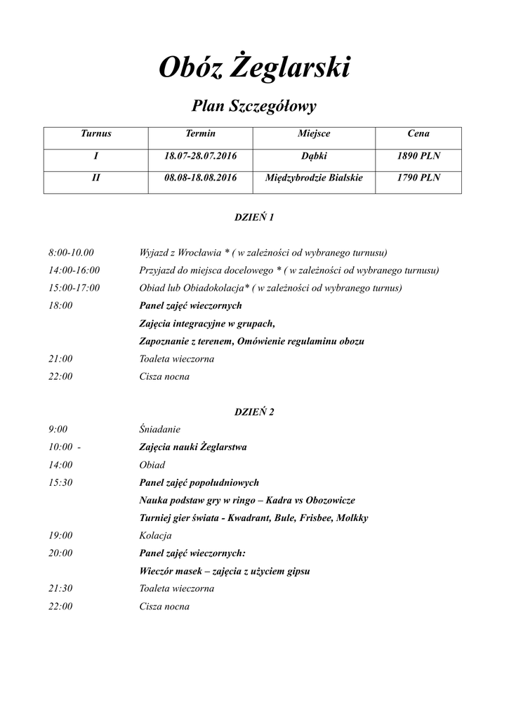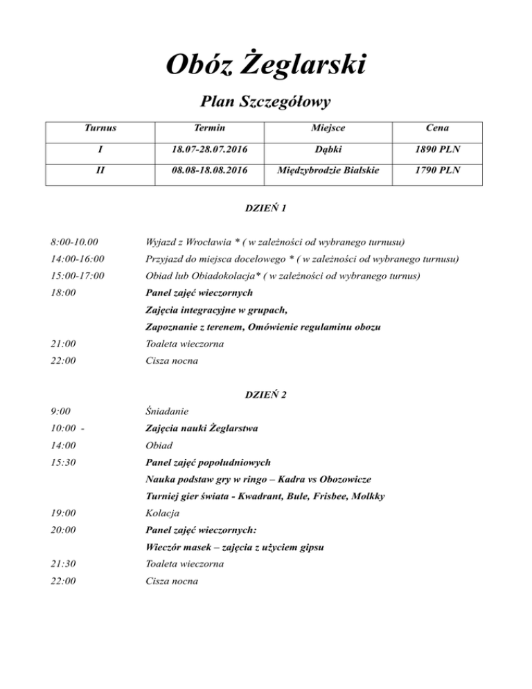 Obóz Żeglarski Plan Szczegółowy Turnus Termin Miejsce Cena I 18.07-28.07.2016 Dąbki 1890 PLN II 08.08-18.08.2016 Międzybrodzie Bialskie 1790 PLN DZIEŃ 1 8:00-10.00 Wyjazd z Wrocławia * ( w zależności od wybranego turnusu) 14:00-16:00 Przyjazd do miejsca docelowego * ( w zależności od wybranego turnusu) 15:00-17:00 Obiad lub Obiadokolacja* ( w zależności od wybranego turnus) 18:00 Panel zajęć wieczornych Zajęcia integracyjne w grupach, Zapoznanie z terenem, Omówienie regulaminu obozu 21:00 Toaleta wieczorna 22:00 Cisza nocna DZIEŃ 2 9:00 Śniadanie 10:00 - Zajęcia nauki Żeglarstwa 14:00 Obiad 15:30 Panel zajęć popołudniowych Nauka podstaw gry w ringo – Kadra vs Obozowicze Turniej gier świata - Kwadrant, Bule, Frisbee, Molkky 19:00 Kolacja 20:00 Panel zajęć wieczornych: Wieczór masek – zajęcia z użyciem gipsu 21:30 Toaleta wieczorna 22:00 Cisza nocna DZIEŃ 3 9:00 Śniadanie 10:00- Zajęcia nauki Żeglarstwa 14:00 Obiad 15:30 Panel zajęć popołudniowych Zajęcia z łucznictwa: nauka strzelania z łuku Bieg – Napad na Twierdzę 19:00 Kolacja 20:00 Panel zajęć wieczornych: Dyskoteka z karaoke 21:30 Toaleta wieczorna 22:00 Cisza nocna DZIEŃ 4 9:00 Śniadanie 10:30- Zajęcia nauki Żeglarstwa 14:00 Obiad 15:30 Panel zajęć popołudniowych Pasowanie na pirata 19:00 Kolacja 20:00 Panel zajęć wieczornych Wieczór zmagań kulinarnych: Hell’s Kitchen 21:30 Toaleta wieczorna 22:00 Cisza nocna DZIEŃ 5 9:00 Śniadanie 10:30- Zajęcia nauki Żeglarstwa 14:00 Obiad 15:30 Panel zajęć popołudniowych Władcy Olimpu – mini-olimpiada sportowa 19:00 Kolacja 20:00 Panel zajęć wieczornych Nocne poszukiwanie skarbów 22:00 Toaleta wieczorna 22:30 Cisza nocna DZIEŃ 6 9:00 Śniadanie 9:30 Wycieczka fakultatywna 14:00 Obiad 15:30 Panel zajęć popołudniowych: Plażowanie – konkurs rzeźb piaskowych 19:00 Kolacja 19:30 Panel zajęć wieczornych Obozowa Manufaktura 21:30 Toaleta wieczorna 22:00 Cisza nocna DZIEŃ 7 9:00 Śniadanie 10:00 – 13:30 Zajęcia nauki Żeglarstwa 14:00 Obiad 15:30 Panel zajęć popołudniowych Zajęcia z gier zespołowych: Mini-baseball, Uni-hokej, Gra Flagi 19:00 Kolacja 20:00 Panel zajęć wieczornych Zajęcia artystyczne – praca z gliną / modelarstwo 21:30 Toaleta wieczorna 22:00 Cisza nocna DZIEŃ 8 9:00 Śniadanie 10:00 – Zajęcia nauki Żeglarstwa 14:00 Obiad 15:30 Panel zajęć popołudniowych Mali herkulesi 19:00 Kolacja 20:30 Panel zajęć wieczornych Wieczór filmowy 22:00 Toaleta wieczorna 22:30 Cisza nocna DZIEŃ 9 9:00 Śniadanie 10:00 - Zajęcia nauki Żeglarstwa 14:00 Obiad 15:30 Panel zajęć popołudniowych: Turnieje gier plażowych : piłka nożna, siatkówka, piłka ręczna 19:00 Kolacja 20:00 Panel zajęć wieczornych Gry terenowe: 50-tka 21:30 Toaleta wieczorna 22:00 Cisza nocna DZIEŃ 10 9:00 Śniadanie 10:00- Zajęcia nauki Żeglarstwa 14:00 Obiad 15:30 Panel zajęć popołudniowych Plażowanie oraz zakup pamiątek 19:00 Kolacja 20:00 Panel zajęć wieczornych Wieczór grillowy – Wręczenie nagród oraz dyplomów pamiątkowych 22:00 Toaleta wieczorna 22:30 Cisza nocna DZIEŃ 11 9:00 Śniadanie 10:30 Wykwaterowanie, wyjazd Plan obozu zawiera: 16 h kursu żeglarskiego Zapoznają się z budową jachtu żaglowego oraz z prawem drogi obowiązującym na akwenach wodnych Nauczą się obsługiwać urządzenia pokładowe oraz sterować jachtem (zmiana kursu, zwrot przez sztag i przez rufę, praca żaglami, nauka bezpiecznego pływania) Poznają manewry portowe (podejścia do brzegu i odejście od niego, praca cumami i na kotwicy).