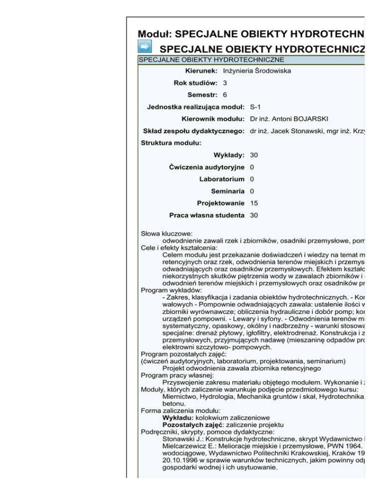 Moduł: SPECJALNE OBIEKTY HYDROTECHNICZN SPECJALNE OBIEKTY HYDROTECHNICZNE SPECJALNE OBIEKTY HYDROTECHNICZNE Kierunek: Inżynieria Środowiska Rok studiów: 3 Semestr: 6 P Jednostka realizująca moduł: S-1 Kierownik modułu: Dr inż. Antoni BOJARSKI Skład zespołu dydaktycznego: dr inż. Jacek Stonawski, mgr inż. Krzysztof Struktura modułu: Wykłady: 30 Ćwiczenia audytoryjne 0 Laboratorium 0 Seminaria 0 Projektowanie 15 Praca własna studenta 30 Słowa kluczowe: odwodnienie zawali rzek i zbiorników, osadniki przemysłowe, pompown Cele i efekty kształcenia: Celem modułu jest przekazanie doświadczeń i wiedzy na temat metod o retencyjnych oraz rzek, odwodnienia terenów miejskich i przemysłowych odwadniających oraz osadników przemysłowych. Efektem kształcenia b niekorzystnych skutków piętrzenia wody w zawalach zbiorników i obwał odwodnień terenów miejskich i przemysłowych oraz osadników przemys Program wykładów: - Zakres, klasyfikacja i zadania obiektów hydrotechnicznych. - Konstrukc wałowych - Pompownie odwadniających zawala: ustalenie ilości wody d zbiorniki wyrównawcze; obliczenia hydrauliczne i dobór pomp; konstrukc urządzeń pompowni. - Lewary i syfony. - Odwodnienia terenów miejskic systematyczny, opaskowy, okólny i nadbrzeżny - warunki stosowania i z specjalne: drenaż płytowy, igłofiltry, elektrodrenaż. Konstrukcja i zasady przemysłowych, przyjmujących nadawę (mieszaninę odpadów produkcy elektrowni szczytowo- pompowych. Program pozostałych zajęć: (ćwiczeń audytoryjnych, laboratorium, projektowania, seminarium) Projekt odwodnienia zawala zbiornika retencyjnego Program pracy własnej: Przyswojenie zakresu materiału objętego modułem. Wykonanie i zalicze Moduły, których zaliczenie warunkuje podjęcie przedmiotowego kursu: Miernictwo, Hydrologia, Mechanika gruntów i skał, Hydrotechnika, Mate betonu. Forma zaliczenia modułu: Wykładu: kolokwium zaliczeniowe Pozostałych zajęć: zaliczenie projektu Podręczniki, skrypty, pomoce dydaktyczne: Stonawski J.: Konstrukcje hydrotechniczne, skrypt Wydawnictwo Politec Mielcarzewicz E.: Melioracje miejskie i przemysłowe, PWN 1964. Wiecz wodociągowe, Wydawnictwo Politechniki Krakowskiej, Kraków 1999. Ro 20.10.1996 w sprawie warunków technicznych, jakim powinny odpowiad gospodarki wodnej i ich usytuowanie. © Wydział Inżynierii Środowiska http://www.wis.pk.edu.pl/