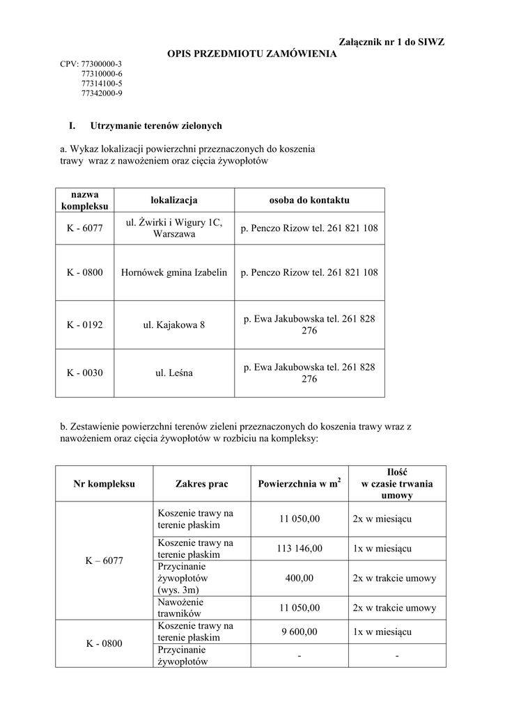 Załącznik nr 1 do SIWZ OPIS PRZEDMIOTU ZAMÓWIENIA CPV: 77300000-3 77310000-6 77314100-5 77342000-9 I. Utrzymanie terenów zielonych a. Wykaz lokalizacji powierzchni przeznaczonych do koszenia trawy wraz z nawożeniem oraz cięcia żywopłotów nazwa kompleksu lokalizacja osoba do kontaktu K - 6077 ul. Żwirki i Wigury 1C, Warszawa p. Penczo Rizow tel. 261 821 108 K - 0800 Hornówek gmina Izabelin p. Penczo Rizow tel. 261 821 108 K - 0192 ul. Kajakowa 8 p. Ewa Jakubowska tel. 261 828 276 K - 0030 ul. Leśna p. Ewa Jakubowska tel. 261 828 276 b. Zestawienie powierzchni terenów zieleni przeznaczonych do koszenia trawy wraz z nawożeniem oraz cięcia żywopłotów w rozbiciu na kompleksy: Nr kompleksu Zakres prac Koszenie trawy na terenie płaskim K – 6077 K - 0800 Koszenie trawy na terenie płaskim Przycinanie żywopłotów (wys. 3m) Nawożenie trawników Koszenie trawy na terenie płaskim Przycinanie żywopłotów Powierzchnia w m2 Ilość w czasie trwania umowy 11 050,00 2x w miesiącu 113 146,00 1x w miesiącu 400,00 2x w trakcie umowy 11 050,00 2x w trakcie umowy 9 600,00 1x w miesiącu - - K - 0192 K - 0030 Nawożenie trawników Koszenie trawy na terenie płaskim Przycinanie żywopłotów Nawożenie trawników Koszenie trawy na terenie płaskim Koszenie trawy na skarpie Przycinanie żywopłotów Nawożenie trawników - - 9 516,00 1x w miesiącu - 9 516,00 15 064,00 4 561,00 2x w trakcie umowy 2x w miesiącu 2x w miesiącu 142,00 2x w trakcie umowy 19 625,00 2x w trakcie umowy Obsadzenie 30 szt. donic (60x60x60) materiałem roślinnym na terenie kompleksu K – 6077 wraz z odpowiednim przygotowaniem podłoża (drenaż, włóknina, ziemia ogrodnicza) II. − 120 szt. (po 4 sztuki do każdej donicy) jałowca płożącego niebieskiego ‘Ice Blue’ – pojemnik C2 − 28 szt. bukszpanu wiecznie zielonego kulistego (po 1 sztuce do każdej donicy) – pojemnik C3 − 2 szt. Picea Conika (po 1szt.do donicy) − wykończenie powierzchni nasadzeń jasnym, drobnym żwirem Rozłożenie trawnika z rolki o powierzchni 750 m2na terenie kompleksu K-6077 III. − − − − − oczyszczenie terenu ze starej darni i pozostałych nieczystości; modelowanie terenu; nawiezienie terenu żyzną ziemią ok 4 cm; rozłożenie trawy z rolki; wywóz nieczystości powstałych przy oczyszczaniu terenu Wykonawca przedmiotu zamówienia zobowiązany jest do: - wykonywania usługi od dnia podpisania umowy do 30.11.2016r. - koszenia trawy na terenie kompleksów, zgodnie z otrzymanym zgłoszeniem; - dokładnego wykończenia koszenia wzdłuż krawężników oraz studzienek komunikacyjnych znajdujących się na terenach zielonych objętych umową; - zgrabienia, załadunku do własnych kontenerów i wywozu skoszonego materiału w terminie nie przekraczającym 7 dni od daty koszenia; - uprzątnięcia terenu po zakończeniu każdego koszenia; - ustalenia z przedstawicielami Zespołów Zabezpieczenia dokładnej lokalizacji terenów przeznaczonych do koszenia, terminów wykonania przedmiotu umowy oraz innych szczegółów dotyczących jego realizacji; - realizacji przedmiotu umowy na podstawie pisemnego (fax, e-mail) zgłoszenia dokonanego przez przedstawiciela 1 Bazy Lotnictwa Transportowego, - przycinania żywopłotów zgodnie ze sztuką ogrodniczą oraz zgodnie z sugestiami przedstawicieli Zespołów Zabezpieczenia; - niezwłocznego uprzątnięcia terenu po zakończeniu przycinania żywopłotu; - użycie najwyższej klasy środków ochrony roślin: nawozy długodziałające; - dostarczony materiał roślinny powinien być zdrowy (bez oznak chorobowych i szkodników); - wykonywane prace powinny być realizowane zgodnie ze sztuką ogrodniczą; - Wykonawca udziela gwarancji na wykonane prace wraz z dostarczonym materiałem na okres minimum 12 miesięcy. Informacje dodatkowe: - zaleca się aby przed złożeniem oferty Wykonawca przeprowadził wizję lokalną na terenach objętych przedmiotem zamówienia. Wszelkie dodatkowe informacje uzyskane w trakcie wizji lokalnej, które mogą być konieczne do przygotowania oferty, zawarcia umowy oraz wykonania zamówienia, Wykonawca zdobywa na własną odpowiedzialność i ryzyko. Koszty dokonania wizji lokalnej terenu poniesie Wykonawca, Inne postanowienia: - cenę należy przedstawić w oparciu o kalkulację własną; - cena jednostkowa powinna obejmować wszystkie koszty związane z wywozem skoszonego materiału (np. koszt transportu, zagospodarowania skoszonej trawy, dostawy kontenerów, załadunku, rozładunku itp. ); - Zamawiający z przyczyn obiektywnych i niezależnych od Zleceniodawcy zastrzega sobie prawo do zmniejszenia lub zwiększenia deklarowanej ilości usług ustalonych dla określonego rejonu w zakresie przeznaczonej ogólnej kwoty brutto dla danego rejonu; - Wykonawca zobowiązany jest do podania wykazu osób realizujących przedmiot zamówienia tj. imię i nazwisko, imiona rodziców, adres zamieszkania, nr dokumentu tożsamości, przez kogo wydany i data wydania, PESEL; - Wykonawca zobowiązany jest do podania wykazu wraz z numerami rejestracyjnymi samochodów wyznaczonych do realizacji niniejszego zadania.