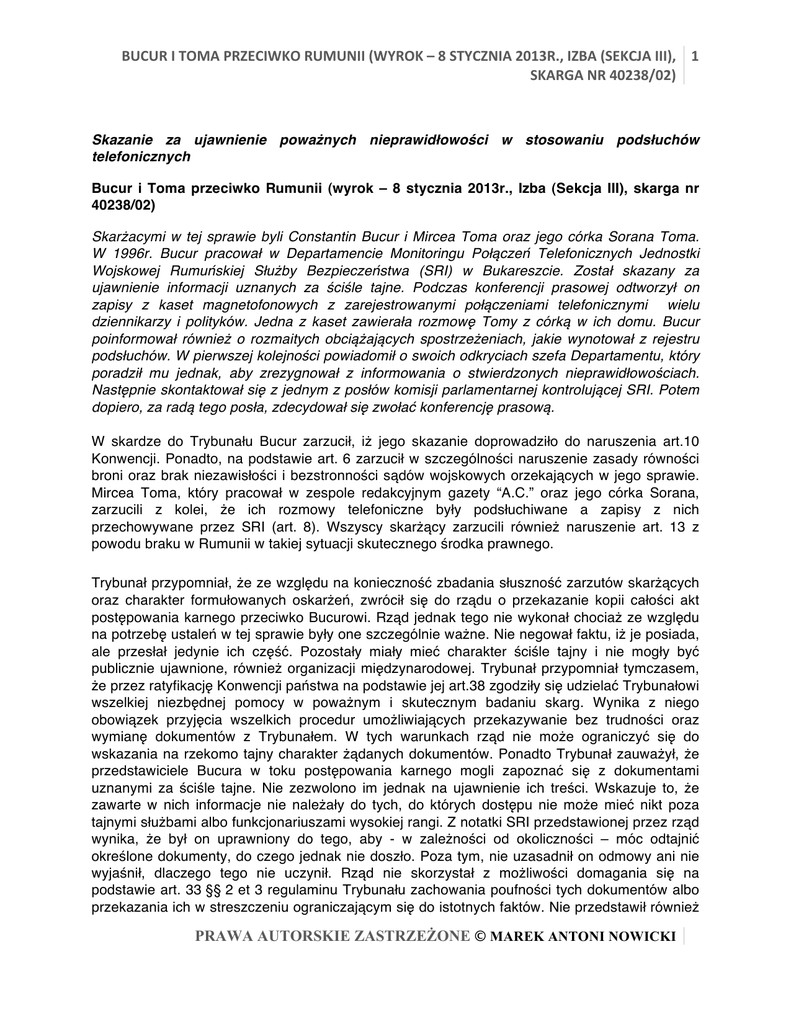 BUCUR I TOMA PRZECIWKO RUMUNII (WYROK – 8 STYCZNIA 2013R., IZBA (SEKCJA III), 1 SKARGA NR 40238/02) Skazanie za ujawnienie poważnych nieprawidłowości w stosowaniu podsłuchów telefonicznych Bucur i Toma przeciwko Rumunii (wyrok – 8 stycznia 2013r., Izba (Sekcja III), skarga nr 40238/02) Skarżacymi w tej sprawie byli Constantin Bucur i Mircea Toma oraz jego córka Sorana Toma. W 1996r. Bucur pracował w Departamencie Monitoringu Połączeń Telefonicznych Jednostki Wojskowej Rumuńskiej Służby Bezpieczeństwa (SRI) w Bukareszcie. Został skazany za ujawnienie informacji uznanych za ściśle tajne. Podczas konferencji prasowej odtworzył on zapisy z kaset magnetofonowych z zarejestrowanymi połączeniami telefonicznymi wielu dziennikarzy i polityków. Jedna z kaset zawierała rozmowę Tomy z córką w ich domu. Bucur poinformował również o rozmaitych obciążających spostrzeżeniach, jakie wynotował z rejestru podsłuchów. W pierwszej kolejności powiadomił o swoich odkryciach szefa Departamentu, który poradził mu jednak, aby zrezygnował z informowania o stwierdzonych nieprawidłowościach. Następnie skontaktował się z jednym z posłów komisji parlamentarnej kontrolującej SRI. Potem dopiero, za radą tego posła, zdecydował się zwołać konferencję prasową. W skardze do Trybunału Bucur zarzucił, iż jego skazanie doprowadziło do naruszenia art.10 Konwencji. Ponadto, na podstawie art. 6 zarzucił w szczególności naruszenie zasady równości broni oraz brak niezawisłości i bezstronności sądów wojskowych orzekających w jego sprawie. Mircea Toma, który pracował w zespole redakcyjnym gazety “A.C.” oraz jego córka Sorana, zarzucili z kolei, że ich rozmowy telefoniczne były podsłuchiwane a zapisy z nich przechowywane przez SRI (art. 8). Wszyscy skarżący zarzucili również naruszenie art. 13 z powodu braku w Rumunii w takiej sytuacji skutecznego środka prawnego. Trybunał przypomniał, że ze względu na konieczność zbadania słuszność zarzutów skarżących oraz charakter formułowanych oskarżeń, zwrócił się do rządu o przekazanie kopii całości akt postępowania karnego przeciwko Bucurowi. Rząd jednak tego nie wykonał chociaż ze względu na potrzebę ustaleń w tej sprawie były one szczególnie ważne. Nie negował faktu, iż je posiada, ale przesłał jedynie ich część. Pozostały miały mieć charakter ściśle tajny i nie mogły być publicznie ujawnione, również organizacji międzynarodowej. Trybunał przypomniał tymczasem, że przez ratyfikację Konwencji państwa na podstawie jej art.38 zgodziły się udzielać Trybunałowi wszelkiej niezbędnej pomocy w poważnym i skutecznym badaniu skarg. Wynika z niego obowiązek przyjęcia wszelkich procedur umożliwiających przekazywanie bez trudności oraz wymianę dokumentów z Trybunałem. W tych warunkach rząd nie może ograniczyć się do wskazania na rzekomo tajny charakter żądanych dokumentów. Ponadto Trybunał zauważył, że przedstawiciele Bucura w toku postępowania karnego mogli zapoznać się z dokumentami uznanymi za ściśle tajne. Nie zezwolono im jednak na ujawnienie ich treści. Wskazuje to, że zawarte w nich informacje nie należały do tych, do których dostępu nie może mieć nikt poza tajnymi służbami albo funkcjonariuszami wysokiej rangi. Z notatki SRI przedstawionej przez rząd wynika, że był on uprawniony do tego, aby - w zależności od okoliczności – móc odtajnić określone dokumenty, do czego jednak nie doszło. Poza tym, nie uzasadnił on odmowy ani nie wyjaśnił, dlaczego tego nie uczynił. Rząd nie skorzystał z możliwości domagania się na podstawie art. 33 §§ 2 et 3 regulaminu Trybunału zachowania poufności tych dokumentów albo przekazania ich w streszczeniu ograniczającym się do istotnych faktów. Nie przedstawił również PRAWA AUTORSKIE ZASTRZEŻONE © MAREK ANTONI NOWICKI 2 BUCUR I TOMA PRZECIWKO RUMUNII (WYROK – 8 STYCZNIA 2013R., IZBA (SEKCJA III), SKARGA NR 40238/02) argumentów ani żadnych innych elementów wskazujących, że treść tych dokumentów nie była rozstrzygająca dla badania zarzutów skarżących. Ze względu na znaczenie współpracy państwa, przeciwko któremu została wniesiona skarga, w postępowaniach toczących się na podstawie Konwencji oraz trudności z ustaleniami faktycznymi w tej sprawie, Trybunał uważał, że państwo nie wypełniło swojego obowiązku wynikającego z art.38 Konwencji. W związku z zarzutem na tle art.10 Konwencji Trybunał potwierdził, iż doszło do ingerencji. Miał wątpliwości, czy przepisy będące jej podstawą spełniały wymóg przewidywalności. Uznał jednak, że nie musi się zajmować tą kwestią, ponieważ do naruszenia doszło z innych powodów. Jej cel był uprawniony – zapobieganie i ściganie przestępstw przeciwko bezpieczeństwu państwa. Przy ocenie, czy była konieczna w społeczeństwie demokratycznym Trybunał przypomniał zasady ogólne mające w tym przypadku zastosowanie, w tym dotyczące ochrony osób alarmujących o nieprawidłowościach, które są funkcjonariuszami publicznymi. Zostały one sformułowane w wyroku Guja v. Mołdowa (z 12 lutego 2008r.): Art.10 ma zastosowanie również do miejsca pracy, a funkcjonariusze publiczni korzystają z prawa do wolności wypowiedzi. Równocześnie Trybunał był świadomy obowiązku pracowników wykazywania w stosunku do swego pracodawcy lojalności, powściągliwości i dyskrecji. Dotyczy to zwłaszcza urzędników, bo sama natura służby cywilnej wymaga, aby wiązał ich obowiązek lojalności i dyskrecji. Funkcjonariusze publiczni w społeczeństwie demokratycznym mają pomagać rządowi w sprawowaniu jego funkcji. Ogół ma prawo oczekiwać, iż będą oni wspierać demokratycznie wybrany rząd a nie utrudniać mu zadania. W ich przypadku obowiązek lojalności i powściągliwości nabiera w rezultacie specjalnego znaczenia. Ze względu na samą naturę ich stanowisk funkcjonari