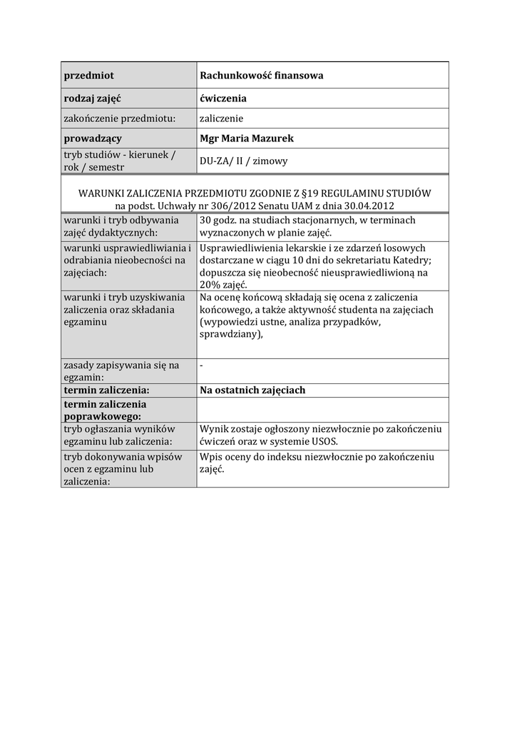 przedmiot Rachunkowość finansowa rodzaj zajęć ćwiczenia zakończenie przedmiotu: zaliczenie prowadzący Mgr Maria Mazurek tryb studiów - kierunek / rok / semestr DU-ZA/ II / zimowy WARUNKI ZALICZENIA PRZEDMIOTU ZGODNIE Z §19 REGULAMINU STUDIÓW na podst. Uchwały nr 306/2012 Senatu UAM z dnia 30.04.2012 warunki i tryb odbywania 30 godz. na studiach stacjonarnych, w terminach zajęć dydaktycznych: wyznaczonych w planie zajęć. warunki usprawiedliwiania i Usprawiedliwienia lekarskie i ze zdarzeń losowych odrabiania nieobecności na dostarczane w ciągu 10 dni do sekretariatu Katedry; zajęciach: dopuszcza się nieobecność nieusprawiedliwioną na 20% zajęć. warunki i tryb uzyskiwania Na ocenę końcową składają się ocena z zaliczenia zaliczenia oraz składania końcowego, a także aktywność studenta na zajęciach egzaminu (wypowiedzi ustne, analiza przypadków, sprawdziany), zasady zapisywania się na egzamin: termin zaliczenia: termin zaliczenia poprawkowego: tryb ogłaszania wyników egzaminu lub zaliczenia: tryb dokonywania wpisów ocen z egzaminu lub zaliczenia: Na ostatnich zajęciach Wynik zostaje ogłoszony niezwłocznie po zakończeniu ćwiczeń oraz w systemie USOS. Wpis oceny do indeksu niezwłocznie po zakończeniu zajęć.