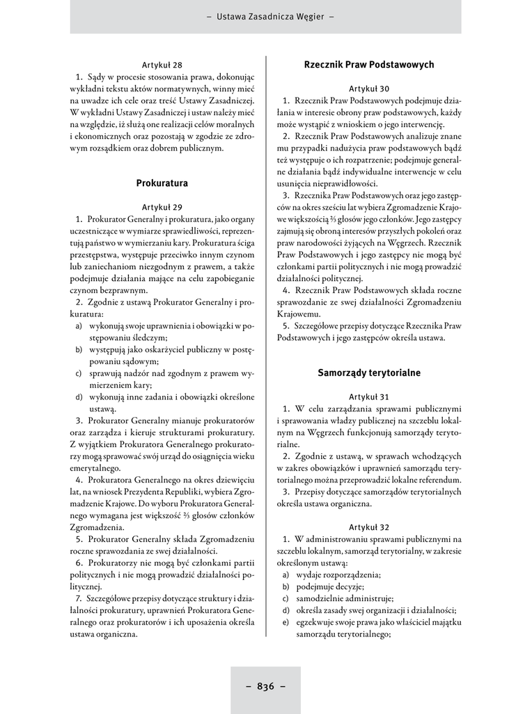 – Ustawa Zasadnicza Węgier – Rzecznik Praw Podstawowych Artykuł 28 1. Sądy w procesie stosowania prawa, dokonując wykładni tekstu aktów normatywnych, winny mieć na uwadze ich cele oraz treść Ustawy Zasadniczej. W wykładni Ustawy Zasadniczej i ustaw należy mieć na względzie, iż służą one realizacji celów moralnych i ekonomicznych oraz pozostają w zgodzie ze zdrowym rozsądkiem oraz dobrem publicznym. Prokuratura Artykuł 29 1. Prokurator Generalny i prokuratura, jako organy uczestniczące w wymiarze sprawiedliwości, reprezentują państwo w wymierzaniu kary. Prokuratura ściga przestępstwa, występuje przeciwko innym czynom lub zaniechaniom niezgodnym z prawem, a także podejmuje działania mające na celu zapobieganie czynom bezprawnym. 2. Zgodnie z ustawą Prokurator Generalny i prokuratura: a) wykonują swoje uprawnienia i obowiązki w postępowaniu śledczym; b) występują jako oskarżyciel publiczny w postępowaniu sądowym; c) sprawują nadzór nad zgodnym z prawem wymierzeniem kary; d) wykonują inne zadania i obowiązki określone ustawą. 3. Prokurator Generalny mianuje prokuratorów oraz zarządza i kieruje strukturami prokuratury. Z wyjątkiem Prokuratora Generalnego prokuratorzy mogą sprawować swój urząd do osiągnięcia wieku emerytalnego. 4. Prokuratora Generalnego na okres dziewięciu lat, na wniosek Prezydenta Republiki, wybiera Zgromadzenie Krajowe. Do wyboru Prokuratora Generalnego wymagana jest większość ⅔ głosów członków Zgromadzenia. 5. Prokurator Generalny składa Zgromadzeniu roczne sprawozdania ze swej działalności. 6. Prokuratorzy nie mogą być członkami partii politycznych i nie mogą prowadzić działalności politycznej. 7. Szczegółowe przepisy dotyczące struktury i działalności prokuratury, uprawnień Prokuratora Generalnego oraz prokuratorów i ich uposażenia określa ustawa organiczna. Artykuł 30 1. Rzecznik Praw Podstawowych podejmuje dzia- łania w interesie obrony praw podstawowych, każdy może wystąpić z wnioskiem o jego interwencję. 2. Rzecznik Praw Podstawowych analizuje znane mu przypadki nadużycia praw podstawowych bądź też występuje o ich rozpatrzenie; podejmuje generalne działania bądź indywidualne interwencje w celu usunięcia nieprawidłowości. 3. Rzecznika Praw Podstawowych oraz jego zastępców na okres sześciu lat wybiera Zgromadzenie Krajowe większością ⅔ głosów jego członków. Jego zastępcy zajmują się obroną interesów przyszłych pokoleń oraz praw narodowości żyjących na Węgrzech. Rzecznik Praw Podstawowych i jego zastępcy nie mogą być członkami partii politycznych i nie mogą prowadzić działalności politycznej. 4. Rzecznik Praw Podstawowych składa roczne sprawozdanie ze swej działalności Zgromadzeniu Krajowemu. 5. Szczegółowe przepisy dotyczące Rzecznika Praw Podstawowych i jego zastępców określa ustawa. Samorządy terytorialne Artykuł 31 1. W celu zarządzania sprawami publicznymi i sprawowania władzy publicznej na szczeblu lokalnym na Węgrzech funkcjonują samorządy terytorialne. 2. Zgodnie z ustawą, w sprawach wchodzących w zakres obowiązków i uprawnień samorządu terytorialnego można przeprowadzić lokalne referendum. 3. Przepisy dotyczące samorządów terytorialnych określa ustawa organiczna. Artykuł 32 1. W administrowaniu sprawami publicznymi na szczeblu lokalnym, samorząd terytorialny, w zakresie określonym ustawą: a) wydaje rozporządzenia; b) podejmuje decyzje; c) samodzielnie administruje; d) określa zasady swej organizacji i działalności; e) egzekwuje swoje prawa jako właściciel majątku samorządu terytorialnego; – 836 – – Magyarország Alaptörvénye – f) ustala swój budżet i na tej podstawie prowadzi samodzielną gospodarkę finansową; g) może prowadzić działalność gospodarczą z wykorzystaniem swoich zasobów i przychodów, o ile nie zagraża to wypełnianiu zadań statutowych; h) decyduje o rodzajach i wymiarze podatków lokalnych; i) może tworzyć symbole samorządowe, ustanawiać lokalne odznaczenia i tytuły honorowe; j) może zwracać się do kompetentnych organów z prośbą o informację lub o wszczęcie postępowania oraz wyrażać wobec nich opinie; k) może swobodnie zrzeszać się z innymi jednostkami samorządu terytorialnego, ustanawiać formy współpracy dla realizacji wspólnych interesów; w zakresie swych zadań statutowych i uprawnień może współpracować z jednostkami samorządu terytorialnego innych państw oraz być członkiem międzynarodowych zrzeszeń samorządowych; l) wykonuje inne zadania statutowe oraz inne uprawnienia i obowiązki wynikające z ustawy. 2. Działając w ramach swych uprawnień, jednostka samorządu terytorialnego może – na podstawie ustawowego upoważnienia – wydawać rozporządzania w celu uregulowania spraw lokalnych nieuregulowanych ustawowo lub w innych aktach normatywnych. 3. Rozporządzenie wydane przez organy samorządu terytorialnego nie może być sprzeczne z innymi aktami normatywnymi. 4. Po ogłoszeniu rozporządzenia, jednostka samorządu terytorialnego przesyła je niezwłocznie do stołecznego lub wojewódzkiego urzędu państwowego. Jeśli stwierdzą one, że rozporządzenie lub któryś z jego przepisów są niezgodne z ustawą, mogą zainicjować zbadanie rozporządzenia przez sąd. 5. Urząd stołeczny lub urząd wojewódzki mogą zainicjować wszczęcie procesu sądowego w kwestii stwierdzenia zaniechania przez jednostkę samorządu terytorialnego ustawowego obowiązku ustawodawczego. Jeśli jednostka samorządu terytorialnego nie wypełni tego obowiązku w terminie wyznaczonym w werdykcie sądowym, w którym został stwierdzony fakt zaniechania przez nią obowiązku ustawodawczego, to sąd – na wniosek urzędu stołecznego lub wojewódzkiego – zarządzi, aby rozporządzenie niezbędne do naprawy skutków owego zaniechania wydały urząd stołeczny lub wojewódzki. 6. Własność samorządów terytorialnych jest w