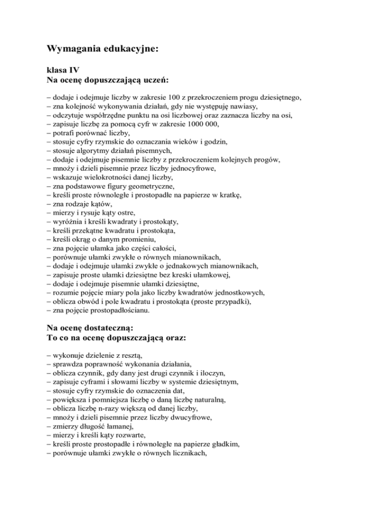 Wymagania edukacyjne: klasa IV Na ocenę dopuszczającą uczeń: dodaje i odejmuje liczby w zakresie 100 z przekroczeniem progu dziesiętnego, zna kolejność wykonywania działań, gdy nie występuję nawiasy, odczytuje współrzędne punktu na osi liczbowej oraz zaznacza liczby na osi, zapisuje liczbę za pomocą cyfr w zakresie 1000 000, potrafi porównać liczby, stosuje cyfry rzymskie do oznaczania wieków i godzin, stosuje algorytmy działań pisemnych, dodaje i odejmuje pisemnie liczby z przekroczeniem kolejnych progów, mnoży i dzieli pisemnie przez liczby jednocyfrowe, wskazuje wielokrotności danej liczby, zna podstawowe figury geometryczne, kreśli proste równoległe i prostopadłe na papierze w kratkę, zna rodzaje kątów, mierzy i rysuje kąty ostre, wyróżnia i kreśli kwadraty i prostokąty, kreśli przekątne kwadratu i prostokąta, kreśli okrąg o danym promieniu, zna pojęcie ułamka jako części całości, porównuje ułamki zwykłe o równych mianownikach, dodaje i odejmuje ułamki zwykłe o jednakowych mianownikach, zapisuje proste ułamki dziesiętne bez kreski ułamkowej, dodaje i odejmuje pisemnie ułamki dziesiętne, rozumie pojęcie miary pola jako liczby kwadratów jednostkowych, oblicza obwód i pole kwadratu i prostokąta (proste przypadki), zna pojęcie prostopadłościanu. Na ocenę dostateczną: To co na ocenę dopuszczającą oraz: wykonuje dzielenie z resztą, sprawdza poprawność wykonania działania, oblicza czynnik, gdy dany jest drugi czynnik i iloczyn, zapisuje cyframi i słowami liczby w systemie dziesiętnym, stosuje cyfry rzymskie do oznaczenia dat, powiększa i pomniejsza liczbę o daną liczbę naturalną, oblicza liczbę n-razy większą od danej liczby, mnoży i dzieli pisemnie przez liczby dwucyfrowe, zmierzy długość łamanej, mierzy i kreśli kąty rozwarte, kreśli proste prostopadłe i równoległe na papierze gładkim, porównuje ułamki zwykłe o równych licznikach, odróżnia ułamki właściwe i niewłaściwe, skraca i rozszerza ułamki zwykłe przez daną liczbę, zamienia liczby mieszane na ułamki niewłaściwe, odczytuje współrzędne ułamka zaznaczonego na osi liczbowej oraz zaznacza dany ułamek na osi liczbowej, dodaje i odejmuje liczby mieszane o jednakowych mianownikach, odczytuje i zapisuje ułamek dziesiętny, zastosowuje ułamki dziesiętne do zmiany wyrażeń dwumianowych na jednomianowe, dodaje i odejmuje dowolne ułamki dziesiętne sposobem pisemnym, budowa figury z kwadratów jednostkowych, oblicza pole i obwód dowolnego prostokąta kreśli siatki prostopadłościanów, zna sposób obliczania pola powierzchni prostopadłościanu. Na ocenę dobrą: To co na ocenę dostateczną oraz: rozwiązuje zadania tekstowe wielodziałaniowe dotyczące działań pamięciowych oraz pisemnych na liczbach naturalnych, zapisuje i oblicza kwadraty i sześciany liczb, oblicza średnią arytmetyczną kilku liczb, tworzy wyrażenie arytmetyczne na podstawie treści zadania i oblicza jego wartość, podaje najmniejszą i największą liczbę w zbiorze, rozwiązuje zadania tekstowe wielodziałaniowe dotyczące działań pisemnych na liczbach naturalnych, mnoży i dzieli pisemnie prze liczby wielocyfrowe, oblicza wartość wyrażenia z uwzględnieniem nawiasów, kolejności działań, odczytuje liczby zapisane w systemie rzymskim, kreśli poszczególne rodzaje kątów, mierzy kąty wklęsłe, kreśli odcinek, koło i prostokąt w skali, zamienia liczbę mieszaną na ułamek niewłaściwy, wyłącza całości z ułamków, przedstawia liczby mieszane na osi liczbowej, odejmuje ułamek od całości, rozwiązuje zadania tekstowe z zastosowaniem dodawania ułamków zwykłych, porównuje ułamki dziesiętne, dostrzega w ułamkach dziesiętnych zer nieistotnych, rozwiązuje zadania tekstowe z zastosowaniem dodawania ułamków dziesiętnych, rozwiązuje zadania tekstowe na porównywanie różnicowe, obliczać bok kwadratu, gdy dane jest jego pole, zamienia jednostki pola, projektuje siatki prostopadłościanów w skali, obliczać pole powierzchni prostopadłościanu bez rysunku siatki. Na ocenę bardzo dobrą: To co na ocenę dobrą oraz: oblicza wartość wielodziałaniowego wyrażenia arytmetycznego, dostrzega zasady zapisu ciągu liczb, wstawia nawiasy, aby otrzymać żądane wyniki, porównuje liczby zapisane w systemie rzymskim, rozwiązuje zadania tekstowe z zastosowaniem działań łącznych, określa wzajemne położenie prostych i odcinków, oblicza skalę, oblicza długość boku prostokąta przy danym obwodzie i długości drugiego boku, opisuje części figury lub zbioru skończonego za pomocą ułamka, rozwiązuje zadania tekstowe z zastosowaniem dodawania i odejmowania ułamków zwykłych, zamienia ułamki zwykłe i liczby mieszane na ułamki dziesiętne poprzez rozszerzanie, rozwiązuje zadania tekstowe z zastosowaniem dodawania ,odejmowania, mnożenia i dzielenia ułamków dziesiętnych, oblicza pole figury złożonej z kilku prostokątów, rozwiązuje zadania tekstowe z zastosowaniem pół powierzchni prostopadłościanu, oblicza długości krawędzi sześcianów, znając ich pola powierzchni, układa figury tangramowe. Na ocenę celującą: Uczeń spełnia kryteria na ocenę bardzo dobrą i nie popełnia żadnych błędów. rozwiązuje zadania tekstowe wielodziałowe, zapisuje liczbę najmniejszą i największą za pomocą cyfr rzymskich, rozwiązuje zadania tekstowe z zastosowaniem działań łącznych, zamienia jednostki długości, powierzchni, masy rozwiązuje zadania tekstowe, rozwiązuje zadania z zastosowaniem porównania dopełnień ułamków zwykłych do całości, znajduje ułamki zwykłe o jednakowych mianownikach, aby otrzymać żądaną sumę, rozwiązuje zadania związane ze skalą i polami, oblicza pola powierzchni brył złożonych z prostopadłościanów. Wymagania edukacyjne - klasa V Na ocenę dopuszczającą: - dodaje i odejmuje w pamięci liczby dwucyfrowych z przekroczeniem progu dziesiętnego, - p