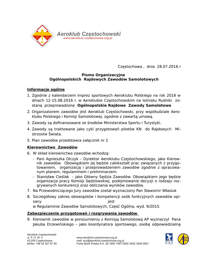 Częstochowa , dnia 28.07.2016 r Pismo Organizacyjne Ogólnopolskich Rajdowych Zawodów Samolotowych Informacje ogólne 1. Zgodnie z kalendarzem imprez sportowych Aeroklubu Polskiego na rok 2016 w dniach 12-15.08.2016 r. w Aeroklubie Częstochowskim na lotnisku Rudniki zostaną przeprowadzone Ogólnopolskie Rajdowe Zawody Samolotowe 2. Organizatorem zawodów jest Aeroklub Częstochowski, przy współudziale Aeroklubu Polskiego i Komisji Samolotowej, zgodnie z zawartą umową. 3. Zawody są dofinansowane ze środków Ministerstwa Sportu i Turystyki. 4. Zawody są traktowane jako cykl przygotowań pilotów KN do Rajdowych Mistrzostw Świata. 5. Plan zawodów przedstawia załącznik nr 2 Kierownictwo Zawodów 6. W skład kierownictwa zawodów wchodzą: - Pani Agnieszka Olczyk – Dyrektor Aeroklubu Częstochowskiego, jako Kierownik zawodów. Obowiązkiem jej będzie całokształt prac związanych z przygotowaniem, organizacją i przeprowadzeniem zawodów zgodnie z opracowanym planem, regulaminem i preliminarzem. - Stanisław Cieślak - jako Główny Sędzia Zawodów. Obowiązkiem jego będzie organizacja pracy Komisji Sędziowskiej, podejmowanie decyzji o rodzaju rozgrywanych konkurencji oraz obliczania wyników zawodów. 7. Na Przewodniczącego Jury zawodów został wyznaczony Pan Sławomir Własiuk 8. Szczegółowy zakres obowiązków i kompetencji osób funkcyjnych zawodów opisany jest w Regulaminie Zawodów Samolotowych, Część Ogólna, wyd. 9/2015. Zabezpieczenie przygotowań i rozgrywania zawodów 9. Kierownik zawodów w porozumieniu z Komisją Samolotową AP wyznaczył Pana Jakuba Drzewińskiego – jako koordynatora sportowego, osobę odpowiedzialną za przygotowanie tras konkurencji nawigacyjnych. 10. Główny Sędzia Zawodów powoła Komisję Sędziowską w składzie max. 5 osób. 11. Dla prawidłowego zabezpieczenia rozgrywania konkurencji zawodów, zgodnego z regulaminem sportowym zawodów, organizator zawodów powinien: a)udostępnić minimum 2 samochody osobowe (posiadające liczniki mierzące odległość w setkach metrów) wraz z kierowcami/pomocnikami sędziów, b)udostępnić jeden samolot do oblotu kontrolnego tras nawigacyjnych lub kontroli złych warunków meteorologicznych, c) 2 kamery video wraz z obsługą dla rejestracji przebiegu konkurencji lądowań zawodniczych, d)zabezpieczyć odpowiednią ilość materiałów biurowych oraz kserokopiarkę. 12. Dla sprawdzenia przygotowania samolotów do zawodów, Kierownik zawodów wyznaczy Pana Daniela Sosnowskiego jako koordynatora technicznego zawodów, który dokona sprawdzenia ważności obowiązujących dokumentów i ubezpieczeń . 13. Dla prawidłowego zabezpieczenia ruchu lotniczego Kierownik zawodów obowiązkowo wyznaczy na czas zawodów osobę odpowiedzialną za nadzór nad ruchem lotniczym w trakcie zawodów, która wraz ze służbą startową będzie odpowiedzialna za prawidłowe przygotowanie i zabezpieczenie ruchu lotniczego na lotnisku i w jego rejonie, w tym rozłożenia pasa lądowań, jego obsługi podczas konkurencji i prawidłowej oceny lądowań. Regulamin zawodów, wyposażenie zawodnicze 14. Zawody będą rozgrywane w klasie UNLIMITED i ADVANCED według Regulaminu zawodów samolotowych – Cześć Ogólna, Wyd. 9/2015 oraz aktualny Regulamin Zawodów w Lataniu Rajdowym – 2016 . 15. Wyniki zawodów wliczane są do rankingu rajdowego będącego kwalifikacją do Kadry Narodowej 2017 16. Każda załoga - zobowiązana jest do posiadania urządzenia (loggera) rejestrującego lot nawigacyjny. Warunki uczestnictwa, zgłoszenia 17. Piloci biorący udział w zawodach powinni posiadać: a) ważną licencję pilota samolotowego lub odpowiednio świadectwo kwalifikacji, b) ważne, odpowiednie do posiadanej licencji lub świadectwa kwalifikacji badania l-l, c) ważne kontrole wiedzy i umiejętności praktycznych, d) ważne kwalifikacje do wykonywania lotów na danym statku powietrznym. 18. Pilot oraz Nawigator musi posiadać ważną licencję sportową Aeroklubu Polskiego w sporcie samolotowym. 19. Wszyscy zawodnicy są zobowiązani do dnia 07 .08.2016 r. dokonać zgłoszenia udziału w zawodach na druku zgłoszenia wg załącznika nr 1 do Kierownika Zawodów na adres e-mail Aeroklubu Częstochowskiego , [email protected] oraz do koordynatora sportowego Jakuba Drzewińskiego na maila: [email protected] UWAGA! W przypadku gdy z powodów losowych zgłoszony zawodnik nie będzie mógł uczestniczyć w zawodach, należy powiadomić niezwłocznie o tym fakcie Kierownika Zawodów. W przypadku nie odwołania swojego udziału do dnia 10.08.2016 r. organizator ma prawo obciążyć kosztami rezerwacji hotelu nieobecnych uczestników. 20.Koszty uczestnictwa w zawodach wynoszą: - koszty zakwaterowania, wg aktualnych stawek zakwaterowania: Hotel SCOUT .- 185 zł. pokój 2-osobowy/doba, Hotel GRAND 200zł.pok. 2 –osobowy/doba, Nowa Stodoła 180zł. pok. 2-osobowy/doba, internat - 40 zł. os/doba – ilość miejsc ograniczona; Zawodników Kadry Narodowej ( rajdowej ) prosimy o informację czy deklarują nocleg na terenie lotniska w hoteliku czy hotel w częstochowie w terminie do 07.08.2016. - koszty wyżywienia, wg aktualnych stawek wyżywienia (50 zł. os/doba);na terenie lotniska w Kawiarence - opłata organizacyjna 200 zł. /załoga; - koszty paliwa wg zużytej ilości (przewidywana cena paliwa bez akcyzy LL 100 z podatkiem VAT–ok 6,15. zł./l) UWAGA ! 1. Rezerwację zakwaterowania i wyżywienia należy dokonać indywidualnie (nie dotyczy KN). 2. Istnieje możliwość zakwaterowania w: - Hotel SCOUT . – tel. 34 361 56 62 ; [email protected] - Hotel Grand - tel. 34 368 30 22; [email protected] - Hotel Nova Stodoła Kłomnice 690 969 690; [email protected] - Internat ACz – tel. 34 327 97 55 ; [email protected] Opłatę organizacyjną należy wnieść do 10.08.2016 r. na konto bankowe organizatora Nr 28 1600 1097 0002 3402 3345 0001 z dopiskiem – „Opłata organizacyjna - zawody samolotowe – imię i nazwisko uc