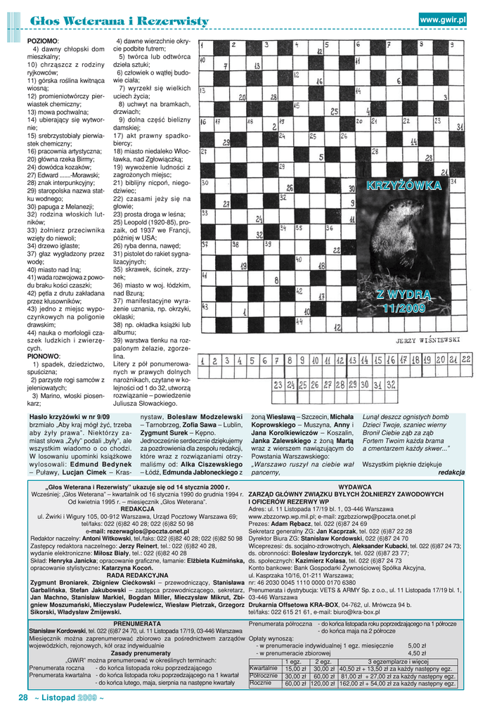 G³os Weterana i Rezerwisty POZIOMO: 4) dawny chłopski dom mieszkalny; 10) chrząszcz z rodziny ryjkowców; 11) górska roślina kwitnąca wiosną; 12) promieniotwórczy pierwiastek chemiczny; 13) mowa pochwalna; 14) ubierający się wytwornie; 15) srebrzystobiały pierwiastek chemiczny; 16) pracownia artystyczna; 20) główna rzeka Birmy; 24) dowódca kozaków; 27) Edward .......-Morawski; 28) znak interpunkcyjny; 29) staropolska nazwa statku wodnego; 30) papuga z Melanezji; 32) rodzina włoskich lutników; 33) żołnierz przeciwnika wzięty do niewoli; 34) drzewo iglaste; 37) głaz wygładzony przez wodę; 40) miasto nad Iną; 41) wada rozwojowa z powodu braku kości czaszki; 42) pętla z drutu zakładana przez kłusowników; 43) jedno z miejsc wypoczynkowych na poligonie drawskim; 44) nauka o morfologii czaszek ludzkich i zwierzęcych. PIONOWO: 1) spadek, dziedzictwo, spuścizna; 2) parzyste rogi samców z jeleniowatych; 3) Marino, włoski piosenkarz; www.gwir.pl 4) dawne wierzchnie okrycie podbite futrem; 5) twórca lub odtwórca dzieła sztuki; 6) człowiek o wątłej budowie ciała; 7) wyrzekł się wielkich uciech życia; 8) uchwyt na bramkach, drzwiach; 9) dolna część bielizny damskiej; 17) akt prawny spadkobiercy; 18) miasto niedaleko Włocławka, nad Zgłowiączką; 19) wywożenie ludności z zagrożonych miejsc; 21) biblijny nicpoń, niegodziwiec; 22) czasami jeży się na głowie; 23) prosta droga w leśna; 25) Leopold (1920-85), prozaik, od 1937 we Francji, później w USA; 26) ryba denna, nawęd; 31) pistolet do rakiet sygnalizacyjnych; 35) skrawek, ścinek, zrzynek; 36) miasto w woj. łódzkim, nad Bzurą; 37) manifestacyjne wyrażenie uznania, np. okrzyki, oklaski; 38) np. okładka książki lub albumu; 39) warstwa tlenku na rozpalonym żelazie, zgorzelina. Litery z pół ponumerowanych w prawych dolnych narożnikach, czytane w kolejności od 1 do 32, utworzą rozwiązanie – powiedzenie Juliusza Słowackiego. Hasło krzyżówki w nr 9/09 brzmiało „Aby kraj mógł żyć, trzeba aby żyły prawa”. Niektórzy zamiast słowa „Żyły” podali „były”, ale wszystkim wiadomo o co chodzi. W losowaniu upominki książkowe wylosowali: Edmund Bedynek – Puławy, Lucjan Cimek – Kras- nystaw, Bolesław Modzelewski – Tarnobrzeg, Zofia Sawa – Lublin, Zygmunt Surek – Kępno. Jednocześnie serdecznie dziękujemy za pozdrowienia dla zespołu redakcji, które wraz z rozwiązaniami otrzymaliśmy od: Alka Ciszewskiego – Łódź, Edmunda Jabłoneckiego z krzyŻówka z wydrą 11/2009 żoną Wiesławą – Szczecin, Michała Koprowskiego – Muszyna, Anny i Jana Korolkiewiczów – Koszalin, Janka Zalewskiego z żoną Martą wraz z wierszem nawiązującym do Powstania Warszawskiego: „Warszawo ruszył na ciebie wał pancerny, Lunął deszcz ognistych bomb Dzieci Twoje, szaniec wierny Bronił Ciebie ząb za ząb Fortem Twoim każda brama a cmentarzem każdy skwer...” Wszystkim pięknie dziękuje redakcja „Głos Weterana i Rezerwisty” ukazuje się od 14 stycznia 2000 r. Wcześniej: „Głos Weterana” – kwartalnik od 16 stycznia 1990 do grudnia 1994 r. Od kwietnia 1995 r. – miesięcznik „Głos Weterana”. REDAKCJA ul. Żwirki i Wigury 105, 00-912 Warszawa, Urząd Pocztowy Warszawa 69; tel/faks: 022 (6)82 40 28; 022 (6)82 50 98 e-mail: [email protected] Redaktor naczelny: Antoni Witkowski, tel./faks: 022 (6)82 40 28; 022 (6)82 50 98 Zastępcy redaktora naczelnego: Jerzy Reinert, tel.: 022 (6)82 40 28, wydanie elektroniczne: Miłosz Biały, tel.: 022 (6)82 40 28 Skład: Henryka Janicka; opracowanie graficzne, łamanie: Elżbieta Kuźmińska, opracowanie stylistyczne: Katarzyna Kocoń. RADA REDAKCYJNA Zygmunt Broniarek, Zbigniew Ciećkowski – przewodniczący, Stanisława Garbalińska, Stefan Jakubowski – zastępca przewodniczącego, sekretarz, Jan Machno, Stanisław Markiel, Bogdan Miller, Mieczysław Mikrut, Zbigniew Moszumański, Mieczysław Pudelewicz, Wiesław Pietrzak, Grzegorz Sikorski, Władysław Żmijewski. WYDAWCA ZARZĄD GŁÓWNY ZWIĄZKU BYŁYCH ŻOŁNIERZY ZAWODOWYCH I OFICERÓW REZERWY WP Adres: ul. 11 Listopada 17/19 bl. 1, 03-446 Warszawa www.zbzzorwp.wp.mil.pl; e-mail: [email protected] Prezes: Adam Rębacz, tel. 022 (6)87 24 69 Sekretarz generalny ZG: Jan Kacprzak, tel. 022 (6)87 22 28 Dyrektor Biura ZG: Stanisław Kordowski, 022 (6)87 24 70 Wiceprezesi: ds. socjalno-zdrowotnych, Aleksander Kubacki, tel. 022 (6)87 24 73; ds. obronności: Bolesław Izydorczyk, tel. 022 (6)87 23 77; ds. społecznych: Kazimierz Kolasa, tel. 022 (6)87 24 73 Konto bankowe: Bank Gospodarki Żywnościowej Spółka Akcyjna, ul. Kasprzaka 10/16, 01-211 Warszawa; nr: 46 2030 0045 1110 0000 0170 6380 Prenumerata i dystrybucja: VETS & ARMY Sp. z o.o., ul. 11 Listopada 17/19 bl. 1, 03-446 Warszawa Drukarnia Offsetowa KRA-BOX, 04-762, ul. Mrówcza 94 b. tel/faks: 022 615 21 61, e-mail: [email protected] PRENUMERATA Stanisław Kordowski, tel. 022 (6)87 24 70, ul. 11 Listopada 17/19, 03-446 Warszawa Miesięcznik można zaprenumerować zbiorowo za pośrednictwem zarządów wojewódzkich, rejonowych, kół oraz indywidualnie Zasady prenumeraty „GWiR” można prenumerować w określinych terminach: Prenumerata roczna - do końca listopada roku poprzedzającego Prenumerata kwartalna - do końca listopada roku poprzedzającego na 1 kwartał - do końca lutego, maja, sierpnia na następne kwartały Prenumerata półroczna - do końca listopada roku poprzedzającego na 1 półrocze - do końca maja na 2 półrocze Opłaty wynoszą: - w prenumeracie indywidualnej 1 egz. miesięcznie 5,00 zł - w prenumeracie zbiorowej 4,50 zł 1 egz. 2 egz. 3 egzemplarze i więcej Kwartalnie 15,00 zł 30,00 zł 40,50 zł + 13,50 zł za każdy następny egz. Półrocznie 30,00 zł 60,00 zł 81,00 zł + 27,00 zł za każdy następny egz. Rocznie 60,00 zł 120,00 zł 162,00 zł + 54,00 zł za każdy następny egz. 28 ~ Listopad 2009 ~