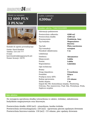 Obiekt na wynajem 12 600 PLN 2 3 PLN/m Lublin, Lubelskie 2 4200m Number oferty: 7166/3322/OHW Informacje podstawowe Powierzchnia całkowita: Powierzchnia działki: Przeznaczenie: Typ budynku: Kontakt do agenta prowadzącego Osoba: Karol Kondrat Telefon: 510 310 777 E-mail: [email protected] Numer licencji: 10278 Typ hali: Typ transakcji: Wysokość składowania: 4200 m2 4200 m2 Produkcja, Inny Magazynowobiurowy Płyta warstwowa wynajem 5m Lokalizacja Dzielnica: Miejscowość: Powiat: Województwo: Abramowice Lublin Lublin Lubelskie Opis techniczny Bramy: 1 Droga dojazdowa: Utwardzona Posadzka: Pyląca Przyłącza mocy (kW): 25 Rodzaj ogrzewania: CO własne Siatka słupów: 1m Dojazd dla TIR, Komunikacja miejska, Monitoring, Ochrona, Plac manewrowy, Prąd, Siła, Wentylacja, Woda, Zaplecze socjalne Opis obiektu Do wynajęcia ogrodzona działka (utwardzona w całości, trelinka), zabudowana budynkiem magazynowym oraz biurowym. Powierzchnia działki: 4200 [m2] - utwardzona, kostka trelinka Powierzchnia serwisu/magazynu: 220 [m2] - ogrzewana piecem opalanym drewnem Powierzchnia biurowa+szatnia: 130 [m2] - CO własne, piec opalany drewnem Do wynajęcia tylko w całości (tj. działka+magazyn+biuro). Cena najmu netto: 12 600 PLN/m-c Dodatkowo opłaty licznikowe i kaucja.