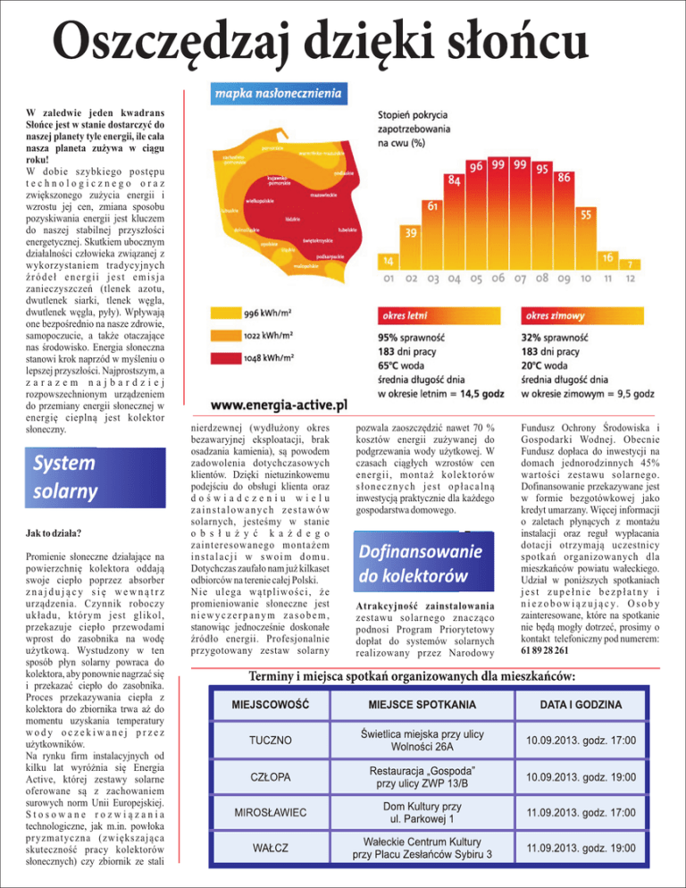 W zaledwie jeden kwadrans S³oñce jest w stanie dostarczyæ do naszej planety tyle energii, ile ca³a nasza planeta zu¿ywa w ci¹gu roku! W dobie szybkiego postêpu technologicznego oraz zwiêkszonego zu¿ycia energii i wzrostu jej cen, zmiana sposobu pozyskiwania energii jest kluczem do naszej stabilnej przysz³oœci energetycznej. Skutkiem ubocznym dzia³alnoœci cz³owieka zwi¹zanej z wykorzystaniem tradycyjnych Ÿróde³ energii jest emisja zanieczyszczeñ (tlenek azotu, dwutlenek siarki, tlenek wêgla, dwutlenek wêgla, py³y). Wp³ywaj¹ one bezpoœrednio na nasze zdrowie, samopoczucie, a tak¿e otaczaj¹ce nas œrodowisko. Energia s³oneczna stanowi krok naprzód w myœleniu o lepszej przysz³oœci. Najprostszym, a zarazem najbardziej rozpowszechnionym urz¹dzeniem do przemiany energii s³onecznej w energiê ciepln¹ jest kolektor s³oneczny. Jak to dzia³a? Promienie s³oneczne dzia³aj¹ce na powierzchniê kolektora oddaj¹ swoje ciep³o poprzez absorber znajduj¹cy siê wewn¹trz urz¹dzenia. Czynnik roboczy uk³adu, którym jest glikol, przekazuje ciep³o przewodami wprost do zasobnika na wodê u¿ytkow¹. Wystudzony w ten sposób p³yn solarny powraca do kolektora, aby ponownie nagrzaæ siê i przekazaæ ciep³o do zasobnika. Proces przekazywania ciep³a z kolektora do zbiornika trwa a¿ do momentu uzyskania temperatury wody oczekiwanej przez u¿ytkowników. Na rynku firm instalacyjnych od kilku lat wyró¿nia siê Energia Active, której zestawy solarne oferowane s¹ z zachowaniem surowych norm Unii Europejskiej. Stosowane rozwi¹zania technologiczne, jak m.in. pow³oka pryzmatyczna (zwiêkszaj¹ca skutecznoœæ pracy kolektorów s³onecznych) czy zbiornik ze stali nierdzewnej (wyd³u¿ony okres bezawaryjnej eksploatacji, brak osadzania kamienia), s¹ powodem zadowolenia dotychczasowych klientów. Dziêki nietuzinkowemu podejœciu do obs³ugi klienta oraz doœwiadczeniu wielu zainstalowanych zestawów solarnych, jesteœmy w stanie o b s ³ u ¿ y æ k a ¿ d e g o zainteresowanego monta¿em instalacji w swoim domu. Dotychczas zaufa³o nam ju¿ kilkaset odbiorców na terenie ca³ej Polski. Nie ulega w¹tpliwoœci, ¿e promieniowanie s³oneczne jest niewyczerpanym zasobem, stanowi¹c jednoczeœnie doskona³e Ÿród³o energii. Profesjonalnie przygotowany zestaw solarny pozwala zaoszczêdziæ nawet 70 % kosztów energii zu¿ywanej do podgrzewania wody u¿ytkowej. W czasach ci¹g³ych wzrostów cen energii, monta¿ kolektorów s³onecznych jest op³acaln¹ inwestycj¹ praktycznie dla ka¿dego gospodarstwa domowego. Atrakcyjnoœæ zainstalowania zestawu solarnego znacz¹co podnosi Program Priorytetowy dop³at do systemów solarnych realizowany przez Narodowy Fundusz Ochrony Œrodowiska i Gospodarki Wodnej. Obecnie Fundusz dop³aca do inwestycji na domach jednorodzinnych 45% wartoœci zestawu solarnego. Dofinansowanie przekazywane jest w formie bezgotówkowej jako kredyt umarzany. Wiêcej informacji o zaletach p³yn¹cych z monta¿u instalacji oraz regu³ wyp³acania dotacji otrzymaj¹ uczestnicy spotkañ organizowanych dla mieszkañców powiatu wa³eckiego. Udzia³ w poni¿szych spotkaniach jest zupe³nie bezp³atny i n i e z o b o w i ¹ z u j ¹ c y. O s o b y zainteresowane, które na spotkanie nie bêd¹ mog³y dotrzeæ, prosimy o kontakt telefoniczny pod numerem: 61 89 28 261