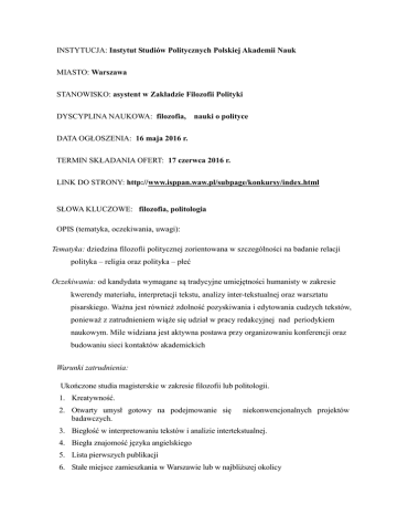 INSTYTUCJA: Instytut Studiów Politycznych Polskiej Akademii Nauk MIASTO: Warszawa STANOWISKO: asystent w Zakładzie Filozofii Polityki DYSCYPLINA NAUKOWA: filozofia, nauki o polityce DATA OGŁOSZENIA: 16 maja 2016 r. TERMIN SKŁADANIA OFERT: 17 czerwca 2016 r. LINK DO STRONY: http://www.isppan.waw.pl/subpage/konkursy/index.html SŁOWA KLUCZOWE: filozofia, politologia OPIS (tematyka, oczekiwania, uwagi): Tematyka: dziedzina filozofii politycznej zorientowana w szczególności na badanie relacji polityka – religia oraz polityka – płeć Oczekiwania: od kandydata wymagane są tradycyjne umiejętności humanisty w zakresie kwerendy materiału, interpretacji tekstu, analizy inter-tekstualnej oraz warsztatu pisarskiego. Ważna jest również zdolność pozyskiwania i edytowania cudzych tekstów, ponieważ z zatrudnieniem wiąże się udział w pracy redakcyjnej nad periodykiem naukowym. Mile widziana jest aktywna postawa przy organizowaniu konferencji oraz budowaniu sieci kontaktów akademickich Warunki zatrudnienia: Ukończone studia magisterskie w zakresie filozofii lub politologii. 1. Kreatywność. 2. Otwarty umysł gotowy na podejmowanie się badawczych. niekonwencjonalnych projektów 3. Biegłość w interpretowaniu tekstów i analizie intertekstualnej. 4. Biegła znajomość języka angielskiego 5. Lista pierwszych publikacji 6. Stałe miejsce zamieszkania w Warszawie lub w najbliższej okolicy Wymagane dokumenty: 1. Podanie o przyjęcie do pracy* 2. Życiorys 3. Odpis dyplomu magisterskiego 4. Informacja dotycząca doświadczenia naukowego, prowadzonych badań, zajęć dydaktycznych 5. Oświadczenie, że w przypadku wygrania konkursu ISP PAN będzie pierwszym miejscem pracy 6. Opinia samodzielnego pracownika naukowego o predyspozycjach i przydatności Kandydata do pracy naukowo-badawczej 7. Oświadczenie o akceptacji warunków konkursu obowiązujących w ISP PAN . Informacje dodatkowe i terminy: Dokumenty należy składać w Sekretariacie Instytutu Studiów Politycznych PAN, pok. 1. ul. Polna 18/20, 00-625 Warszawa. Termin składania dokumentów upływa z dniem 17 czerwca 2016 r. Rozstrzygnięcie konkursu nastąpi w dniu 24 czerwca 2016 r. Data zatrudnienia: 01 lipca 2016 r. O wyniku konkursu każdy z Kandydatów zostanie poinformowany. Instytut Studiów Politycznych PAN nie zapewnia mieszkań. . * Prosimy o dopisanie w podaniu następującej klauzuli: „Wyrażam zgodę na przetwarzanie moich danych osobowych zawartych w mojej ofercie pracy dla potrzeb niezbędnych do realizacji procesu rekrutacji (zgodnie z ustawą z dnia 29 sierpnia 1997 roku o ochronie danych osobowych, Dz. U. Nr 133, poz. 883 z późn. zm.).