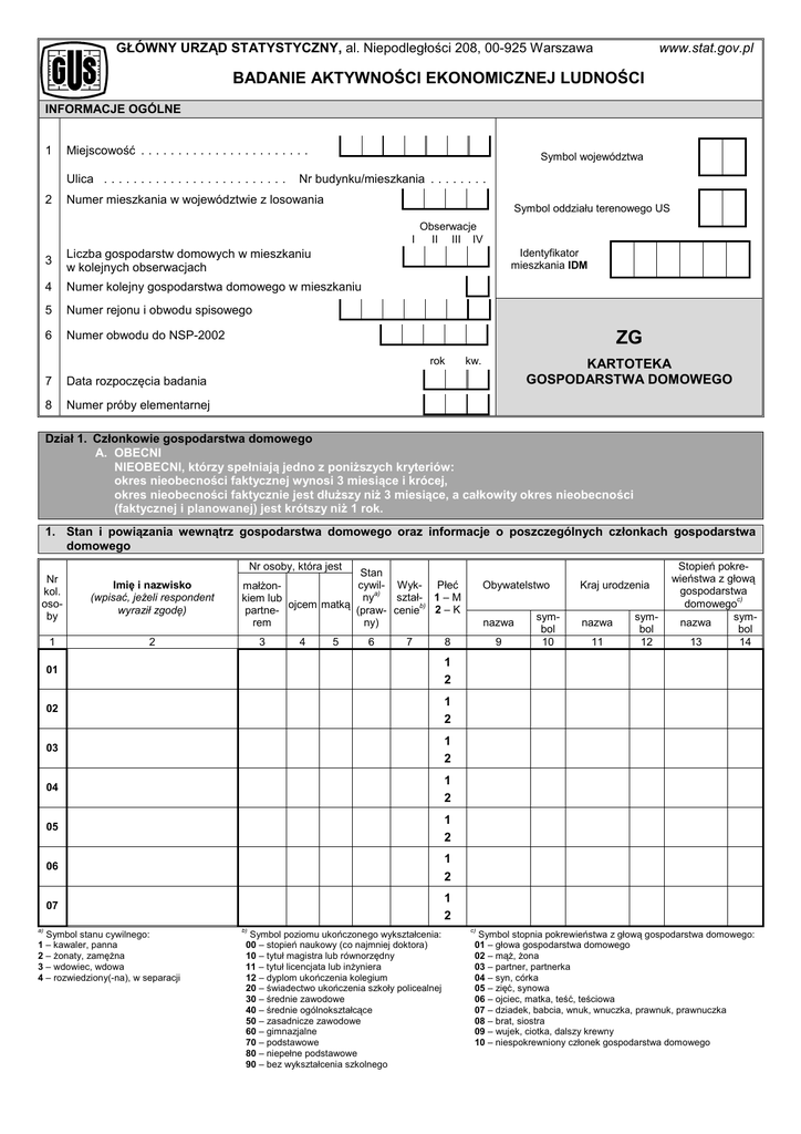 GŁÓWNY URZĄD STATYSTYCZNY, al. Niepodległości 208, 00-925 Warszawa www.stat.gov.pl BADANIE AKTYWNOŚCI EKONOMICZNEJ LUDNOŚCI INFORMACJE OGÓLNE 1 Miejscowość . . . . . . . . . . . . . . . . . . . . . . . Ulica . . . . . . . . . . . . . . . . . . . . . . . . . 2 Symbol województwa Nr budynku/mieszkania . . . . . . . . Numer mieszkania w województwie z losowania Symbol oddziału terenowego US Obserwacje I II III IV 3 Liczba gospodarstw domowych w mieszkaniu w kolejnych obserwacjach 4 Numer kolejny gospodarstwa domowego w mieszkaniu 5 Numer rejonu i obwodu spisowego 6 Numer obwodu do NSP-2002 Identyfikator mieszkania IDM ZG rok 7 Data rozpoczęcia badania 8 Numer próby elementarnej kw. KARTOTEKA GOSPODARSTWA DOMOWEGO Dział 1. Członkowie gospodarstwa domowego A. OBECNI NIEOBECNI, którzy spełniają jedno z poniższych kryteriów: okres nieobecności faktycznej wynosi 3 miesiące i krócej, okres nieobecności faktycznie jest dłuższy niż 3 miesiące, a całkowity okres nieobecności (faktycznej i planowanej) jest krótszy niż 1 rok. 1. Stan i powiązania wewnątrz gospodarstwa domowego oraz informacje o poszczególnych członkach gospodarstwa domowego Nr osoby, która jest Nr kol. osoby Imię i nazwisko (wpisać, jeżeli respondent wyraził zgodę) 1 2 Stan cywil- Wyk- Płeć małżonnya) ształ- 1 – M kiem lub ojcem matką (praw- cenieb) 2 – K partneny) rem 3 4 5 6 7 1 2 02 1 2 03 1 2 04 1 2 05 1 2 06 1 2 07 1 2 b) Symbol poziomu ukończonego wykształcenia: 00 – stopień naukowy (co najmniej doktora) 10 – tytuł magistra lub równorzędny 11 – tytuł licencjata lub inżyniera 12 – dyplom ukończenia kolegium 20 – świadectwo ukończenia szkoły policealnej 30 – średnie zawodowe 40 – średnie ogólnokształcące 50 – zasadnicze zawodowe 60 – gimnazjalne 70 – podstawowe 80 – niepełne podstawowe 90 – bez wykształcenia szkolnego nazwa 8 01 a) Symbol stanu cywilnego: 1 – kawaler, panna 2 – żonaty, zamężna 3 – wdowiec, wdowa 4 – rozwiedziony(-na), w separacji Obywatelstwo 9 c) symbol 10 Kraj urodzenia nazwa 11 symbol 12 Stopień pokrewieństwa z głową gospodarstwa domowegoc) symnazwa bol 13 14 Symbol stopnia pokrewieństwa z głową gospodarstwa domowego: 01 – głowa gospodarstwa domowego 02 – mąż, żona 03 – partner, partnerka 04 – syn, córka 05 – zięć, synowa 06 – ojciec, matka, teść, teściowa 07 – dziadek, babcia, wnuk, wnuczka, prawnuk, prawnuczka 08 – brat, siostra 09 – wujek, ciotka, dalszy krewny 10 – niespokrewniony członek gospodarstwa domowego 2. Dodatkowe informacje o poszczególnych członkach gospodarstwa domowego Czy w bieżącym Nr roku Nr obRok miał(-ła) oso- ser- uroPan/ by wa- dzenia Pani już cji urodziny? 1 – tak 2 – nie 1 2 3 4 Okres nieobecności w gospodarstwie domowym Okres przebywania w Polsce Stopieńd) Gdzie Pan/Pani miesznieplanokał(-ła) rok temu? pełnowanyf) spraw(łącznie 1 - w tej samej gminie ności z fakty- 2 - w innej gminie, ale w tym (wpicznym) faktysamym województwie sać, czny [wypeł- 3 - w innym woj. faktyjeżeli (w miee) nić tylko (nazwa/symbol) czny respondla osób 4 - w innym kraju siądent przebycach) (nazwa/symbol) wyraził wających zgodę) w Polsce krócej niż 1 rok] 5 6 7 8 9 Miejsce pobytu osoby nieobecnej Przyczyna planoniewanyg) obec(łącznościh) nie z faktycznym) 10 11 (przebywającej w Polsce - nazwa województwa i miejscowości oraz symbol terytorialny miejscowości; przebywającej za granicą - nazwa i symbol kraju) 12 UczestNr nictwo ankiety w baZD daniui) 13 14 I II 01 III IV I II 02 III IV I II 03 III IV I II 04 III IV I II 05 III IV I II 06 III IV I II 07 III IV d) Symbol stopnia niepełnosprawności: 1 – orzeczenie o znacznym stopniu niepełnosprawności lub równoważne, 2 – orzeczenie o umiarkowanym stopniu niepełnosprawności lub równoważne, 3 – orzeczenie o lekkim stopniu niepełnosprawności lub równoważne, 9 – brak aktualnego orzeczenia o stopniu niepełnosprawności lub równoważnego; dziecko poniżej 16 lat. e) Symbol faktycznego okresu przebywania w Polsce: 3 miesiące lub krócej – symb. 98; dłużej niż 3 miesiące, ale krócej niż 1 rok – symb. 97; 1 rok lub dłużej – dokładna liczba lat (z zakresu 01 – 96); od urodzenia – symb. 00. f) Symbol planowanego okresu przebywania w Polsce: krócej niż 12 miesięcy – dokładna liczba miesięcy; 1 rok lub dłużej – symb. 12. g) Symbol planowanego okresu nieobecności: krócej niż 12 miesięcy – dokładna liczba miesięcy; 1 rok lub dłużej – symb. 12. Uwaga: Symb. 12 może wystąpić tylko w przypadku, kiedy okres nieobecności faktycznej nie przekracza 3 miesięcy. W przypadku gdy okres nieobecności faktycznej jest dłuższy niż 3 miesiące i osoba planuje przebywać poza gospodarstwem domowym (nieobecność faktyczna i planowana) 1 rok lub dłużej, ankieter powinien spisać tę osobę w części B lub C Kartoteki ZG. h) Symbol przyczyny nieobecności: na terenie Polski w gospodarstwach zbiorowych w związku z: 1 – wykonywaniem pracy przebywa w hotelu robotniczym; 2 – nauką przebywa w internacie, bursie, domu studenckim; 3 – innymi przyczynami (przebywa w domu pomocy społecznej, domu rencistów, domu dziecka itp.); na terenie Polski poza gospodarstwami zbiorowymi w związku z: 4 – wykonywaniem pracy; 5 – innymi przyczynami (np. pobyt w szpitalu); za granicą w związku z: 6 – wykonywaniem pracy; 7 – poszukiwaniem pracy; 8 – nauką; 9 – innymi przyczynami. i) Symbol uczestnictwa w badaniu: 1 – jest ankieta ZD, 2 – nieobecny(-na), brak ankiety ZD, 3 – odmówił(-ła) wywiadu, brak ankiety ZD, 4 – przybył(-ła), jest ankieta ZD, 5 – przybył(-ła) i nieobecny(-na), brak ankiety, 6 – przybył(-ła) i odmówił(-ła) wywiadu, brak ankiety ZD, 7 – opuścił(-ła) gospodarstwo domowe, brak ankiety ZD. B. PRZEBYWAJĄCY NA TERENIE KRAJU W GOSPODARSTWACH ZBIOROWYCH POWYŻEJ 3 MIESIĘCY (pobyt faktyczny), DLA KTÓ