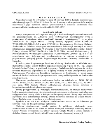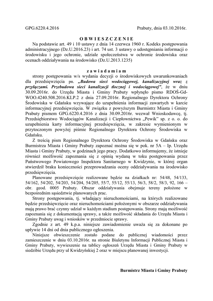 GPG.6220.4.2016 Prabuty, dnia 03.10.2016r. OBWIESZCZENIE Na podstawie art. 49 i 10 ustawy z dnia 14 czerwca 1960 r. Kodeks postępowania administracyjnego (Dz.U.2016.23) i art. 74 ust. 3 ustawy o udostępnianiu informacji o środowisku i jego ochronie, udziale społeczeństwa w ochronie środowiska oraz ocenach oddziaływania na środowisko (Dz.U.2013.1235) zawiadamiam strony postępowania w/s wydania decyzji o środowiskowych uwarunkowaniach dla przedsięwzięcia pn. „Budowa sieci wodociągowej, kanalizacyjnej wraz z przyłączami. Przebudowa sieci kanalizacji tłocznej i wodociągowej”, że w dniu 30.09.2016r. do Urzędu Miasta i Gminy Prabuty wpłynęło pismo RDOŚ-GdWOO.4240.508.2016.KLP.2 z dnia 27.09.2016r. Regionalnego Dyrektora Ochrony Środowiska w Gdańsku wzywające do uzupełnienia informacji zawartych w karcie informacyjnej przedsięwzięcia. W związku z powyższym Burmistrz Miasta i Gminy Prabuty pismem GPG.6220.4.2016 z dnia 30.09.2016r. wezwał Wnioskodawcę, tj. Przedsiębiorstwo Wodociągów Kanalizacji i Ciepłownictwa „Pewik” sp. z o. o. do uzupełnienia karty informacyjnej przedsięwzięcia, w zakresie wymienionym w przytoczonym powyżej piśmie Regionalnego Dyrektora Ochrony Środowiska w Gdańsku. Z treścią pism Regionalnego Dyrektora Ochrony Środowiska w Gdańsku oraz Burmistrza Miasta i Gminy Prabuty zapoznać można się w pok. nr 5A – Ip. Urzędu Miasta i Gminy Prabuty, w godzinach jego pracy. Dodatkowo informujemy, że istnieje również możliwość zapoznania się z opinią wydaną w toku postępowania przez Państwowego Powiatowego Inspektora Sanitarnego w Kwidzynie, w której organ stwierdził braku konieczności przeprowadzania oceny oddziaływania na środowisko przedsięwzięcia. Planowane przedsięwzięcie realizowane będzie na działkach nr: 54/48, 54/133, 54/162, 54/202, 54/203, 54/204, 54/205, 55/7, 55/12, 55/13, 56/3, 58/2, 58/3, 92, 166 – obr. geod. 0005 Prabuty. Obszar oddziaływania obejmuje tereny położone w bezpośrednim sąsiedztwie planowanych prac. Strony postępowania, tj. władający nieruchomościami, na których realizowane będzie przedsięwzięcie oraz nieruchomościami położonymi w obszarze oddziaływania mają prawo brać czynny udział w każdym stadium postępowania. Strony mają możliwość zapoznania się z dokumentacją sprawy, a także możliwość składania do Urzędu Miasta i Gminy Prabuty uwag i wniosków w przedmiocie sprawy. Zgodnie z art. 49 k.p.a. niniejsze zawiadomienie uważa się za dokonane po upływie 14 dni od dnia publicznego ogłoszenia. Niniejsze obwieszczenie zostało podane do publicznej wiadomości przez zamieszczenie w dniu 03.10.2016r. na stronie Biuletynu Informacji Publicznej Miasta i Gminy Prabuty, wywieszenie na tablicy ogłoszeń Urzędu Miasta i Gminy Prabuty w siedzibie Urzędu przy ul Kwidzyńskiej 2 oraz w miejscu planowanej inwestycji. Burmistrz Miasta i Gminy Prabuty