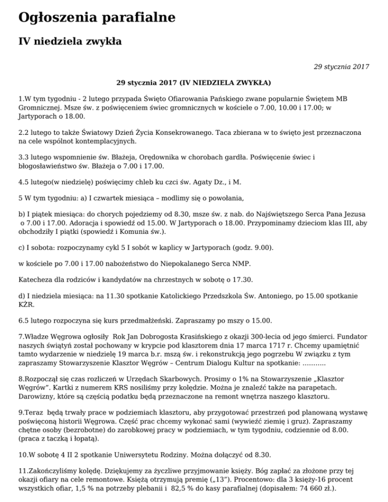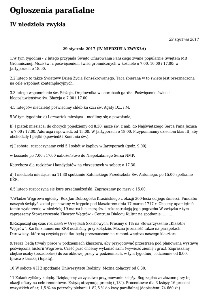 Ogłoszenia parafialne IV niedziela zwykła 29 stycznia 2017 29 stycznia 2017 (IV NIEDZIELA ZWYKŁA) 1.W tym tygodniu - 2 lutego przypada Święto Ofiarowania Pańskiego zwane popularnie Świętem MB Gromnicznej. Msze św. z poświęceniem świec gromnicznych w kościele o 7.00, 10.00 i 17.00; w Jartyporach o 18.00. 2.2 lutego to także Światowy Dzień Życia Konsekrowanego. Taca zbierana w to święto jest przeznaczona na cele wspólnot kontemplacyjnych. 3.3 lutego wspomnienie św. Błażeja, Orędownika w chorobach gardła. Poświęcenie świec i błogosławieństwo św. Błażeja o 7.00 i 17.00. 4.5 lutego(w niedzielę) poświęcimy chleb ku czci św. Agaty Dz., i M. 5 W tym tygodniu: a) I czwartek miesiąca – modlimy się o powołania, b) I piątek miesiąca: do chorych pojedziemy od 8.30, msze św. z nab. do Najświętszego Serca Pana Jezusa o 7.00 i 17.00. Adoracja i spowiedź od 15.00. W Jartyporach o 18.00. Przypominamy dzieciom klas III, aby obchodziły I piątki (spowiedź i Komunia św.). c) I sobota: rozpoczynamy cykl 5 I sobót w kaplicy w Jartyporach (godz. 9.00). w kościele po 7.00 i 17.00 nabożeństwo do Niepokalanego Serca NMP. Katecheza dla rodziców i kandydatów na chrzestnych w sobotę o 17.30. d) I niedziela miesiąca: na 11.30 spotkanie Katolickiego Przedszkola Św. Antoniego, po 15.00 spotkanie KŻR. 6.5 lutego rozpoczyna się kurs przedmałżeński. Zapraszamy po mszy o 15.00. 7.Władze Węgrowa ogłosiły Rok Jan Dobrogosta Krasińskiego z okazji 300-lecia od jego śmierci. Fundator naszych świątyń został pochowany w krypcie pod klasztorem dnia 17 marca 1717 r. Chcemy upamiętnić tamto wydarzenie w niedzielę 19 marca b.r. mszą św. i rekonstrukcją jego pogrzebu W związku z tym zapraszamy Stowarzyszenie Klasztor Węgrów – Centrum Dialogu Kultur na spotkanie: ……….. 8.Rozpoczął się czas rozliczeń w Urzędach Skarbowych. Prosimy o 1% na Stowarzyszenie „Klasztor Węgrów”. Kartki z numerem KRS nosiliśmy przy kolędzie. Można je znaleźć także na parapetach. Darowizny, które są częścią podatku będą przeznaczone na remont wnętrza naszego klasztoru. 9.Teraz będą trwały prace w podziemiach klasztoru, aby przygotować przestrzeń pod planowaną wystawę poświęconą historii Węgrowa. Część prac chcemy wykonać sami (wywieźć ziemię i gruz). Zapraszamy chętne osoby (bezrobotne) do zarobkowej pracy w podziemiach, w tym tygodniu, codziennie od 8.00. (praca z taczką i łopatą). 10.W sobotę 4 II 2 spotkanie Uniwersytetu Rodziny. Można dołączyć od 8.30. 11.Zakończyliśmy kolędę. Dziękujemy za życzliwe przyjmowanie księży. Bóg zapłać za złożone przy tej okazji ofiary na cele remontowe. Księżą otrzymują premię („13”). Procentowo: dla 3 księży-16 procent wszystkich ofiar, 1,5 % na potrzeby plebanii i 82,5 % do kasy parafialnej (dopisałem: 74 660 zł.). Uwagi pokolędowe omówimy za tydzien. 12.Podsumowanie kolędy: Domów-1213(odwiedziliśmy ok.1100); Rodzin-1387(odwiedzonych ok.1250);Parafian: ok.3400;Dzieci-620;Mł.-754;Chorzy-170;Konkubinatów.-37; Samotnie wychowujacych.-53; Separacje-15; Rozw.-35; inne wyzn.-ok.50; Rodz. W potrzebie-ok.20. 13.Można jeszcze umówić się na kolędę indywidualną.