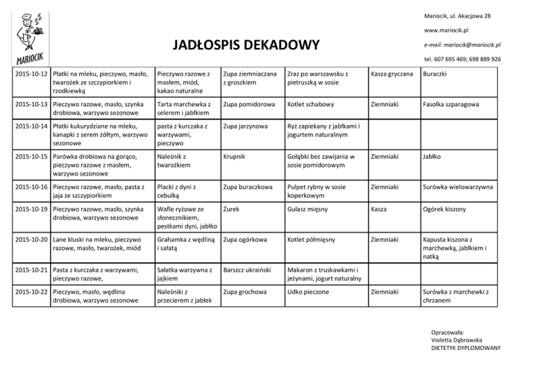 Mariocik, ul. Akacjowa 28 www.mariocik.pl JADŁOSPIS DEKADOWY e-mail: [email protected] tel. 607 695 469; 698 889 926 2015-10-12 Płatki na mleku, pieczywo, masło, twarożek ze szczypiorkiem i rzodkiewką Pieczywo razowe z masłem, miód, kakao naturalne Zupa ziemniaczana z groszkiem Zraz po warszawsku z pietruszką w sosie Kasza gryczana Buraczki 2015-10-13 Pieczywo razowe, masło, szynka drobiowa, warzywo sezonowe Tarta marchewka z selerem i jabłkiem Zupa pomidorowa Kotlet schabowy Ziemniaki Fasolka szparagowa 2015-10-14 Płatki kukurydziane na mleku, kanapki z serem żółtym, warzywo sezonowe pasta z kurczaka z warzywami, pieczywo Zupa jarzynowa Ryż zapiekany z jabłkami i jogurtem naturalnym 2015-10-15 Parówka drobiowa na gorąco, pieczywo razowe z masłem, warzywo sezonowe Naleśnik z twarożkiem Krupnik Gołąbki bez zawijania w sosie pomidorowym Ziemniaki Jabłko 2015-10-16 Pieczywo razowe, masło, pasta z jaja ze szczypiorkiem Placki z dyni z cebulką Zupa buraczkowa Pulpet rybny w sosie koperkowym Ziemniaki Surówka wielowarzywna 2015-10-19 Pieczywo razowe, masło, szynka drobiowa, warzywo sezonowe Wafle ryżowe ze Żurek słonecznikiem, pestkami dyni, jabłko Gulasz mięsny Kasza Ogórek kiszony 2015-10-20 Lane kluski na mleku, pieczywo razowe, masło, twarożek, miód Grahamka z wędliną i sałatą Zupa ogórkowa Kotlet półmięsny Ziemniaki Kapusta kiszona z marchewką, jabłkiem i natką 2015-10-21 Pasta z kurczaka z warzywami, pieczywo razowe, Sałatka warzywna z jajkiem Barszcz ukraiński Makaron z truskawkami i jeżynami, jogurt naturalny 2015-10-22 Pieczywo, masło, wędlina drobiowa, warzywo sezonowe Naleśniki z przecierem z jabłek Zupa grochowa Udko pieczone Ziemniaki Surówka z marchewki z chrzanem Opracowała: Violetta Dąbrowska DIETETYK DYPLOMOWANY 2015-10-23 Pieczywo mieszane, masło, ser żółty, ogórek kiszony, Ciasto drożdżowe z mąki razowej z rodzynkami, kawa zbożowa z mlekiem Kapuśniak Filet rybny duszony w warzywach Ziemniaki Jabłko Opracowała: Violetta Dąbrowska DIETETYK DYPLOMOWANY