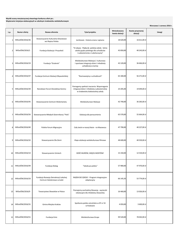 Wyniki oceny merytorycznej otwartego konkursu ofert pn.: Wspieranie inicjatyw edukacyjnych w szkolnym środowisku wielokulturowym Warszawa 1 czerwca 2016 r. L.p. Wnioskowana kwota dotacji Kwota przyznanej dotacji Numer oferty Nazwa oferenta Tytuł projektu 1 WIEwSŚW/2016/36 Stowarzyszenie Kulturalno-Oświatowe wsi Ropica Polska Łemkowie - historia znana i opisana 18 620,00 16 611,00 zł 2 WIEwSŚW/2016/1 Fundacja Edukacja i Przyszłość "III edycja - Pójdę do polskiej szkoły - letnia szkoła języka polskiego dla uchodźców i cudzoziemców z Lubelszczyzny" 45 850,00 40 243,00 zł 3 WIEwSŚW/2016/19 Fundacja "Ocalenie" Wielokulturowe Wakacje 2 kulturowa i sportowa integracja dzieci i młodzieży uchodźczej w Łomży 42 120,00 36 666,00 zł 4 WIEwSŚW/2016/47 Fundacja Centrum Edukacji Obywatelskiej "Rozmawiajmy o uchodźcach" 65 180,00 56 271,00 zł 5 WIEwSŚW/2016/39 Narodowe Forum Doradztwa Kariery Pomagamy spełniać marzenia. Wspomaganie integracji dzieci i młodzieży cudzoziemskiej w środowisku białostockiej szkoły 23 205,00 19 699,00 zł 6 WIEwSŚW/2016/45 Stowarzyszenie Centrum Wolontariatu Wielokulturowe Wakacje 42 740,00 36 283,00 zł 7 WIEwSŚW/2016/56 Stowarzyszenie Młodych Dziennikarzy "Polis" Edukacja dla porozumienia 65 570,00 55 664,00 zł 8 WIEwSŚW/2016/40 Polskie Forum Migracyjne Cały świat w naszej klasie - na Mazowszu 47 790,00 40 227,00 zł 9 WIEwSŚW/2016/32 Stowarzyszenie Dla Ziemi Klaps-edukacja wielokulturowa filmowa 48 600,00 40 559,00 zł 10 WIEwSŚW/2016/14 Stowarzyszenie Uśmiech DOŚĆ MURÓW, WIĘCEJ MOSTÓW! 15 150,00 12 534,00 zł 11 WIEwSŚW/2016/49 Fundacja Dialog "Szkoła po polsku" 57 980,00 47 970,00 zł 12 WIEwSŚW/2016/33 Fundacja Rozwoju Demokracji Lokalnej Centrum Szkoleniowe w Łodzi RAZEM DO SZKOŁY - Program integracyjnoadaptacyjny 66 145,50 53 774,00 zł 13 WIEwSŚW/2016/9 Towarzystwo Słowaków w Polsce Poznajemy wschodnią Słowację - wycieczki edukacyjne dla młodzieży słowackiej 16 460,00 13 026,00 zł 14 WIEwSŚW/2016/31 Gmina Miejska Kraków Spotkania polsko-ukraińskie w SP nr 53 w Krakowie 4 059,00 3 600,00 zł 15 WIEwSŚW/2016/51 Fundacja Emic Wielokulturowa Grupa 99 520,00 78 042,00 zł Uwagi 16 WIEwSŚW/2016/7 Fundacja EDM "Swietłaia Niediela" - Teatr życiem pisany. 11 047,88 8 584,00 zł 17 WIEwSŚW/2016/43 Fundacja MultiOcalenie Wakacje z językiem polskim 51 800,00 40 247,00 zł 18 WIEwSŚW/2016/28 Radomskie Stowarzyszenie Romów "Romano Waśt" (Pomocna Dłoń) Szkoła przyjazna imigrantom 23 567,00 0,00 zł 19 WIEwSŚW/2016/23 Fundacja na rzecz Różnorodności Społecznej "Wszystkie dzieci nasze są" 79 015,00 0,00 zł 20 WIEwSŚW/2016/8 FUNDACJA MAXIMUM JESTEŚMY WSPÓLNOTĄ. Polsko-romskołemkowskie warsztaty dialogu kulturowego i społecznego. 36 100,00 0,00 zł 21 WIEwSŚW/2016/17 Gmina Nysa NYSA - DRUGIE WRAŻENIE 10 365,00 0,00 zł 22 WIEwSŚW/2016/25 Diecezjalny Ośrodek Kultury Prawosławnej "Elpis" Poznać, cenić i zachować dla potomnych 26 400,00 0,00 zł 23 WIEwSŚW/2016/30 Fundacja Dom Kultury Serce Targówka 16 540,00 0,00 zł 24 WIEwSŚW/2016/6 STOWARZYSZENIE KULTURALNE POCZTOWKA Edukacja wielokulturowości - integracyjne działania w środowisku szkolnym 42 000,00 0,00 zł 25 WIEwSŚW/2016/12 NOMADA Stowarzyszenie na Rzecz Integracji Społeczeństwa Wielokulturowego Edukacja dla integracji 52 318,00 0,00 zł 26 WIEwSŚW/2016/44 Towarzystwo Demokratyczne Wschód Wielokulturowa szkoła: od akceptacji do integracji 281 950,00 0,00 zł 27 WIEwSŚW/2016/20 Związek Romów Polskich Warsztaty kulturowe połączone z wydaniem gry 21 200,00 0,00 zł 28 WIEwSŚW/2016/34 Fundacja Pomocy Rodzinie SOWA "Razem się uczymy - razem się bawimy" 50 124,00 0,00 zł 29 WIEwSŚW/2016/37 Fundacja Świat na Wyciągnięcie Ręki Wielokulturowa Lesznowola w komórce 33 929,00 0,00 zł 30 WIEwSŚW/2016/24 Fundacja Edu & More Li, Nguyen i Nowak razem w szkole" 72 343,00 0,00 zł 31 WIEwSŚW/2016/53 Instytut Kultury Narodów Kaukazu Wielokulturowe inicjatywy edukacyjne Sintaru 78 775,00 0,00 zł 32 WIEwSŚW/2016/22 Stowarzyszenie Romów w Bydgoszczy "ROMANO DZIPEN" Romowie: znajomi nieznani 5 300,00 0,00 zł 33 WIEwSŚW/2016/50 Fundacja HerStory Żywe Biblioteki w szkołach Lubelszczyzny. Otwieramy na wielokulturowość 30 760,00 0,00 zł 34 WIEwSŚW/2016/46 Fundacja Inicjatyw Społecznych SYNERGIA wieloCOOLturowe szkoły - integracja międzykulturowa po wrocławsku 18 960,00 0,00 zł 35 WIEwSŚW/2016/16 Fundacja Wspierania Kultury i Języka Polskiego im. M. Reja Wsparcie na starcie. 145 400,00 36 WIEwSŚW/2016/29 Małopolskie Stowarzyszenie Romów Jamaro Integracyjna pół kolonia 26 200,00 0,00 zł 37 WIEwSŚW/2016/42 Oddział Terenowy Towarzystwa Rozwijania Aktywności Dzieci SZANSA Warszawa - Ochota Polska przestrzeń edukacyjna i jej adaptacja do potrzeb dzieci odmiennych kulturowo oraz tych, dla których język polski jest językiem obcym 85 550,00 0,00 zł 38 WIEwSŚW/2016/41 FUNDACJA DOBROCZYŃCA Lodołamacz stereotypów-cykl debat uczniowskich na temat wielokulturowości 32 090,00 0,00 zł 39 WIEwSŚW/2016/21 Stowarzyszenie Romów w Polsce Poznajmy się! -cykl spotkań edukacyjnokulturalnych dla dzieci 48 140,00 0,00 zł 40 WIEwSŚW/2016/2 Stowarzyszenie Szansa w Zawierciu Warsztat Twórczej Integracji 23 150,00 0,00 zł 41 WIEwSŚW/2016/27 Centralna Rada Romów w Polsce, Centrum Doradztwa i Informacji dla Romów Pozytywne relacje międzykulturowe w radomskich szkołach 47 010,00 0,00 zł 27 510,00 0,00 zł Oferta nie spełniła wymogu, 0,00 zł o którym mowa w 4 § ust. 7 Regulaminu konkursu 42 WIEwSŚW/2016/10 Fundacja Family Center Rozwój kompetencji nauczycieli i wychowawców w budowaniu pozytywnych relacji w szkolnym środowisku wielokulturowym KULTURA I MY 43 WIEwSŚW/2016/11 Fundacja Ewy Johansen TALENT Artystyczne Lato - Art Summer Camp 34 002,50 0,00 zł 44 WIEwSŚW/2016/52 Fundacja "Białoruski Dom" Polska, Ukraina, Białoruś, Rosja - cykl spotkań integracyjnych dla dzieci i rodziców 26 025,00 0