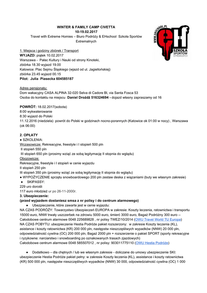 WINTER & FAMILY CAMP CIVETTA 10-19.02.2017 Travel with Extreme Homies – Biuro Podróży & EHschool Szkoła Sportów Extremalnych 1. Miejsca i godziny zbiórek / Transport WYJAZD: piątek 10.02.2017 Warszawa - Pałac Kultury i Nauki od strony Kinoteki, zbiórka 18.30 wyjazd 19.00 Katowice: Plac Sejmu Śląskiego (wjazd od ul. Jagiellońskiej) zbiórka 23.45 wyjazd 00.15 Pilot: Julia Piasecka 604585187 Adres pensjonatu: Dom wakacyjny CASA ALPINA 32-020 Selva di Cadore Bl, via Santa Fosca 53 Osoba do kontaktu na miejscu Daniel Drożdż 516324694 - dojazd własny zapraszamy od 16 POWRÓT: 18.02.2017(sobota) 8:00 wykwaterowanie 8:30 wyjazd do Polski 11.12.2016 (niedziela) powrót do Polski w godzinach nocno-porannych (Katowice ok 01:00 w nocy) , Warszawa (ok 06:00) 2. OPŁATY ● SZKOLENIA: Wczasowicze: Rekreacyjne, freestyle i I stopień 500 pln II stopień 550 pln III stopień 650 pln (prosimy wziąć ze sobą legitymację II stopnia do wglądu) Obozowicze: Rekreacyjne, freestyle i I stopień w cenie wyjazdu II stopień 250 pln III stopień 350 pln (prosimy wziąć ze sobą legitymację II stopnia do wglądu) ● WYPOŻYCZENIE sprzętu snowboardowego 200 pln zestaw deska z wiązaniami (buty we własnym zakresie) ● SKIPASSY: 229 uro dorośli 117 euro młodzież ur po 26-11-2000r. 3. Ubezpieczenie: (przed wyjazdem dostaniesz smsa z nr polisy i do centrum alarmowego) ● Ubezpieczenie, które zawarte jest w cenie wyjazdu: NA CZAS PODRÓŻY: Towarzystwo Ubezpieczeń EUROPA w zakresie: Koszty leczenia, ratownictwa i transportu 15000 euro, NNW trwały uszczerbek na zdrowiu 5000 euro, śmierć 3000 euro, Bagaż Podróżny 300 euro -Całodobowe centrum alarmowe 0048 225689828 , nr polisy TWEZ/10/2014 (OWU Travel World TU Europa) NA CZAS POBYTU: ubezpieczenie Hestia Podróże pakiet rozszerzony: w zakresie Koszty leczenia (KL), asistance i koszty ratownictwa (KR) 200 000 pln, następstw nieszczęśliwych wypadków (NNW) 20 000 pln, odpowiedzialność cywilna (OC) 200 000 pln, Bagaż 2000 pln + rozszerzenie o pakiet SPORT (sporty rekreacyjne i ryzykowne: narciarstwo i snowboarding po oznakowanych trasach zjazdowych) Całodobowe centrum alarmowe 0048 585507012 , nr polisy: 903011775110 (OWU Hestia Podróże) ● Dodatkowo – dla chętnych / lub we własnym zakresie - doliczane do umowy ubezpieczenie SKI: ubezpieczenie Hestia Podróże pakiet pełny: w zakresie Koszty leczenia (KL), assistance i koszty ratownictwa (KR) 500 000 pln, następstw nieszczęśliwych wypadków (NNW) 30 000, odpowiedzialność cywilna (OC) 1 000 000, Bagaż 5 000 pln – pakiet sport plus: sporty rekreacyjne, ryzykowne i extremalne (jazda po trasach + freeride) Składka 80 pln Całodobowe centrum alarmowe 0048 585507012 , nr polisy: 903011775113 (OWU Hestia Podróże) Zalecane jest aby każdy uczestnik wyjazdów zagranicznych posiadały ważną kartę EKUZ (Europejska Karta Ubezpieczenia Zdrowotnego) - (karta EKUZ wydawana jest bezpłatnie). pobierz wniosek http://www.ehschool.pl/uploads/dokumenty/wniosekOwydanie%20EKUZ.pdf Oczywiście my ubezpieczamy w cenie wyjazdu od KL i NNW, ale z Kartą EKUZ jest łatwiej cokolwiek załatwiać w placówkach medycznych za granicą (i zawsze bezgotówkowo). W każdej miejscowości w której organizowany jest wyjazd posiadamy auto, by w razie konieczność pilot - instruktor mógł jechać do najbliższej placówki medycznej (lekarz, szpital) 4. Co należy zabrać – o tym warto pamiętać: (http://www.ehschool.pl/uploads/dokumenty/Co_nale%C5%BCy_zabra%C4%87.pdf ) · dowód tożsamości lub paszport (przy sobie, nie w bagażu) + legitymację szkolna (dotyczy obozowiczów) · kartę obozową (dotyczy obozowiczów)- do wydrukowania ze strony z zakładki, kontakt./dokumenty do pobrania · kostium kąpielowy , szorty do pływania, ręcznik kąpielowy + normalny, klapki · sprawny sprzęt narciarski/snowboardowy (nasmarowany), buty narciarskie/snowboardowe, sprawne wiązania. · KASK (polecamy dla wszystkich, obozowicze – obowiązkowo!) + gogle · Osoby, które biorą udział w szkoleniu freestylowym snowboardowym - powinny mieć deskę freestylową (miękką, najlepiej typu twin-tip) · krem z wysokim filtrem, szminka wazelinowa, czapka, okulary przeciwsłoneczne, poduszka i kocyk do autokaru · Informujemy o możliwości zdeponowania pieniędzy dziecka u wychowawcy na zbiórce – prosimy o przygotowanie nie zaklejonej koperty opisanej imieniem i nazwiskiem dziecka oraz podaniem kwoty. · strój na imprezę tematyczną KICZ PARTY !!! 5. Bagaż WAŻNE: limit bagażu głównego 25 kg, bagażu podręcznego 5 kg oraz 1 komplet sprzętu narciarskiego (+ buty oddzielnie w pokrowcu) lub sprzętu snowboardowego zapakowanego w pokrowiec. W przypadku posiadania bagażu ponad limitowego, Organizator ma prawo odmówić zabrania go na pokład. Prosimy o niezabieranie bagażu typu skorupa oraz o trwałe i widoczne oznaczenie bagażu imieniem i nazwiskiem. [email protected] // 0048 537406602