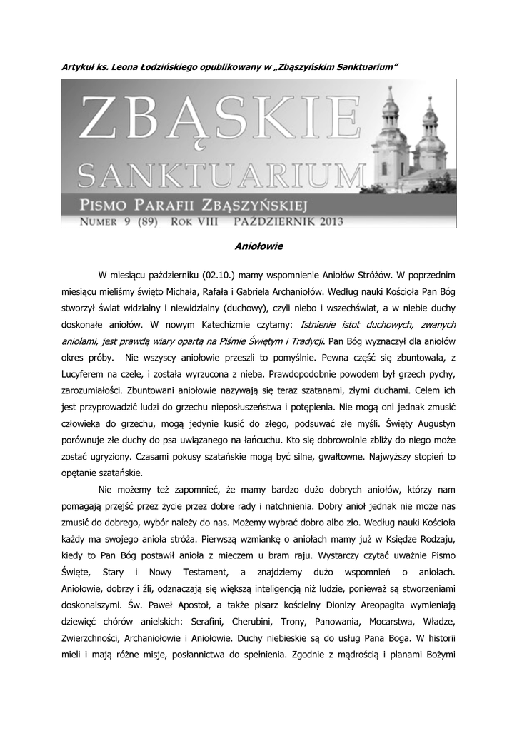 Artykuł ks. Leona Łodzińskiego opublikowany w „Zbąszyńskim Sanktuarium” Aniołowie W miesiącu październiku (02.10.) mamy wspomnienie Aniołów Stróżów. W poprzednim miesiącu mieliśmy święto Michała, Rafała i Gabriela Archaniołów. Według nauki Kościoła Pan Bóg stworzył świat widzialny i niewidzialny (duchowy), czyli niebo i wszechświat, a w niebie duchy doskonałe aniołów. W nowym Katechizmie czytamy: Istnienie istot duchowych, zwanych aniołami, jest prawdą wiary opartą na Piśmie Świętym i Tradycji. Pan Bóg wyznaczył dla aniołów okres próby. Nie wszyscy aniołowie przeszli to pomyślnie. Pewna część się zbuntowała, z Lucyferem na czele, i została wyrzucona z nieba. Prawdopodobnie powodem był grzech pychy, zarozumiałości. Zbuntowani aniołowie nazywają się teraz szatanami, złymi duchami. Celem ich jest przyprowadzić ludzi do grzechu nieposłuszeństwa i potępienia. Nie mogą oni jednak zmusić człowieka do grzechu, mogą jedynie kusić do złego, podsuwać złe myśli. Święty Augustyn porównuje złe duchy do psa uwiązanego na łańcuchu. Kto się dobrowolnie zbliży do niego może zostać ugryziony. Czasami pokusy szatańskie mogą być silne, gwałtowne. Najwyższy stopień to opętanie szatańskie. Nie możemy też zapomnieć, że mamy bardzo dużo dobrych aniołów, którzy nam pomagają przejść przez życie przez dobre rady i natchnienia. Dobry anioł jednak nie może nas zmusić do dobrego, wybór należy do nas. Możemy wybrać dobro albo zło. Według nauki Kościoła każdy ma swojego anioła stróża. Pierwszą wzmiankę o aniołach mamy już w Księdze Rodzaju, kiedy to Pan Bóg postawił anioła z mieczem u bram raju. Wystarczy czytać uważnie Pismo Święte, Stary i Nowy Testament, a znajdziemy dużo wspomnień o aniołach. Aniołowie, dobrzy i źli, odznaczają się większą inteligencją niż ludzie, ponieważ są stworzeniami doskonalszymi. Św. Paweł Apostoł, a także pisarz kościelny Dionizy Areopagita wymieniają dziewięć chórów anielskich: Serafini, Cherubini, Trony, Panowania, Mocarstwa, Władze, Zwierzchności, Archaniołowie i Aniołowie. Duchy niebieskie są do usług Pana Boga. W historii mieli i mają różne misje, posłannictwa do spełnienia. Zgodnie z mądrością i planami Bożymi dobrzy aniołowie już zgrzeszyć, obrazić Pana Boga, a źli aniołowie nie mogą się nawrócić. Nasz anioł stróż na pewno nam pomoże na naszej drodze do wieczności, jeżeli chcemy skorzystać z jego posługi. Starajmy się przynajmniej raz dziennie odmawiać tę piękną modlitwę: Aniele Boży Stróżu mój Ty zawsze przy mnie stój, Rano, wieczór, we dnie, w nocy Bądź mi zawsze ku pomocy, Strzeż mnie od wszystkiego złego I doprowadź do żywota wiecznego. Amen. Dodatek: Król Polski Stefan Batory, a może Jan Sobieski (w tej chwili nie mam możliwości sprawdzić) odwiedził pewnego dnia szkołę chłopców. Zapytał uczniów: A ty żaczku utrapiony, do nauki przeznaczony, powiedz co jest dziesięć. Uczniowie kolejno odpowiadali: Dziesięć Boskich jest przykazań. Dziewięć Chórów jest anielskich. Osiem mamy błogosławieństw. Siedem Sakramentów świętych. Sześć stągwi było w Kanie. Pięć ran cierpiał Pan. Cztery Listy Ewangelisty. Trzy Osoby w Trójcy Świętej. Dwie Tablice Mojżeszowe. Jeden Syn Maryi, co króluje w niebie, A na ziemi pan. Opracował ks. Leon Łodziński