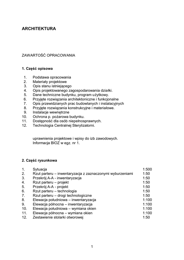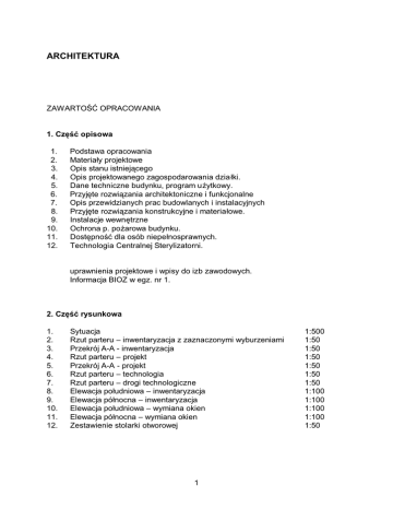 ARCHITEKTURA ZAWARTOŚĆ OPRACOWANIA 1. Część opisowa 1. 2. 3. 4. 5. 6. 7. 8. 9. 10. 11. 12. Podstawa opracowania Materiały projektowe Opis stanu istniejącego Opis projektowanego zagospodarowania dzia łki. Dane techniczne budynku, program użytkowy. Przyjęte rozwiązania architektoniczne i funkcjonalne Opis przewidzianych prac budowlanych i instalacyjnych Przyjęte rozwiązania konstrukcyjne i materiałowe. Instalacje wewnętrzne Ochrona p. pożarowa budynku. Dostępność dla osób niepełnosprawnych. Technologia Centralnej Sterylizatorni. uprawnienia projektowe i wpisy do izb zawodowych. Informacja BIOZ w egz. nr 1. 2. Część rysunkowa 1. 2. 3. 4. 5. 6. 7. 8. 9. 10. 11. 12. Sytuacja Rzut parteru – inwentaryzacja z zaznaczonymi wyburzeniami Przekrój A-A - inwentaryzacja Rzut parteru – projekt Przekrój A-A - projekt Rzut parteru – technologia Rzut parteru – drogi technologiczne Elewacja południowa – inwentaryzacja Elewacja północna – inwentaryzacja Elewacja południowa – wymiana okien Elewacja północna – wymiana okien Zestawienie stolarki otworowej 1 1:500 1:50 1:50 1:50 1:50 1:50 1:50 1:100 1:100 1:100 1:100 1:50 1. PODSTAWA OPRACOWANIA. Podstawę opracowania stanowią: - - - umowa z dnia 30.05.2008 r., obejmująca zlecenie wykonania prac projektowych pt. „Przebudowa istniejących pomieszczeń sterylizatorni i magazynu bielizny wraz z instalacjami w celu dostosowania do obecnie obowi ązujących przepisów prawa.” ustalenia dotyczące oczekiwań funkcjonalnych, przekazane przez Zamawiającego. Dz. U. z 2006 r., Nr 213, poz. 1568 - Rozporządzenie Ministra Zdrowia i Opieki Społecznej z dnia 10 listopada 2006; w sprawie wymagań, jakim powinny odpowiadać pod względem fachowym i sanitarnym pomieszczenia i urządzenia zakładu opieki zdrowotnej, Ustawa z dnia 30 sierpnia 1991r. o zakładach opieki zdrowotnej – obwieszczenie Marszałka Sejmu RP z dnia 08 stycznia 2007 w sprawie ogłoszenia jednolitego tekstu ustawy o zakładach opieki zdrowotnej – Dz. U. Nr 14, poz. 89 2. MATERIAŁY PROJEKTOWE. - inwentaryzacja architektoniczno-budowlana przedmiotowej części budynku, wykonana do celów projektowych. „Projekt ideowy punktu sterylizacyjnego”, wykonany przez in żyniera Jiri Zatloukal z firmy BMT Kraków propozycja wyposażenia Centralnej Sterylizatorni – przygotowana przez firmę Spółdzielnia Mechaników SMS z Warszawy wytyczne przekazane przez Zamawiającego. przepisy prawa budowlanego i normy branżowe. 2 3. OPIS STANU ISTNIEJĄCEGO. Przedmiotowa sterylizatornia zajmuje obecnie pomieszczenia parteru dawnej pralni adaptowane w roku 2004 na potrzeby punktu sterylizacyjnego, pozosta łą część pomieszczeń parteru zajmują magazyny bielizny. Budynek w którym zlokalizowano punkt sterylizacyjny posiada dwie kondygnacje nadziemne i jest w ca łości podpiwniczony. Budynek kryty jest stropodachem. Do budynku prowadzi sze ść niezależnych wejść, w tym pięć pozwala dostać się do części parterowej natomiast szóste prowadzi do klatki schodowej stanowi ącej komunikację pionową budynku – poza opracowaniem. Ze względu na istniejący układ funkcjonalny budynku zdecydowano o dokonaniu prac pozwalających na pełne dostosowanie istniejącego obiektu na potrzeby Centralnej Sterylizatorni spe łniającej wszystkie wymagania stawiane takim obiektom przez obowiązujące przepisy prawa. Obecnie funkcjonujący punkt sterylizacyjny nie spełnia wielu wymogów formalnych jak i funkcjonalnych. Również część przeznaczona na magazyny bielizny wymaga prac dostosowawczych. Obecnie funkcjonujący punkt sterylizacyjny nie posiada możliwości używania wózków transportowych ze względu na brak pomieszczenia przeznaczonego do ich mycia i przechowywania. Brak równie ż wymaganej przepisami ubikacji przy śluzie stanowiącej łącznik pomiędzy częścią brudną i czystą. Dodatkowo w punkcie sterylizacyjnym funkcjonuje tylko jeden sterylizator a obecne przepisy wymagają zastosowania co najmniej dwóch sterylizatorów parowych. Przedmiotem niniejszego opracowania jest przeprojektowanie pomieszcze ń Centralnej Sterylizatorni i magazynów bielizny celem dostosowania do obecnie obowiązujących przepisów. 4. OPIS PROJEKTOWANEGO ZAGOSPODAROWANIA DZIAŁKI. Nie przewiduje się zmiany zagospodarowania działki. 5. DANE TECHNICZNE ODDZIAŁU ISTNIEJĄCY PROGRAM FUNKCJONALNO-UŻYTKOWY-STAN ISTNIEJĄCY Nr pom. Przeznaczenie pomieszczenia 1. 2. 3. 4. 5. 6. 7. Powierzchnia [m2] przedsionek przyjęcie i przygotowanie materiału przedsionek magazyn śluza przygotowanie pakietów magazyn sterylny śluza 3,22 9,85 3,81 3,08 22,63 10,24 2,54 3 8. 9. 10. 11. 12. 13. 14. 15. 16. 17. wydawanie przedsionek magazynek pomieszczenie pakietowania bielizny pomieszczenie techniczne magazyn bielizny czystej pomieszczenie klatka schodowa magazyn bielizny brudnej magazyn bielizny brudnej RAZEM 2,80 2,81 2,28 54,68 13,48 3,59 78,59 12,78 20,00 9,58 255,96 PROJEKTOWANY PROGRAM FUNKCJONALNO – UŻYTKOWY Powierzchnia 2 [m ] Nr pom. Przeznaczenie pomieszczenia 1. 2. 3. 4. 5. 6. 7. 8. 9. 10. 11. 12. 13. 14. 15. 16. 17. 18. 19. 20. 21. 22. 23. 24. 25. 26. 27. 28. 29. 30. przedsionek część brudna odbiór materiału do sterylizacji mycie, sortowanie, dezynfekcja wstępna magazyn chemii+natrysk ratunkowy pomieszczenie porządkowe WC przy śluzie śluza fartuchowo - umywalkowa magazyn tekstyliów do sterylizacji pakietowanie tekstyliów do sterylizacji pakietowanie materiałów do sterylizacji sterylizatory parowe sterylizacja gazowa śluza fartuchowo - umywalkowa magazyn sterylny wydawanie sterylnych odbiór sterylnych przedsionek część sterylna mycie wózków transportowych suszenie, magazyn czystych wózków transportowych pomieszczenie techniczne przedsionek część socjalna szatnia personelu węzeł sanitarny personelu pomieszczenie socjalne personelu klatka schodowa magazyn tekstyliów do prania śluza fartuchowo-umywalkowa komunikacja odbiór i magazyn tekstyliów po